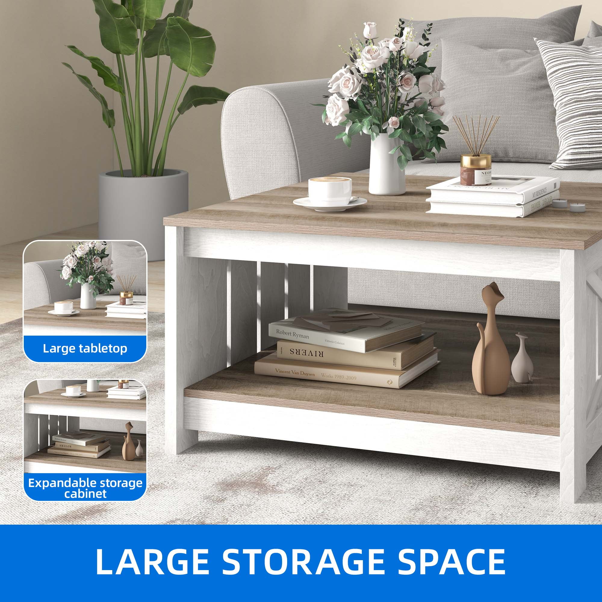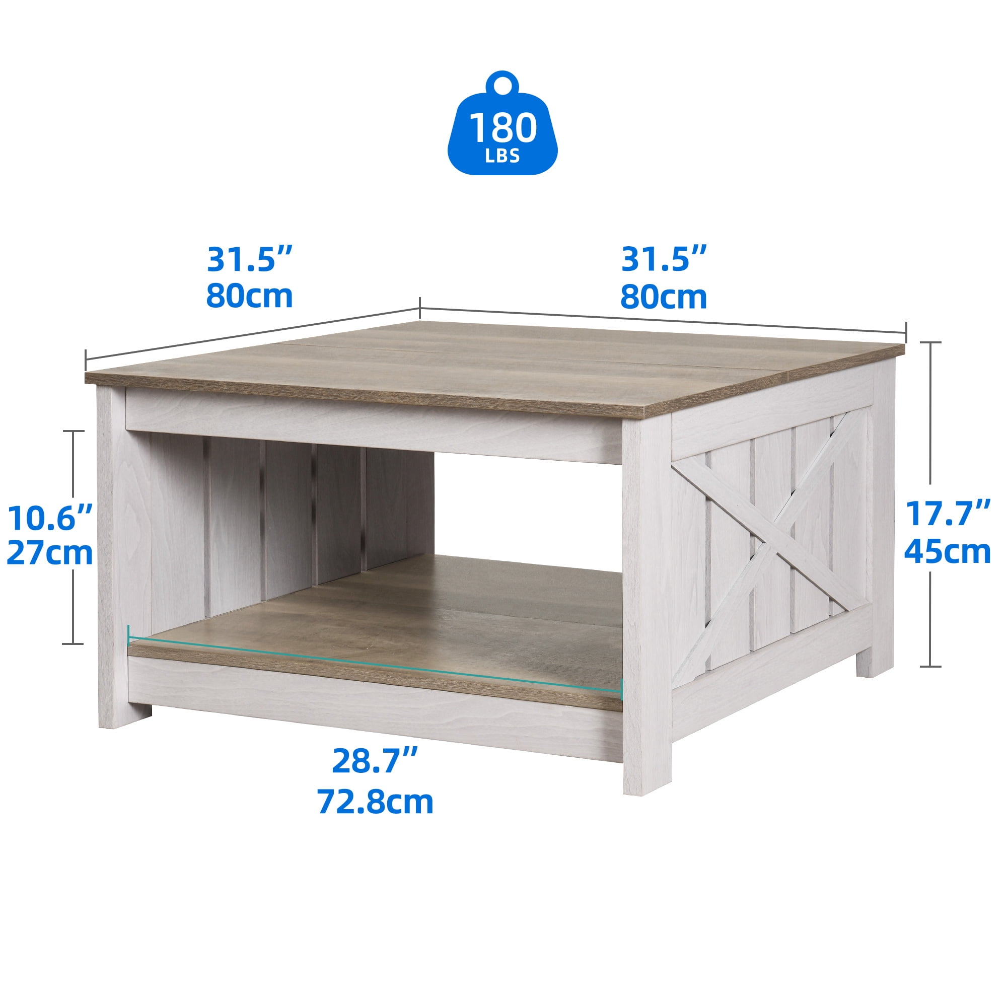 【Modern & Farm Style】- Combining natural grey wash with white, this coffee table adds a unique rustic aesthetic to your room, complementing both modern and rustic decor styles. 【Sturdy & Practical Construction】- Made of durable particle boards, this coffee table can hold up to 180 lbs. The “X” design frame adds sturdiness and farmhouse flair, while adjustable feet protect your floors. 【Double Layers Design】- With its spacious 2-tier design, this coffee table provides ample storage space and can also serve as a workstation, study table, or dining table. The semi-open design allows easy access from both sides. 【Scratch-Proof and Easy to Clean】- The waterproof and scratch-proof wood top of this coffee table is more durable than regular rectangular tables. Simply wipe it with a dry cloth for easy cleaning, reducing your household chores. 【Easy to Assemble】- The Dextrus Coffee Table comes with a detailed manual and all necessary accessories for quick and easy assembly. Table design:Coffee Table Room Type:Living Room, Home Office Style:Modern Material: P2 Particle Board Product Size: 31.5” L×31.5” W×17.7” H Max Load Capacity: 180 lbs 1x Coffee Table 1x Installation Manual 1 x Accessory Package