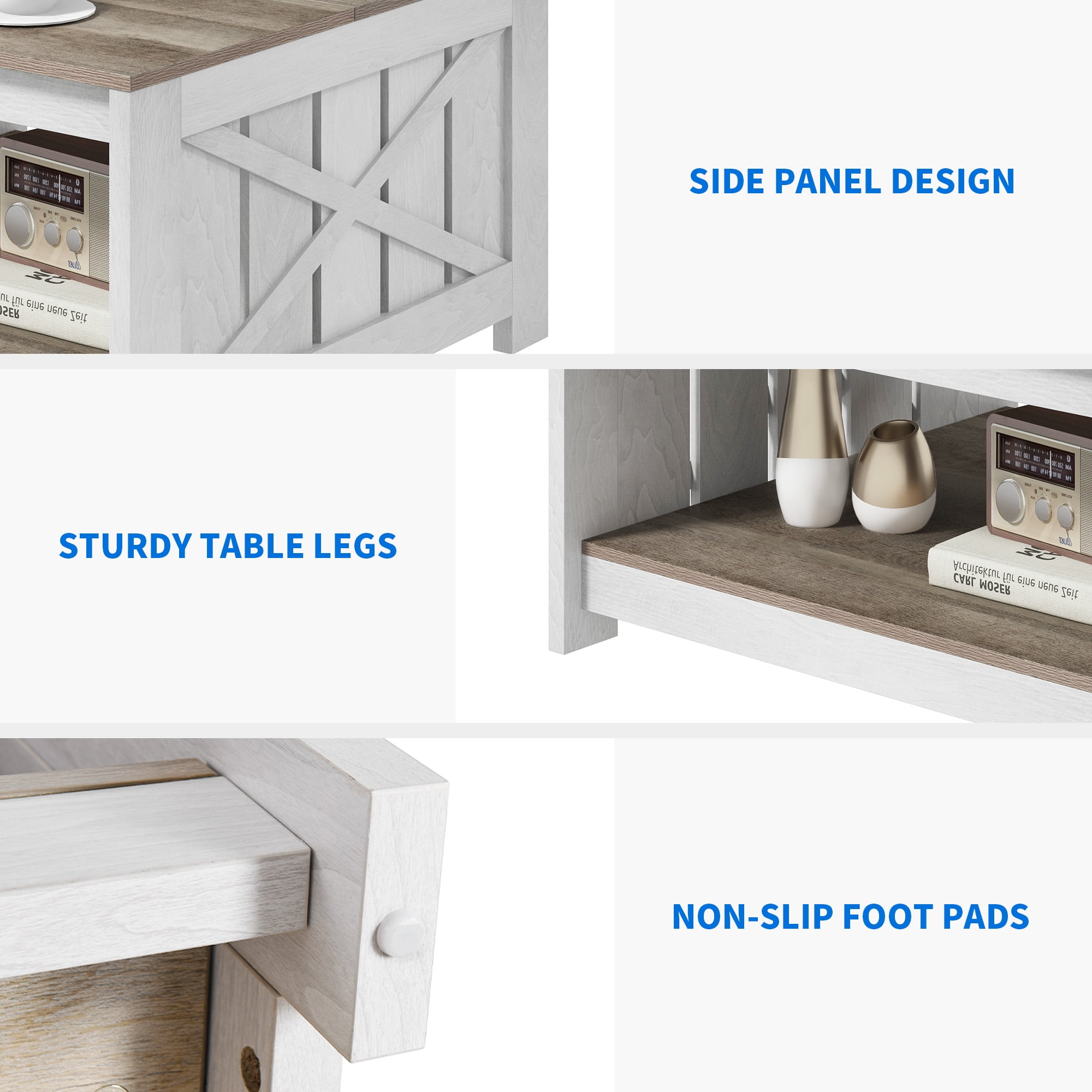 Sturdy Wooden Construction The stable frame consists of thick well-made boards, featuring excellent weight capacity of 180 lbs and ensures better durability. Storage Space Open and half-open storage spaces allow you to freely display or store items. Ideal for living room, study, bedroom, etc. Dirt-proof Tabletop The Dark Gray color veneer makes the tabletop easy to clean, saving you much time on cleaning. Adjustable Feet Pads Not only increase coffee table stability when the floor is uneven, but also protect your floor from scratches and prevent coffee tables from sliding.