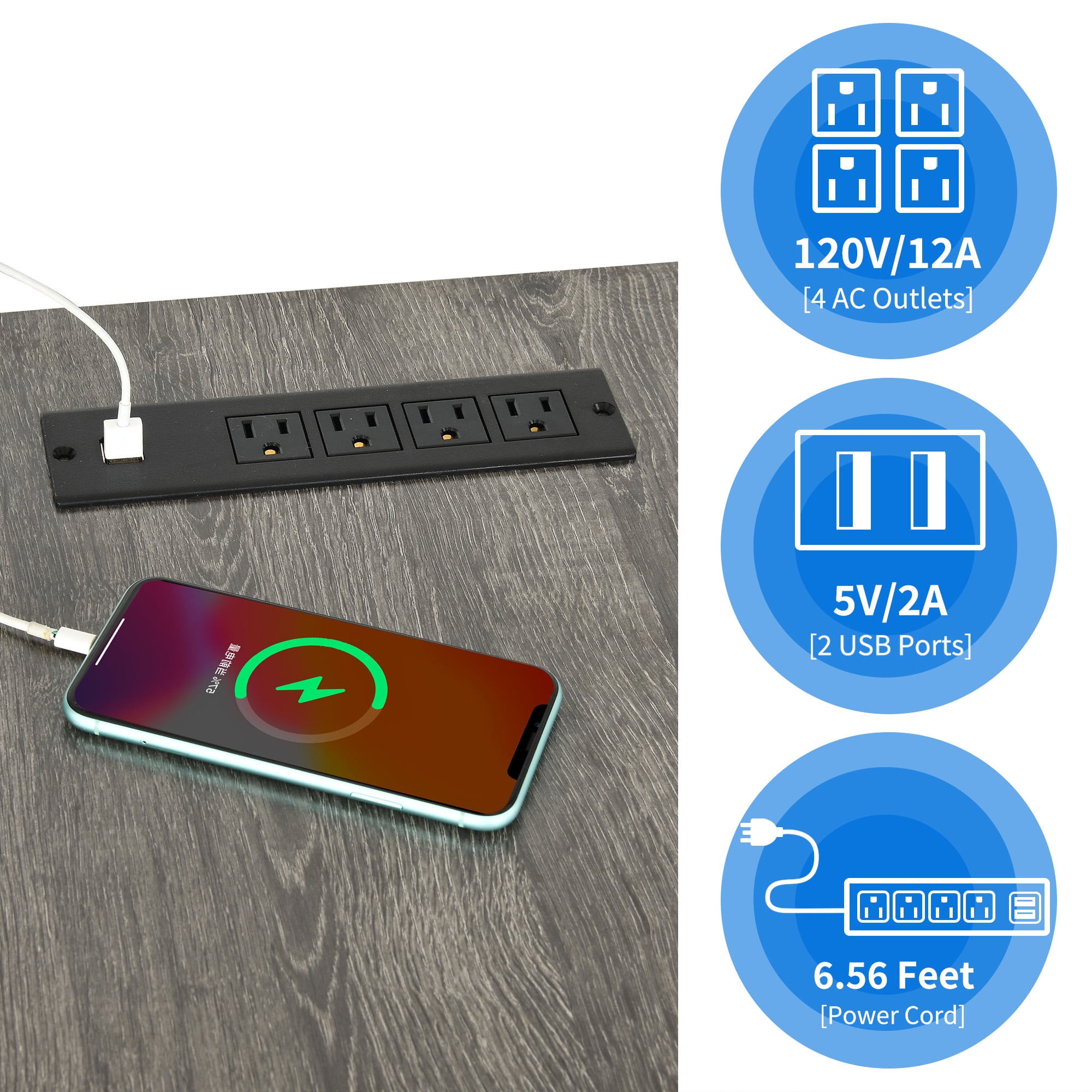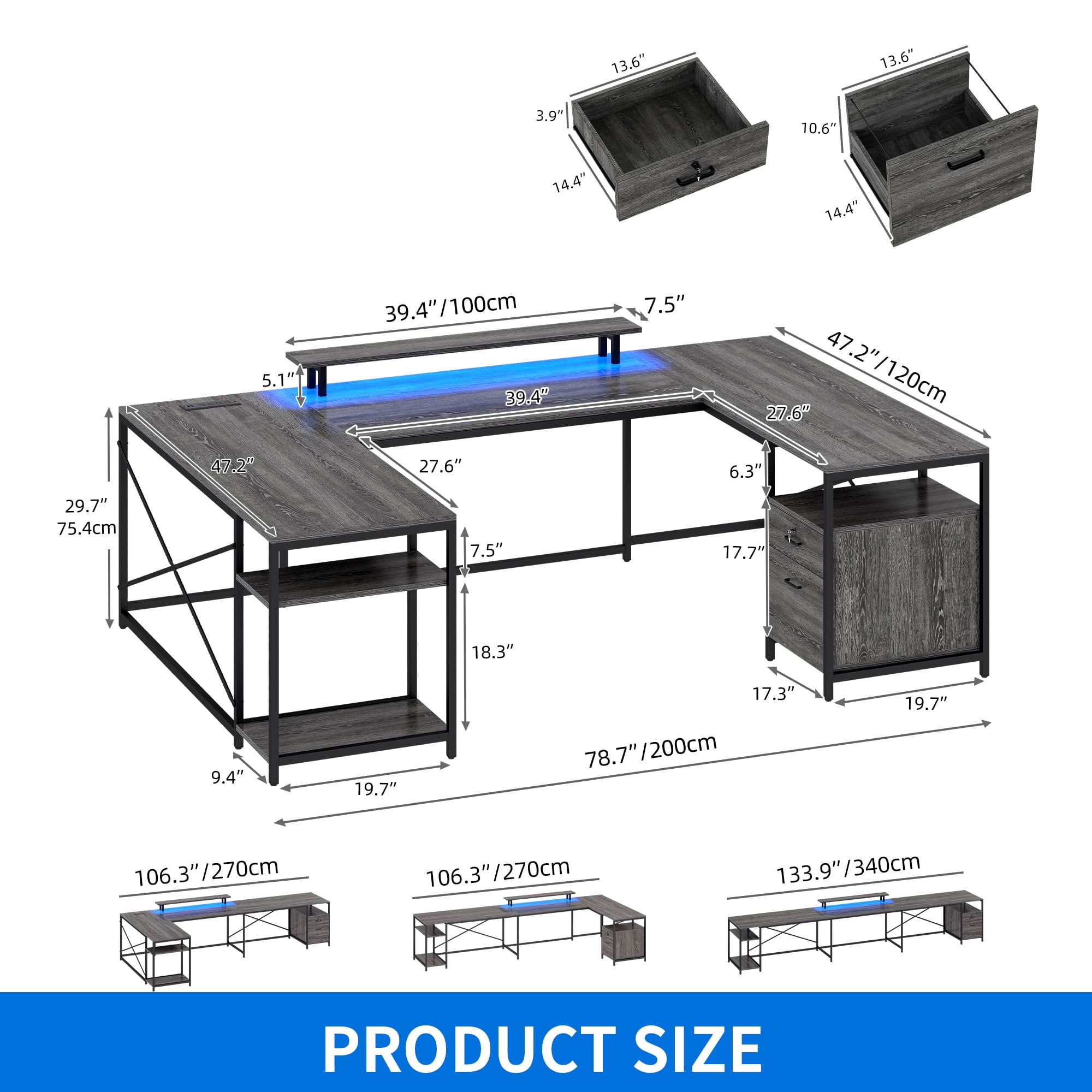 This Computer Desk is designed to enhance your office experience. This Gaming Desk features a built-in charging station with 4 power outlets and 2 USB ports, allowing you to easily charge your laptop, tablet, phone, printer, and other office devices. The LED lights create a cozy and inviting atmosphere while improving productivity. The monitor stand raises your screen, promoting a good posture and reducing strain. With ample storage space, including adjustable hanging bars in the filing drawer for A4 and letter-sized files, you can keep your office essentials organized and easily accessible. This Large Reversible Computer desk combines functionality with comfort, making it a perfect addition to any workspace. Product information: Shape: Semicircular Product Dimensions: 47.2″D x 78.7″W x 34.8″H Special Feature: With Power Outlets & USB Outlets & LED Lights & File Drawer & Reversible Item Weight: 98.11 Pounds Included Components: 1 x U Shaped Desk; 1 x Packet of Fittings; 1 x Instructions Manual; Model Name: Computer Desk Age_group: Adult