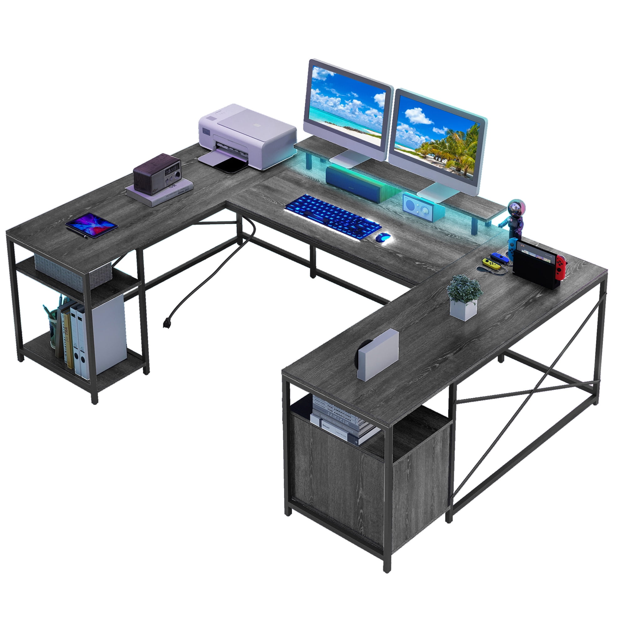 Dextrus Computer Desk with Power Outlets & LED, U Shaped Desk, L Shaped Desk with Drawers, Large Reversible Corner Gaming Desk , Gray
