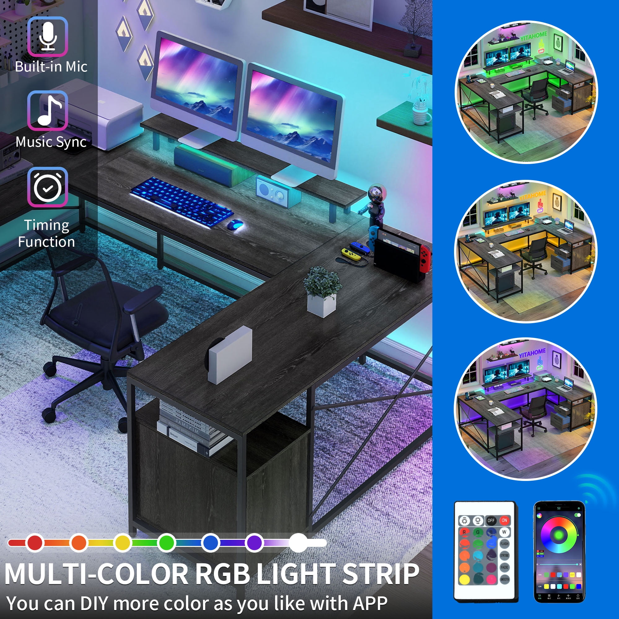EFFORTLESS CHARGING: Power your devices with ease! Our U-shaped desk boasts 4 standard outlets, 2 USB ports, and a 6.56ft cord. Say goodbye to charging hassles for phones, laptops, and more. VIVID ILLUMINATION: Our U-shaped desk showcases a dynamic RGB LED strip. Easily customize colors via a mobile app or remote. Explore music sync and timer modes for an inspiring work atmosphere. ADAPTABLE WORKSPACE: A desk for all needs! Transform it to a 78.7″ U-shaped, 106.3″ L-shaped, or 133.9″ long desk. Ideal for bedrooms, offices, and more, serving as a office computer desk, gaming desk, study desk, writing desk, file cabinet, and printer stand. PRODUCTIVE & ORGANIZED: Our U-shaped desk provides 3 wide desktops with a monitor stand. It also offers a file drawer, small office supplies drawer, and open shelves for easy access to folders, magazines, and more. BUILT TO LAST: Crafted from robust steel and P2 MDF with a scratch-resistant finish, this desk stands up to daily use. 12 adjustable feet pads ensure stability on uneven floors. The rustic brown embossed texture adds style to your workspace. Age_group: Adult