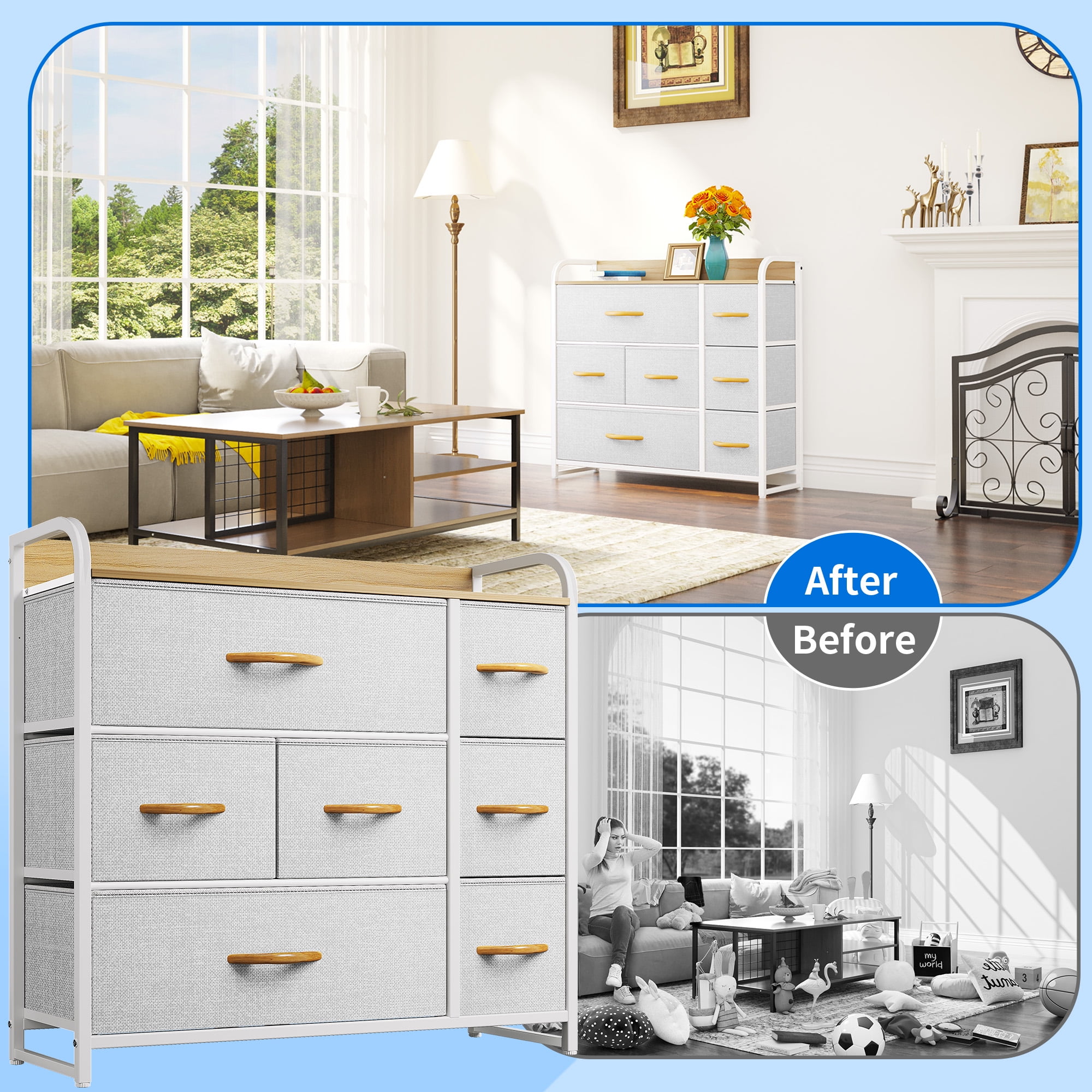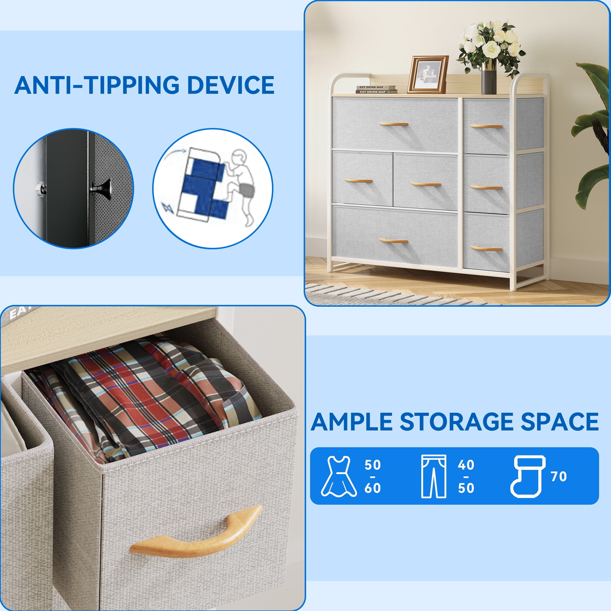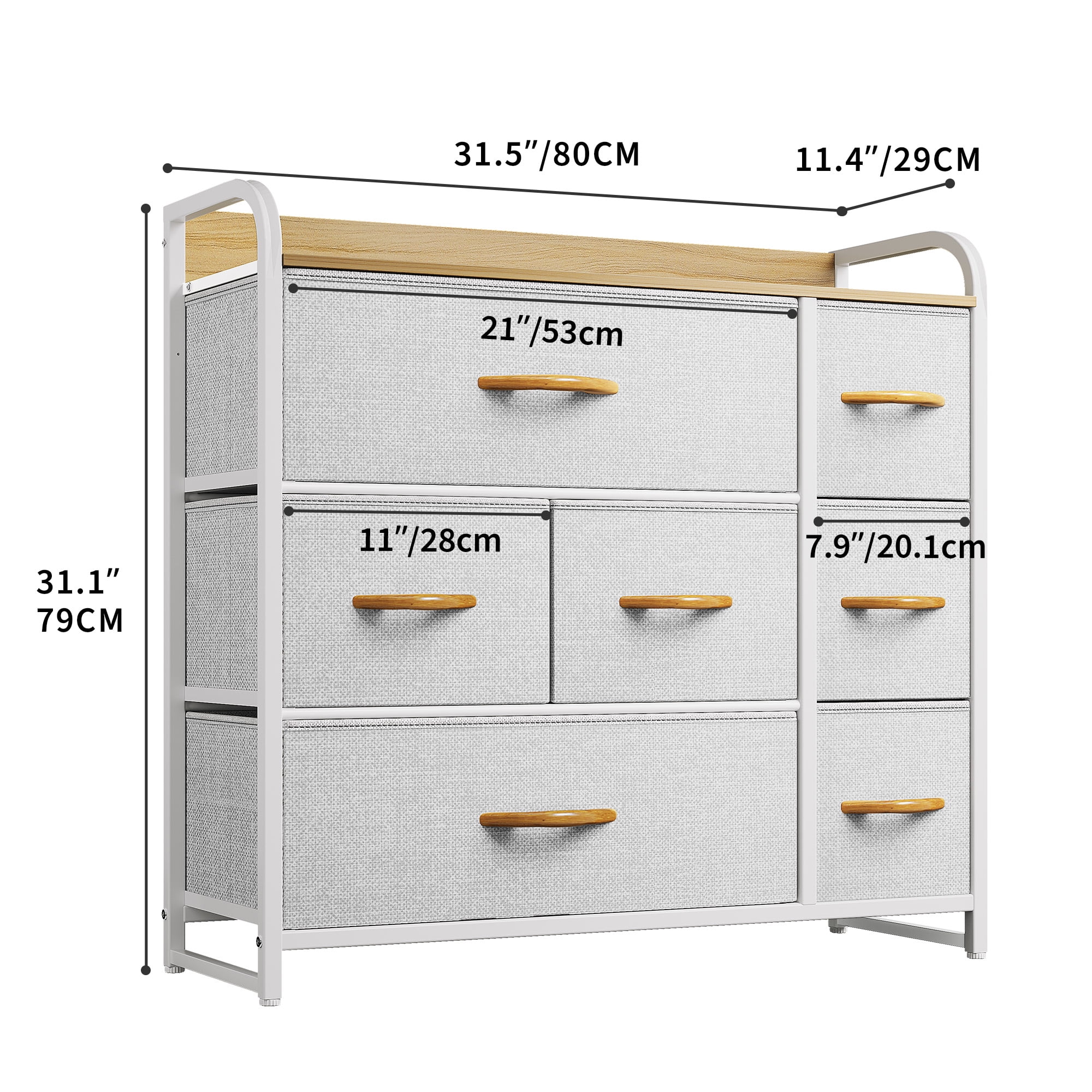 VERSATILE BEDROOM DRESSER- Dextrus fabric dresser is a clean expression that fits right into your bedroom, living room, hallway, entryway, closet ROOMY STORAGE SPACE- The dresser for bedroom can stash dresses, socks, pants, shirts, toys, etc.; Sizeable top grants all the surface area you need to display framed photos, lamps, and potted plants STURDY STORAGE TOWER- Premium MDF wooden top and reliable metal frame lend immense support & extend shelf life; 4 adjustable plastic legs are for scratch protection and stability on uneven ground 7-DRAWER DRESSER- The 7 deep drawers are foldable and removable, with easy-to-pull handles rounding out the design; High quality non-woven synthetic fabric is easy to care SAFE & EASY USE- Overall size: 31.5″ L x 11.4″ W x 31.1″ H, Drawer Dimensions: 21″ L x 11″ W x 7.6″ H / 11″ L x 11″ W x 7.6″ H / 7.9″ L x 11″ W x 7.6″ H; It’s a breeze to assemble the storage unit with instructions included; Recommended to anchor the dresser to the wall for anti-tipping safety