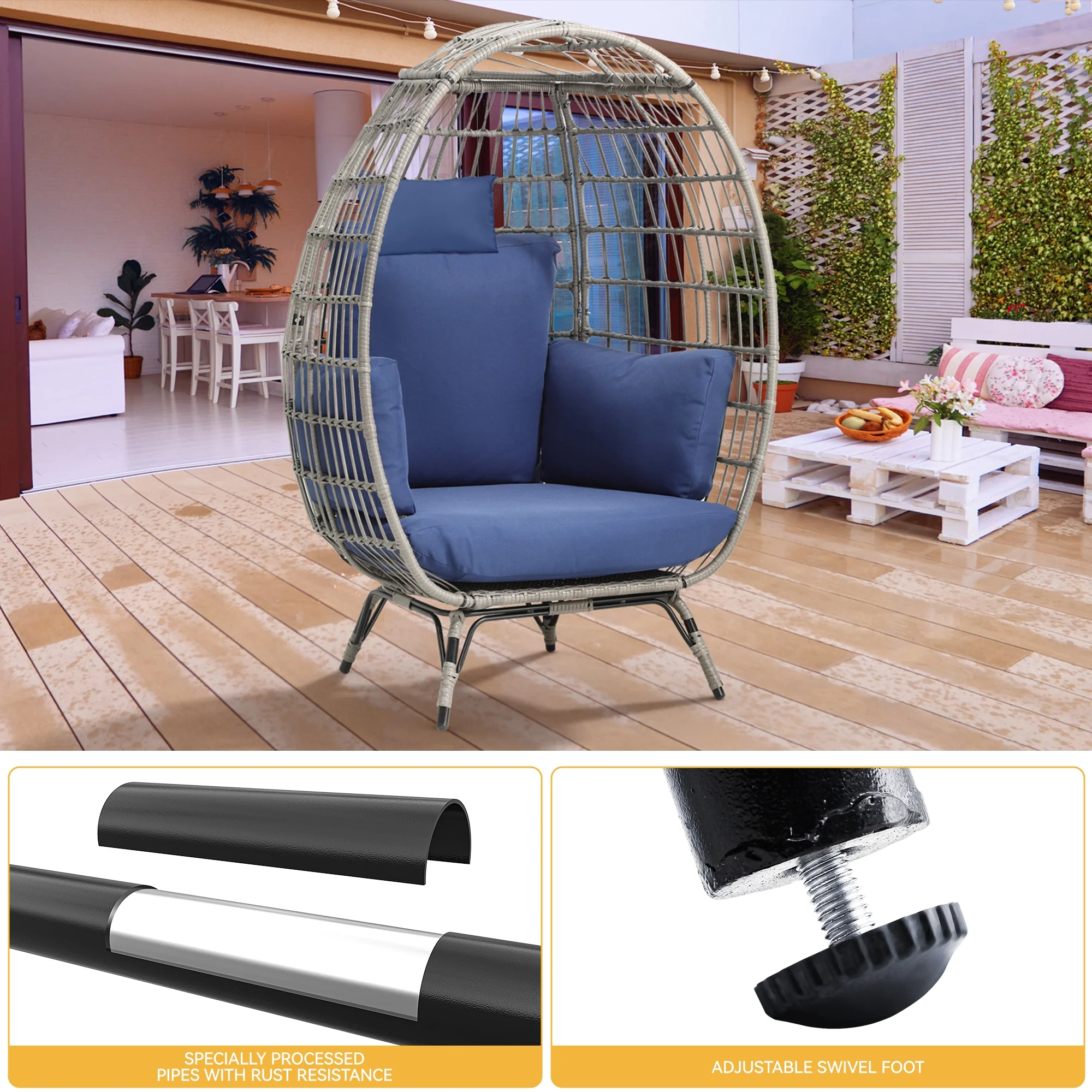 COZY EGG CHAIR: Our egg chair outdoor offers a super soft cloudy cushion. It’s padded with high quantity cotton which embrace you from all sides. Best company as an egg chair with legs when u back from work to enjoy inner peace. HAND-WOVEN PE RATTAN DESIGN- outdoor egg chair with stand made of PE hand-woven rattan, interlocking fashion rattan modern style, waterproof and UV resistant while embellishing your home. HIGH-QUALITY FRAME MATERIAL- The egg chair lounger is made of sprayed iron pipe and PE rattan winding to prevent rusting and coating off, sturdy and stable, can withstand 330lb weight, four support feet have adjustable foot pad design. EASY TO INSTALL AND CLEAN- Hardware and detailed manual are provided to help set up wicker egg chair within 30 minutes. And all cushion covers are removable for easy cleaning and different looks.Great lounge chairs for outside. NOT JUST FOR OUTDOORS – Dextrus egg chairs are truly modern additions for outdoors like garden, porch, patio, pool etc., and they also add an laid-back bohemian grace to your living room, dining room and bedroom.