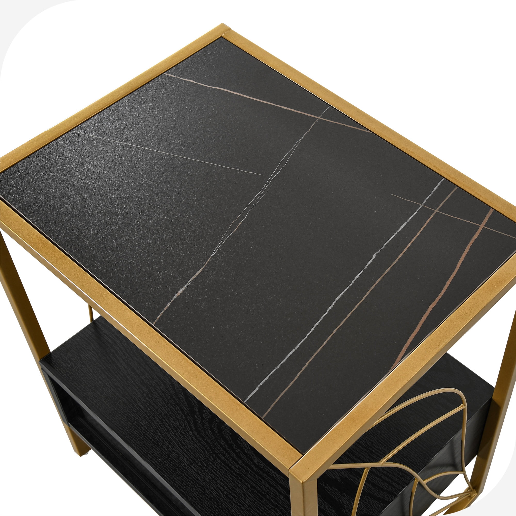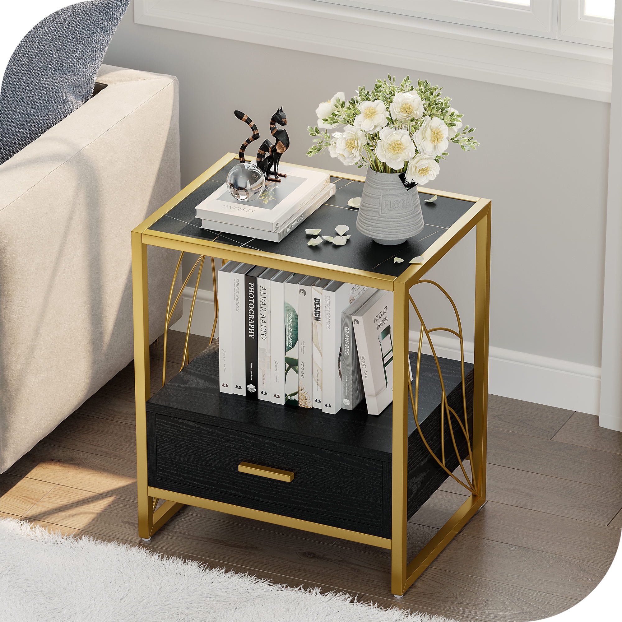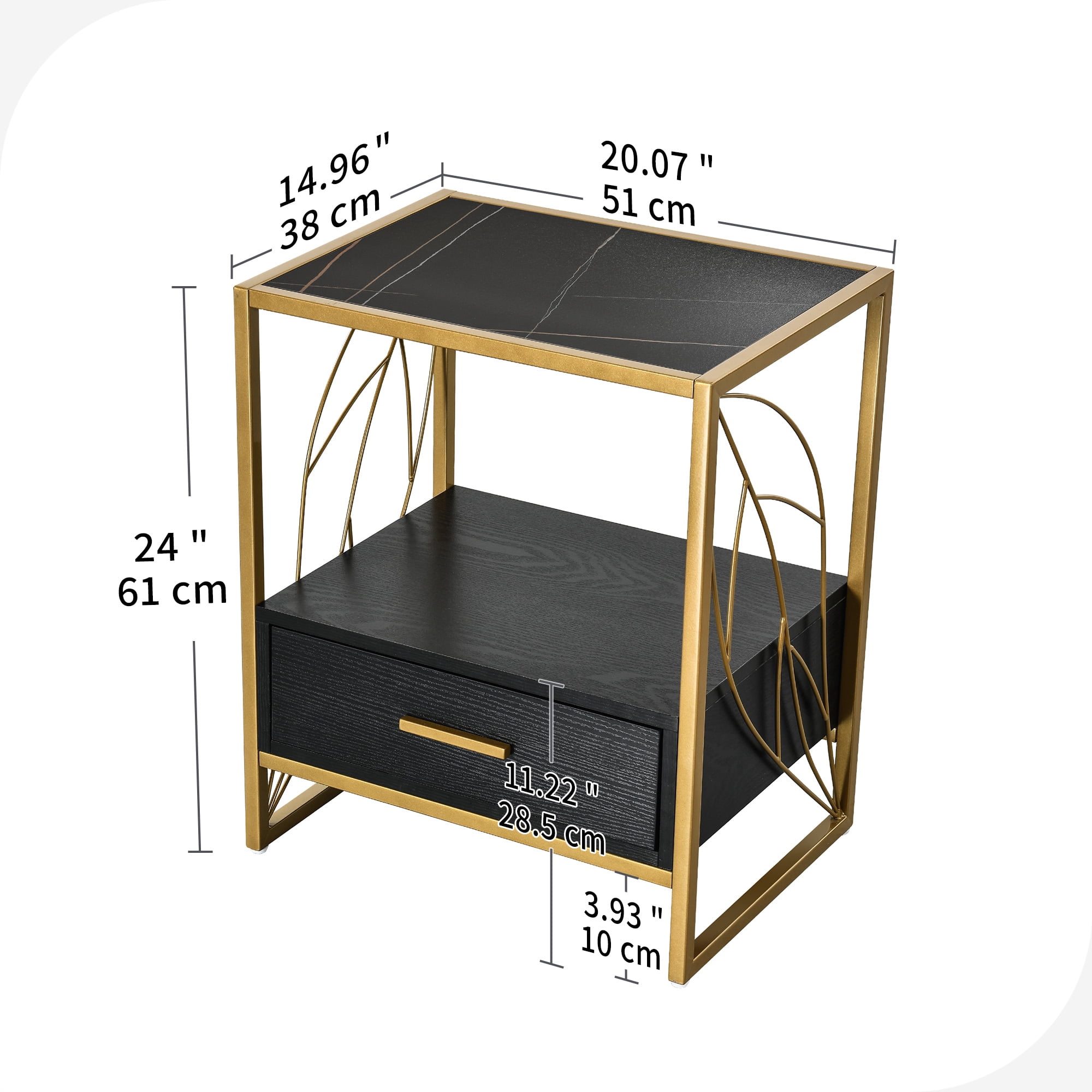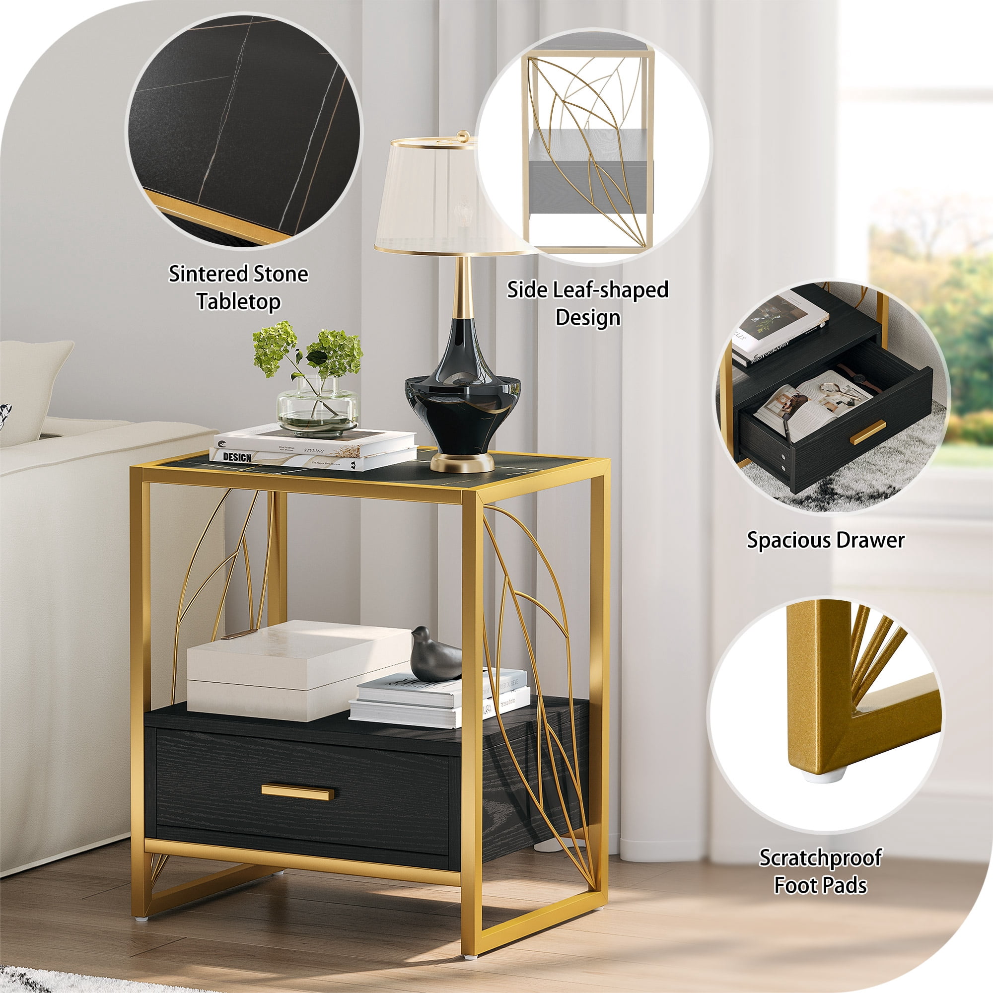 Dextrus End Table with Drawer and Storage Shelf, Modern Nightstand Table Sofa Side Table with Sintered Stone Tabletop and Metal Leaf Shaped Frame for Living Room, Bedroom, Black and Gold