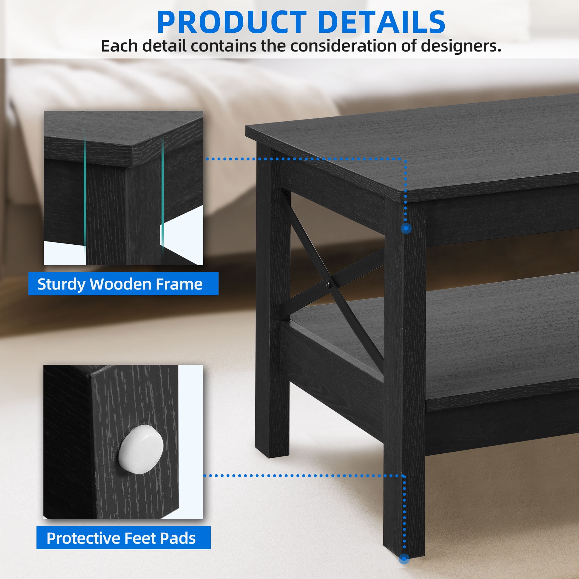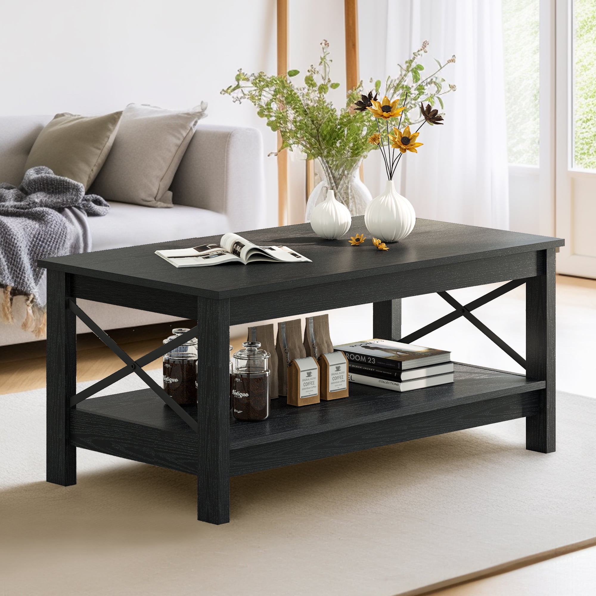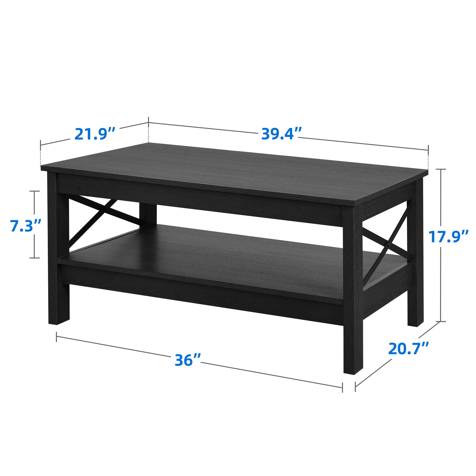 Durable and Spacious Storage: Our black coffee table features 2 shelves, providing ample space for storing daily necessities. The thickened legs enhance durability and stability. Reinforced X-shaped Design: The coffee table with storage has a rustic X-shaped design and non-slip features, ensuring stability and preventing easy movement. It also adds a unique decorative touch to your living room. Minimalist Style: Our black coffee tables have a versatile black finish that complements both rustic and modern room designs. They are suitable for various spaces such as the living room, bedroom, and lounge Scratch-resistant and Easy to Clean: The wood tabletop of our modern coffee table is waterproof and scratch-proof, ensuring long-lasting durability. It is also easy to clean with a damp cloth. Easy Assembly: Our small coffee table is easy to assemble, and the package includes all necessary tools, instructions, and an illustrated user manual. Style: Industrial Table design:Coffee Table Room Type:Living Room Color:Brown Style:Industrial Material: P2 Particle Board Product Size: 39.37” L×21.65” W×17.71” H Product Weight: 49.8 lbs Max Load Capacity: 180 lbs 1x Coffee Table 1x Installation Manual 1 x Accessory Package
