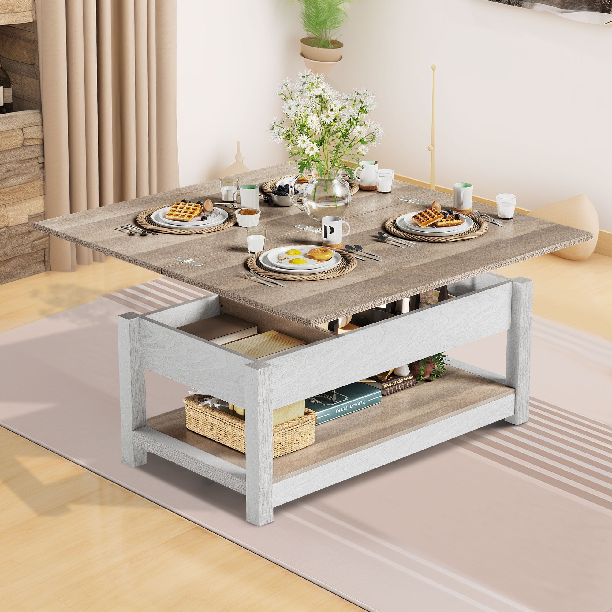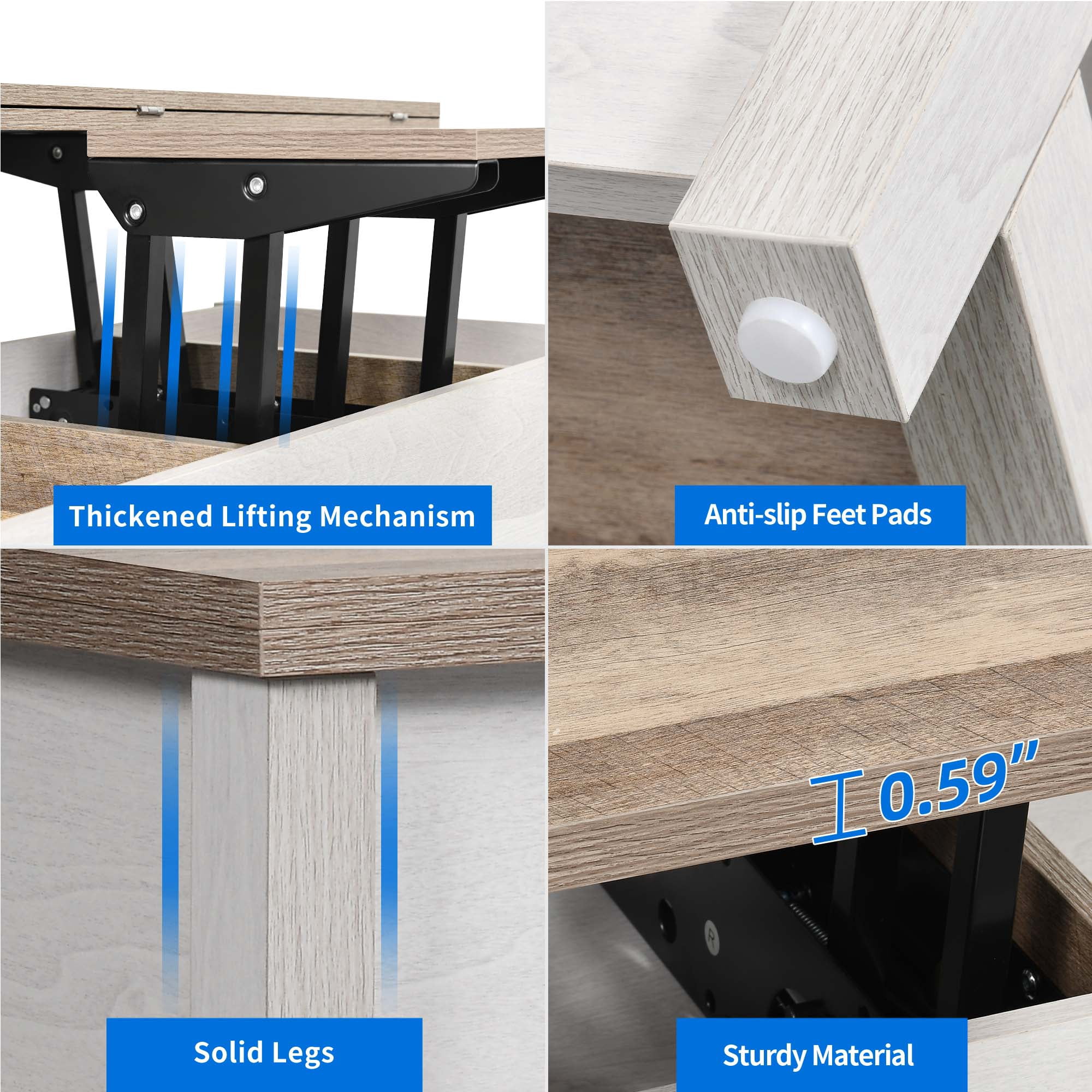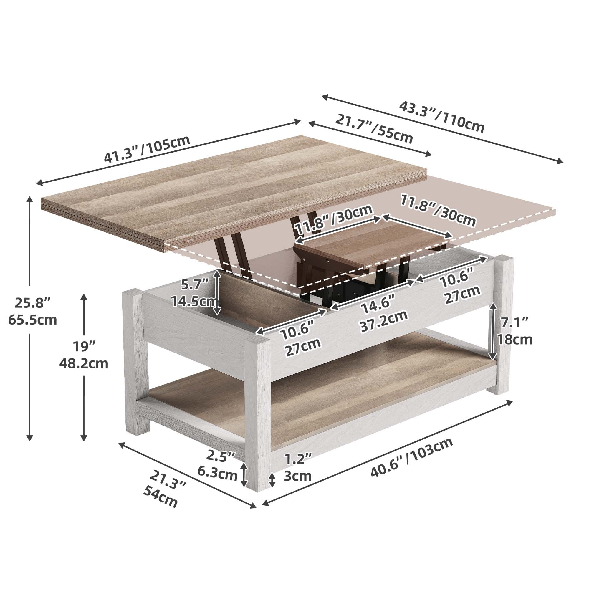 Versatile 3-in-1 Design: This coffee table is incredibly practical with its unique design that meets various needs. It can be easily transformed into three different forms: fully extended for dining or gaming with 4-8 people, semi-extended for computer work or study with 2-3 people, and stowed for item placement. Ample Storage Capacity: With three divided storage compartments, this living room coffee table offers organized storage for blankets, laptops, books, snacks, and more. The open storage space underneath is perfect for everyday items and storage boxes, helping you maintain a beautiful and tidy living room. Strong and Durable Construction: The double top lift is equipped with a robust metal structure that allows for easier raising and lowering compared to traditional compression lifts. It enhances the weight-bearing capacity of the table. Additionally, two safety valves ensure stability and support under high pressure. Non-slip feet keep the coffee table stable, even on carpeted floors. Unique Style and Multifunctionality: With its unique color scheme and minimalist design, this living room table adds a touch of elegance to your space. It serves not only as a coffee table but also as a dining table and a computer desk, making it an excellent choice for small spaces like apartments or dormitories. Easy Assembly: We provide clear and detailed instructions and numbered parts to make assembling this sturdy coffee table a breeze. If you encounter any issues such as damage, scratches, or missing parts upon delivery, our prompt assistance is guaranteed!