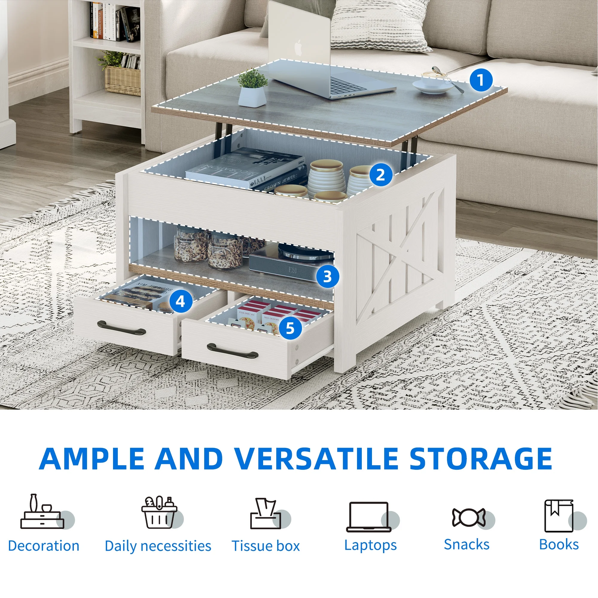 Ample Storage Options: With four drawers, an open compartment, and hidden storage under the countertop, this coffee table provides ample storage space for essentials like books, laptops, and tissues. Keep your living area tidy and organized with this square coffee table. Aesthetic Appeal: Embrace the charm of our farmhouse coffee table, designed to captivate with its vintage style and color palette. The unique side designs elevate its aesthetic appeal, making it a great addition to your living room or bedroom decor. Durability and Quality: Crafted from sturdy boards, this wood coffee table is built to last, ensuring years of reliable use. Smooth slides on the drawers provide a pleasant experience every time you access them. Trust in the superior craftsmanship of this furniture piece for long-lasting enjoyment. Easy Assembly: Assembly is a breeze with clear, detailed instructions and numbered parts included. Our DEXTRUS furniture expert not only delivers exceptional products but also stands ready to address any concerns you may have, ensuring a seamless experience from purchase to setup.