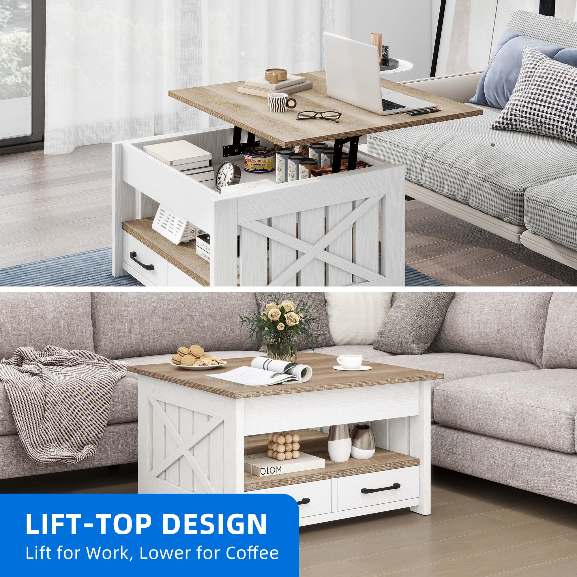 DEXTRUS Farmhouse Lift Top Coffee Table with Shelf and Drawers, Square Center Table for Living Room, Gray Wash