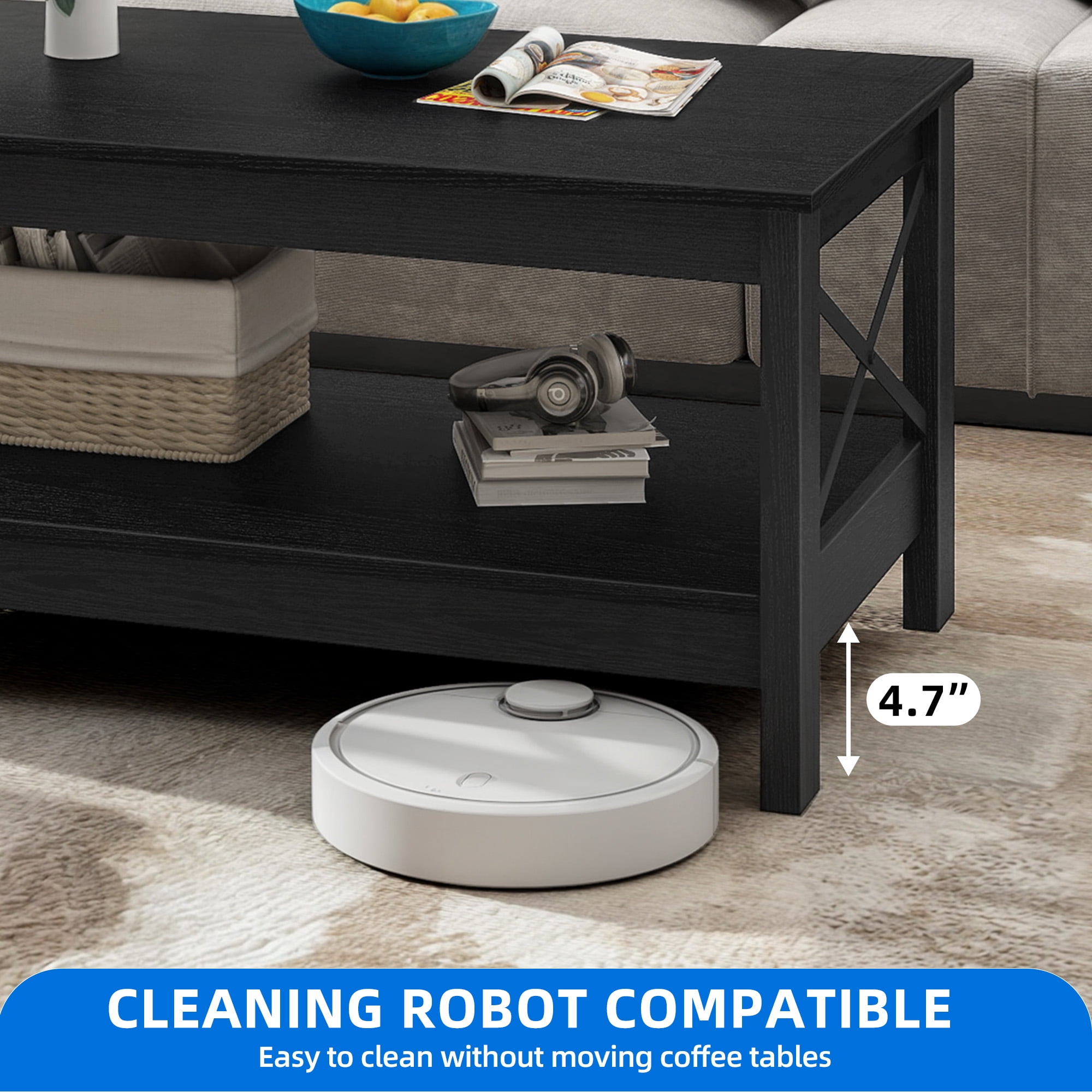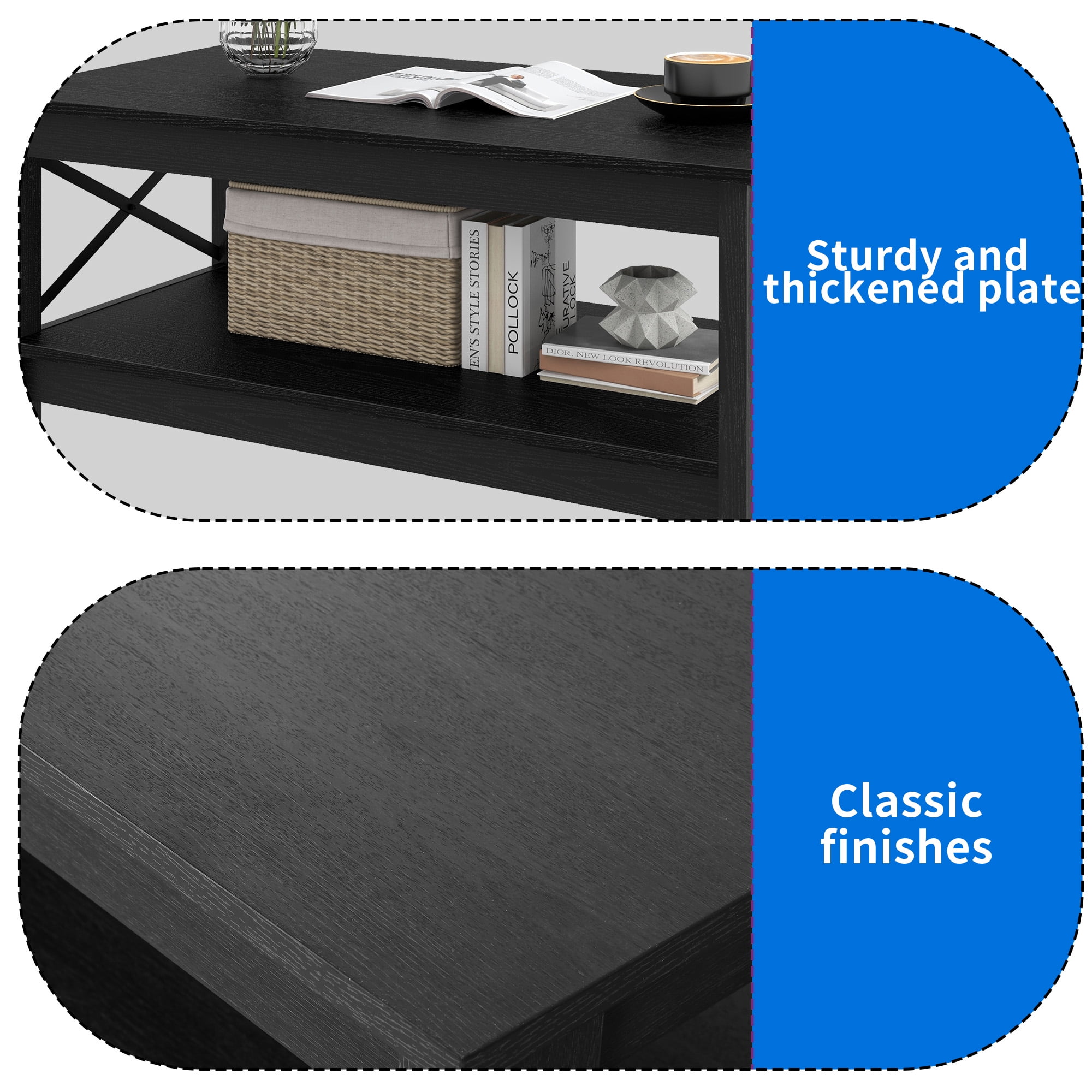 Dextrus Farmhouse Modern Coffee Table with Open Storage Shelf, Black Durable and Spacious Storage: Our black coffee table features 2 shelves, providing ample space for storing daily necessities The thickened legs enhance durability and stability Reinforced X-shaped Design: The coffee table with storage has a rustic X-shaped design and non-slip features, ensuring stability and preventing easy movement It also adds a unique decorative touch to your living room Minimalist Style: Our black coffee tables have a versatile black finish that complements both rustic and modern room designs They are suitable for various spaces such as the living room, bedroom, and lounge Scratch-resistant and Easy to Clean: The wood tabletop of our modern coffee table is waterproof and scratch-proof, ensuring long-lasting durability It is also easy to clean with a damp cloth Easy Assembly: Our small coffee table is easy to assemble, and the package includes all necessary tools, instructions, and an illustrated user manual