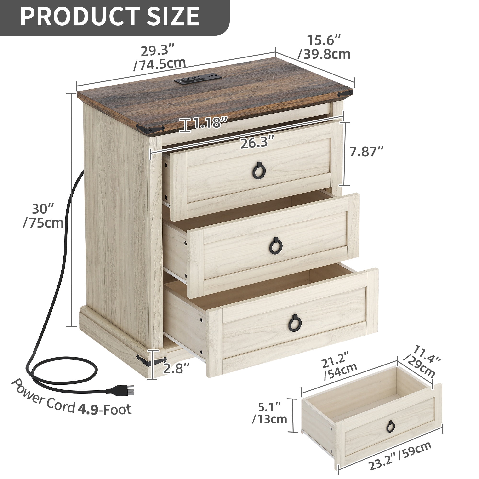 Nature-Inspired Design: The LEAF collection furniture features natural and warm colors, along with wood materials, inspired by leaves and nature. This design aesthetic combines rustic charm with classical architectural aesthetics, offering a practical and nostalgically romantic experience for your living room or bedroom. Sturdy and Durable Construction: The nightstand is made of P2 MDF, ensuring durability and a strong load capacity of up to 30 lbs. It provides stable storage for your daily essentials and comes with all necessary hardware and an illustrated instruction manual for easy assembly. Convenient Charging Station: The nightstand is equipped with 2 AC outlets and 2 USB ports, along with cable management for a 5.9ft long power supply cord. This feature allows you to conveniently charge your phone, tablet, lamp, and other devices while keeping cords organized. Multi-Space Storage: Measuring 29.3″ (W) x 15.6″ (D) x 30″ (H), the nightstand offers a spacious top surface for displaying photos, decorations, and essential items like phones or laptops. Additionally, it features 3 large drawers for storing and organizing books, toys, and other essentials to help maintain a neat and organized room. Age_group: Adult. Easy Installation: Each piece of the nightstand is labeled with a letter or number, and the instructions clearly indicate where each component should go. If you encounter any issues during assembly, you can reach out to the manufacturer for prompt assistance and resolution to ensure your satisfaction.