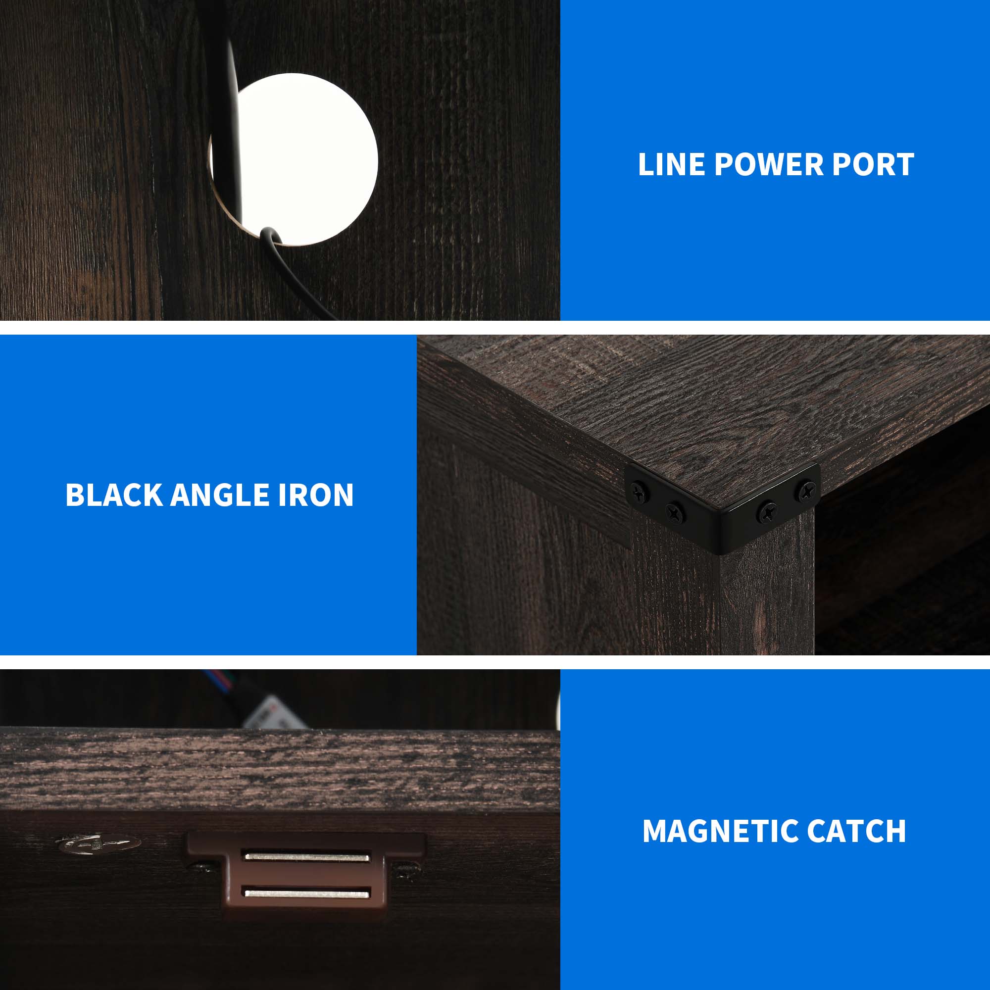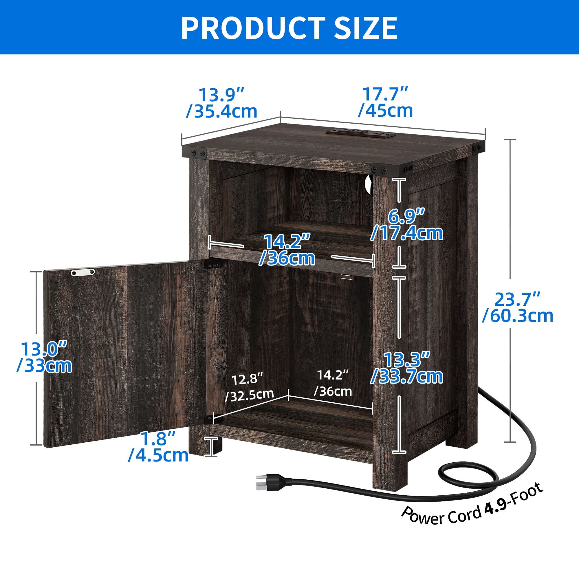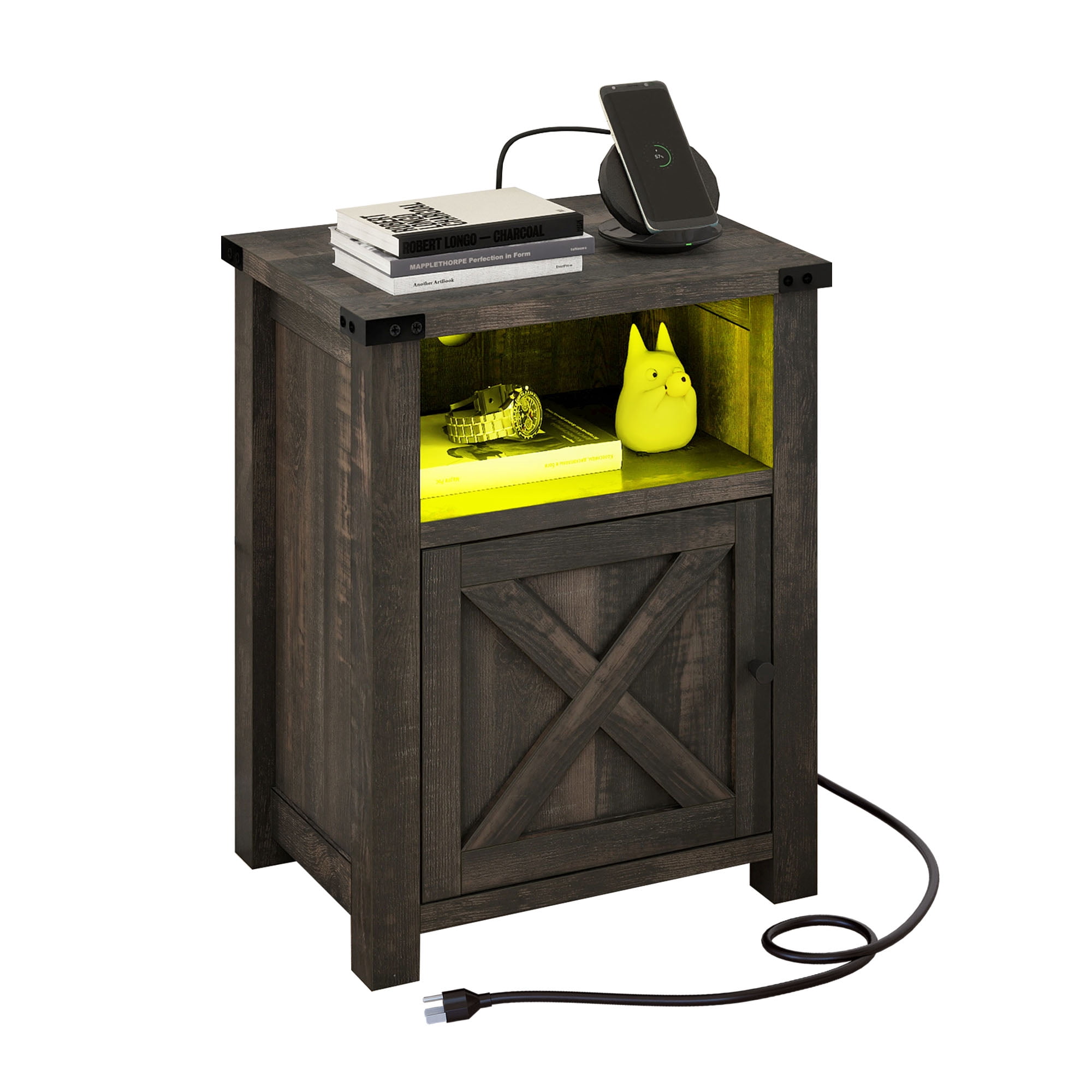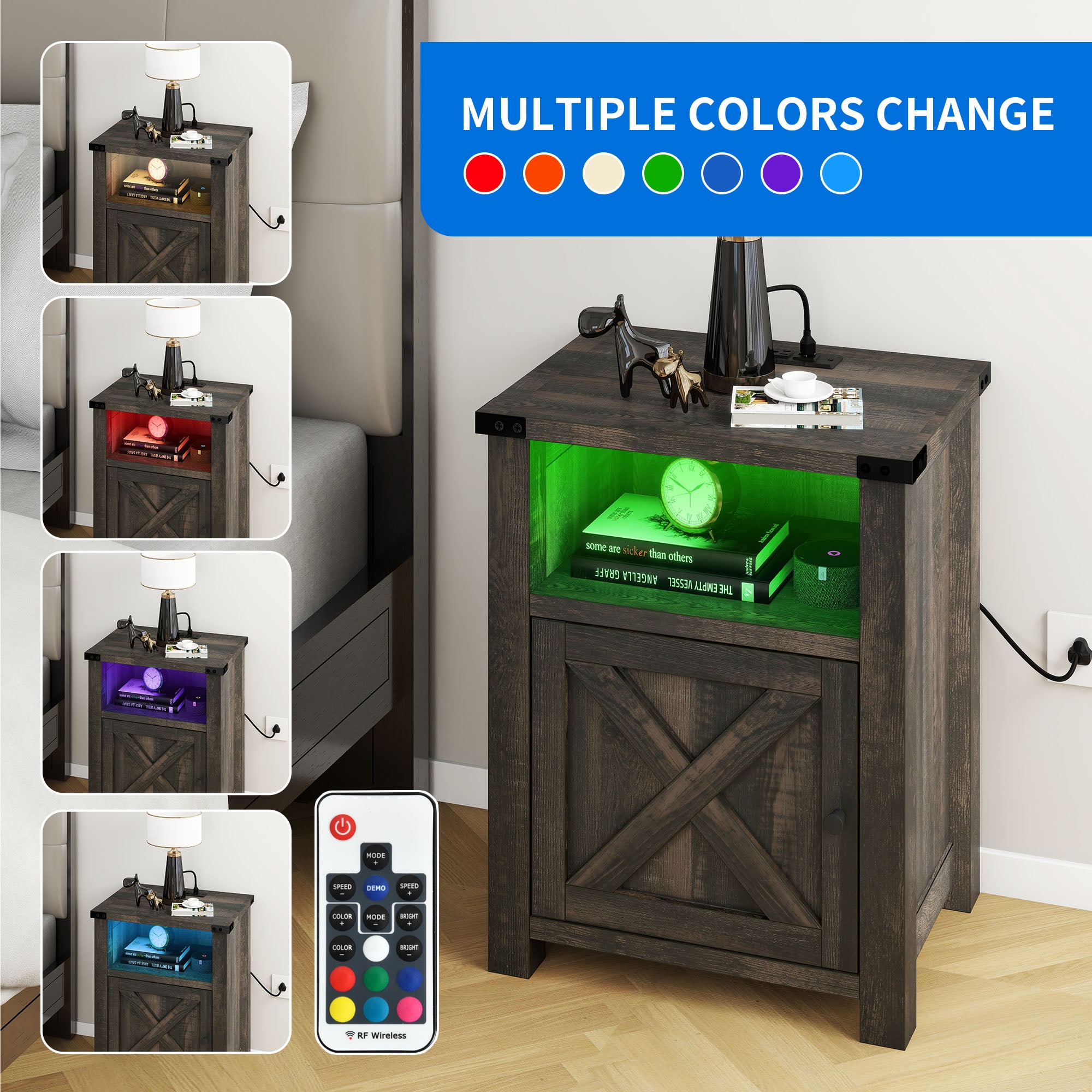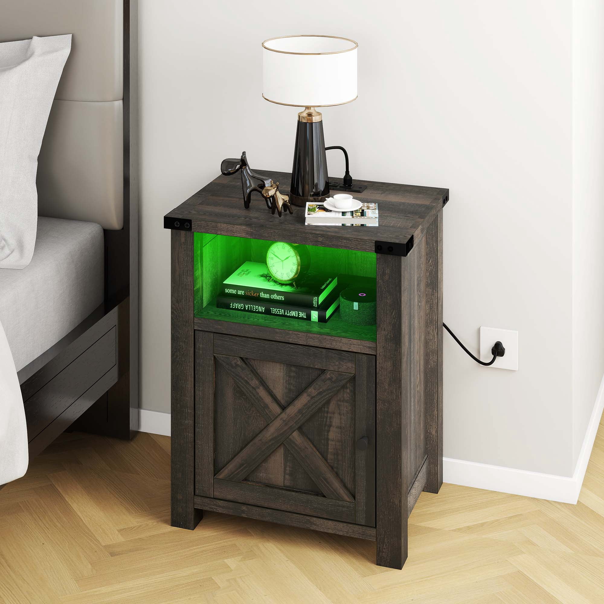 CONVENIENT CHARGING HUB: This wooden farmhouse nightstand ensures you have easy access to power. With 2 USB ports, 2 power outlets, and a generous 4.9 ft power cord, it simplifies charging your phone, laptop, and more. COLORFUL AMBIANCE: Elevate your bedroom experience with dynamic and adjustable RGB LED lighting. With various color modes, speed settings, and brightness control via remote, you can set the right mood for your relaxation. FARMHOUSE CHARM: Infused with original farmhouse dark rustic oak and espresso hues, along with a touch of metal texture and X-designed barn door, this nightstand exudes a special and classic style that complements any room decor. EFFICIENT STORAGE: The storage cabinet discreetly hides away your personal items and daily essentials, keeping your space tidy. The open top and shelf provide easy access to bedside necessities. STEADFAST STABILITY: Crafted from thick MDF, this nightstand with a storage cabinet enhances strong load capacity, ensuring secure storage for your daily essentials. COLORFUL AMBIANCE: Elevate your bedroom experience with dynamic and adjustable RGB LED lighting. With various color modes, speed settings, and brightness control via remote, you can set the right mood for your relaxation. FARMHOUSE CHARM: Infused with original farmhouse dark rustic oak and espresso hues, along with a touch of metal texture and X-designed barn door, this nightstand exudes a special and classic style that complements any room decor. EFFICIENT STORAGE: The storage cabinet discreetly hides away your personal items and daily essentials, keeping your space tidy. The open top and shelf provide easy access to bedside necessities. Age_group: Adult. STEADFAST STABILITY: Crafted from thick MDF, this nightstand with a storage cabinet enhances strong load capacity, ensuring secure storage for your daily essentials.