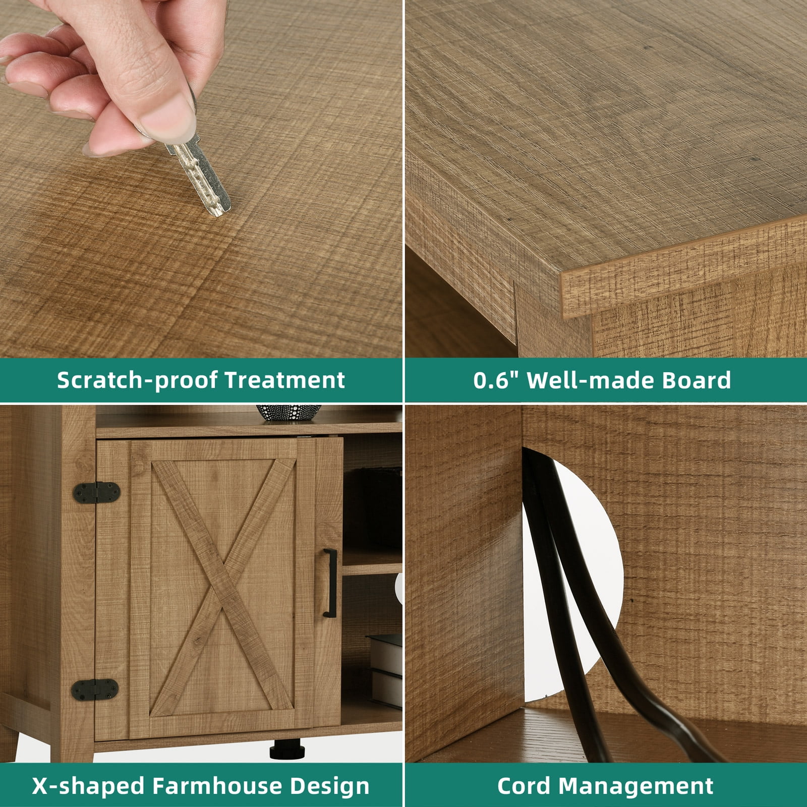 Highboy Style & 2 Top Shelves: With its elevated design and two spacious top shelves, this TV cabinet offers ample space for your TV and additional items. It is specifically designed to accommodate 50/55/60/65 inch TVs. Sturdy and Scratch-proof: Our TV console features added black supporting legs for enhanced stability, ensuring it remains firm and wobble-free. The cabinet top is capable of supporting up to 300 lbs. Made from high-quality P2 MDF and strong metal with a scratch-proof and water-resistant finish, it is built to last. Adjustable Shelf and Cable Management: The middle shelf of this TV console can be adjusted to different heights, allowing you to store various items such as cable boxes, DVD players, and game systems. Additionally, the two cord management ports help keep cables organized and tidy. Barn Style Design: With its double barn doors and X elements, this console table exudes a farmhouse and decorative charm. It seamlessly blends with various room decors, making it an ideal choice for cottage, modern, or industrial-inspired home settings. Rigorous Package Testing: Each TV stand undergoes strict testing before delivery to ensure that you receive an intact package. We provide all necessary accessories and a detailed user manual to make installation easier.