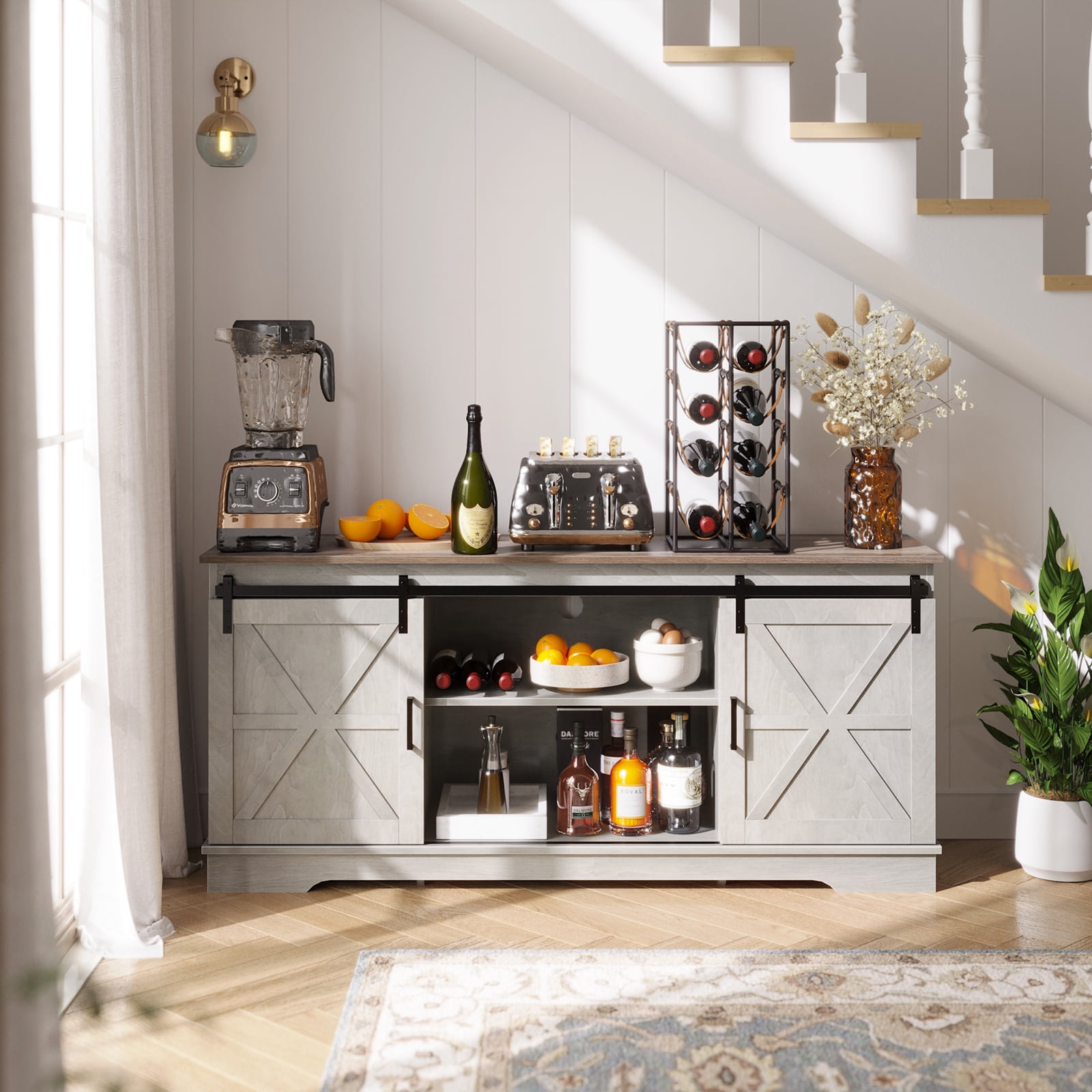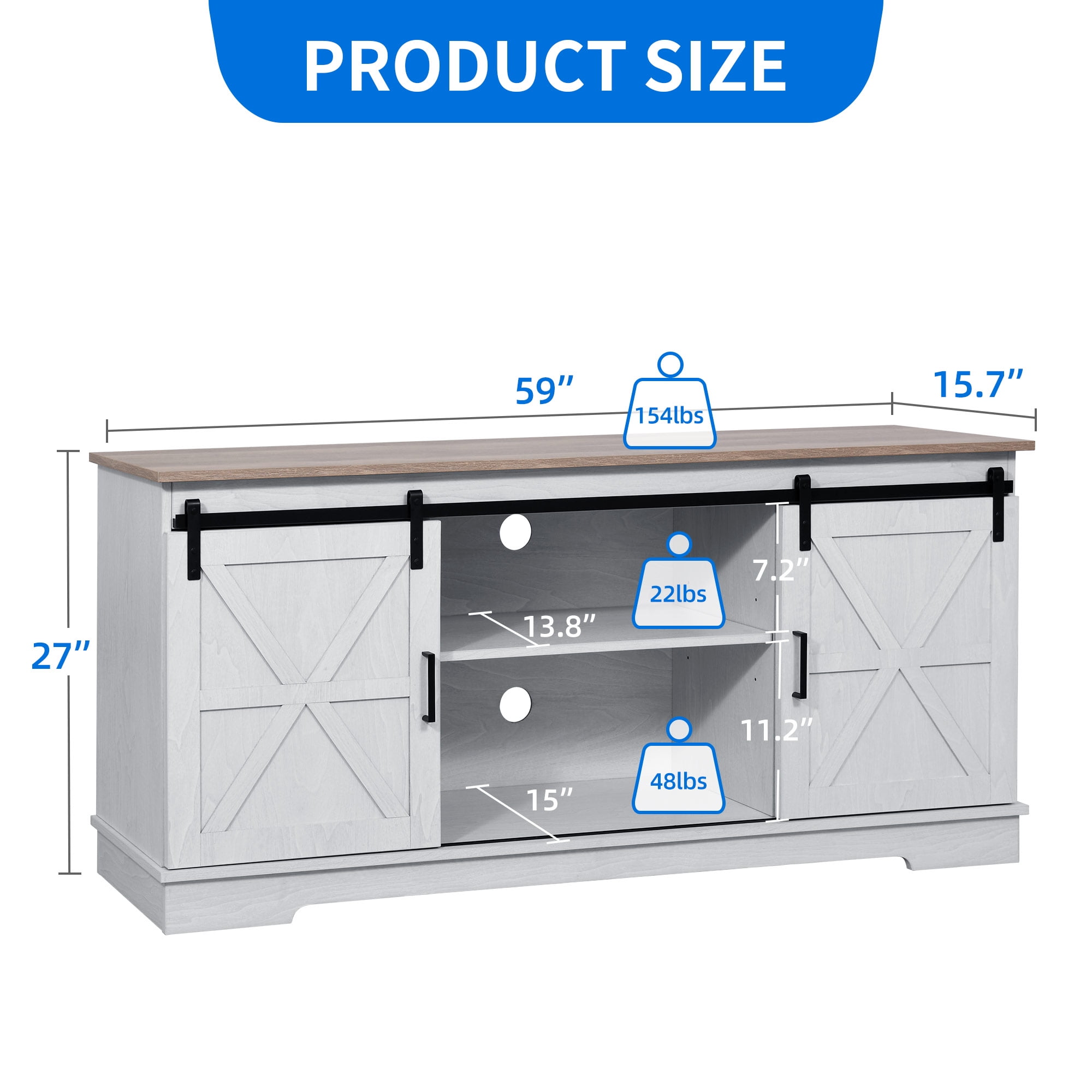 Fits 55, 60, or 65 inch TVs with a maximum weight capacity of 300 lbs Crafted from P2-certified boards with a high-quality wood grain surface for a sturdy and scratch-proof construction Dimensions: 59.1″ L x 15.7″ W x 26.8″ H, providing ample space for your TV and entertainment setup Features a classic farmhouse style design with a natural wood grain finish and barn door look, adding rustic charm to your living space Includes an adjustable shelf above the TV cabinet to store daily items such as books, toys, or decorations Equipped with smooth-sliding barn doors that allow you to easily access the open and closed storage compartments Includes cord management ports to keep your cables tidy and organized Each TV stand is strictly tested before delivery to ensure an intact package, with all necessary accessories and detailed instructions included for easy assembly