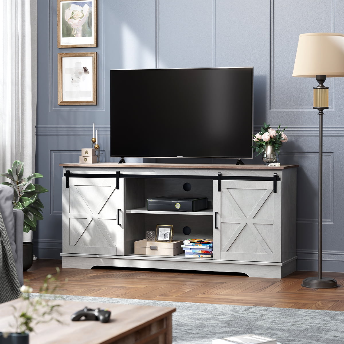 Dextrus Farmhouse TV Stand for 65-Inch TV, Entertainment Center with Double Barn Doors, 300-Lb Capacity
