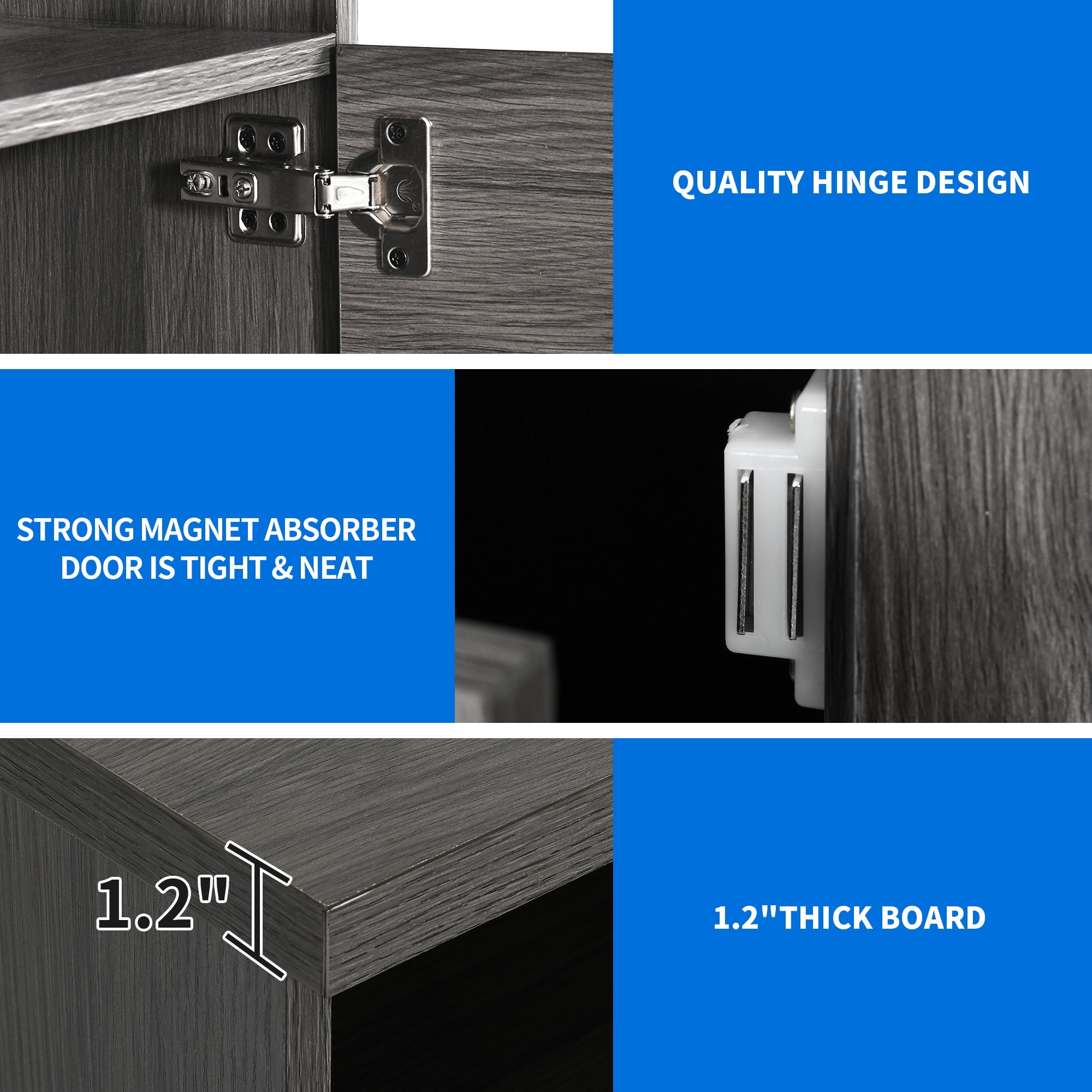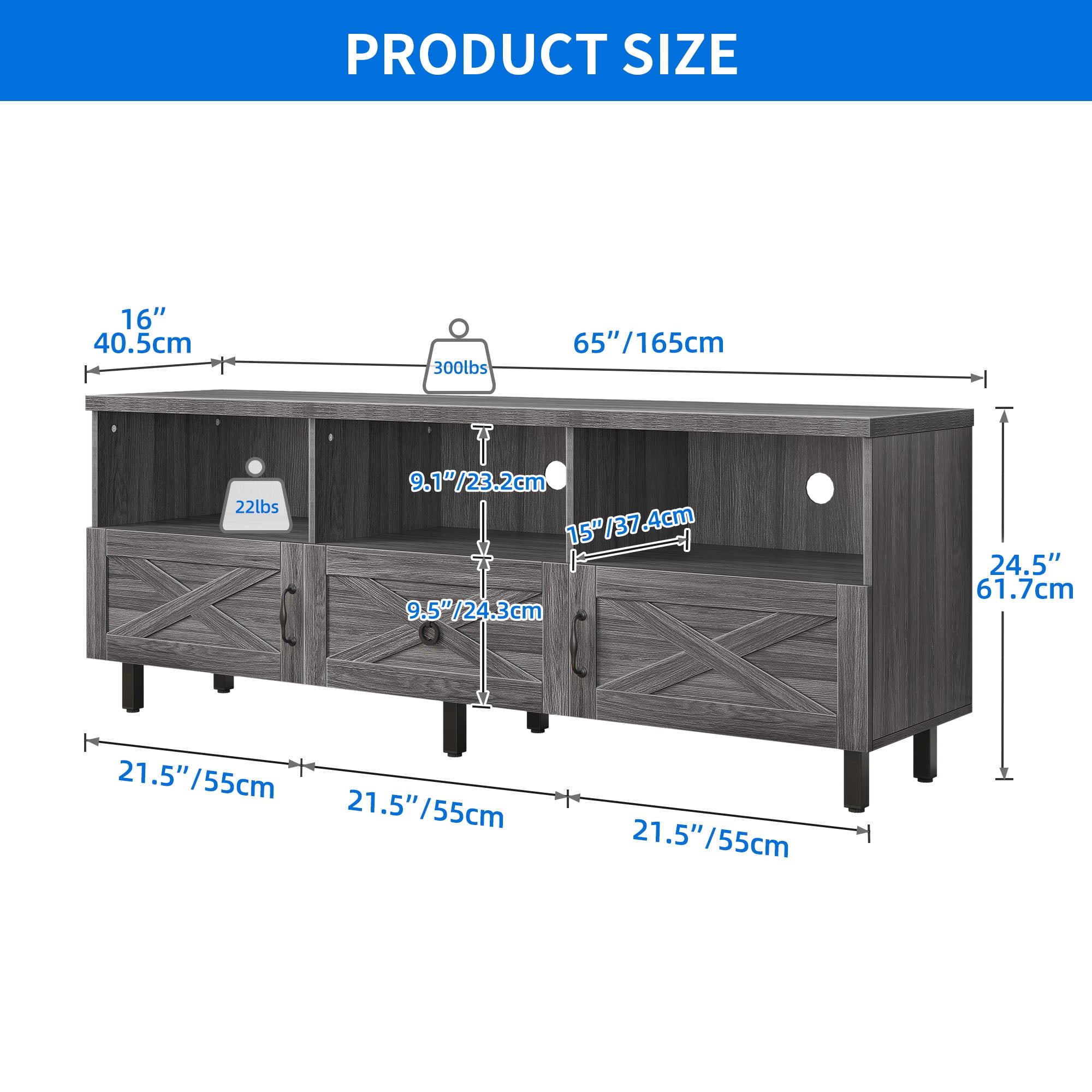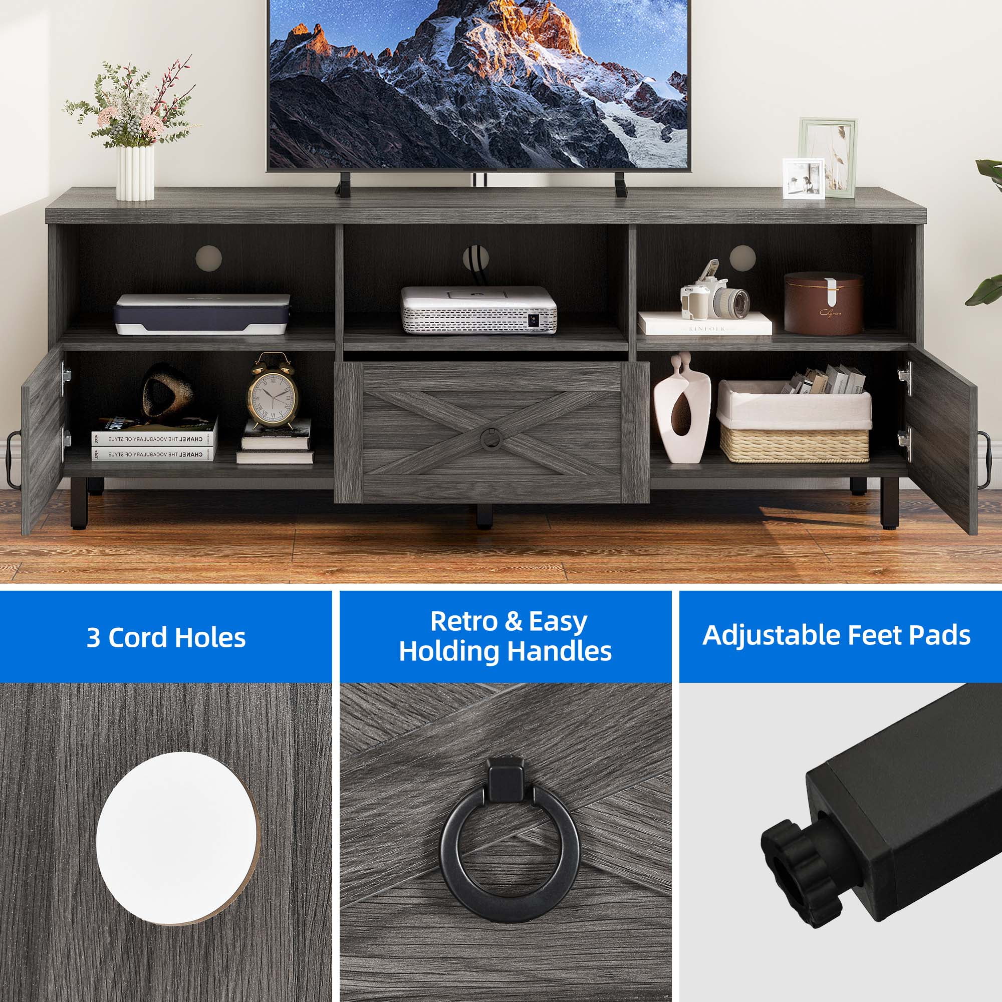 Storage Cabinets and Drawer in 1 Design: Featuring ample storage space, this white TV stand consists of 3 top open shelves, 2 storage cabinets and 1 middle drawer to provide you with large capacity to meet your storage requirements. You can display magazines, CDs, remote controls and other items on the media console table to improve space utilization. Combination of classic and modern: Boasting of classic X design of doors with retro black metal handles and a modern color mix of white and gray, this innovative TV stand adds an inviting charm to your home. 100% no wobble & sturdy for 300lbs: This TV console stands is made of 1.2” thick boards with great rustic wood grain finish. The wood top and shelves can easily hold up to 300 lbs. 2 extra adjustable support legs under the bottom shelf increase the load capacity a lot and adapt the TV stand to fit different types of grounds. This TV stand fits 55/ 60/ 65/70 inches TV. Versatile entertainment center: Our unique stylish TV stand can be used as a display table(3 top shelves can show your items well), console table, coffee table, cocktail table, sofa table, etc. Functional and suitable for any room, like living room, bedroom, apartment and lounge areas. Easy assembly: It only takes 40-50 mins to finish the installation by 2 people (a step-by-step instruction included). Any problem will be solved properly to your satisfaction.