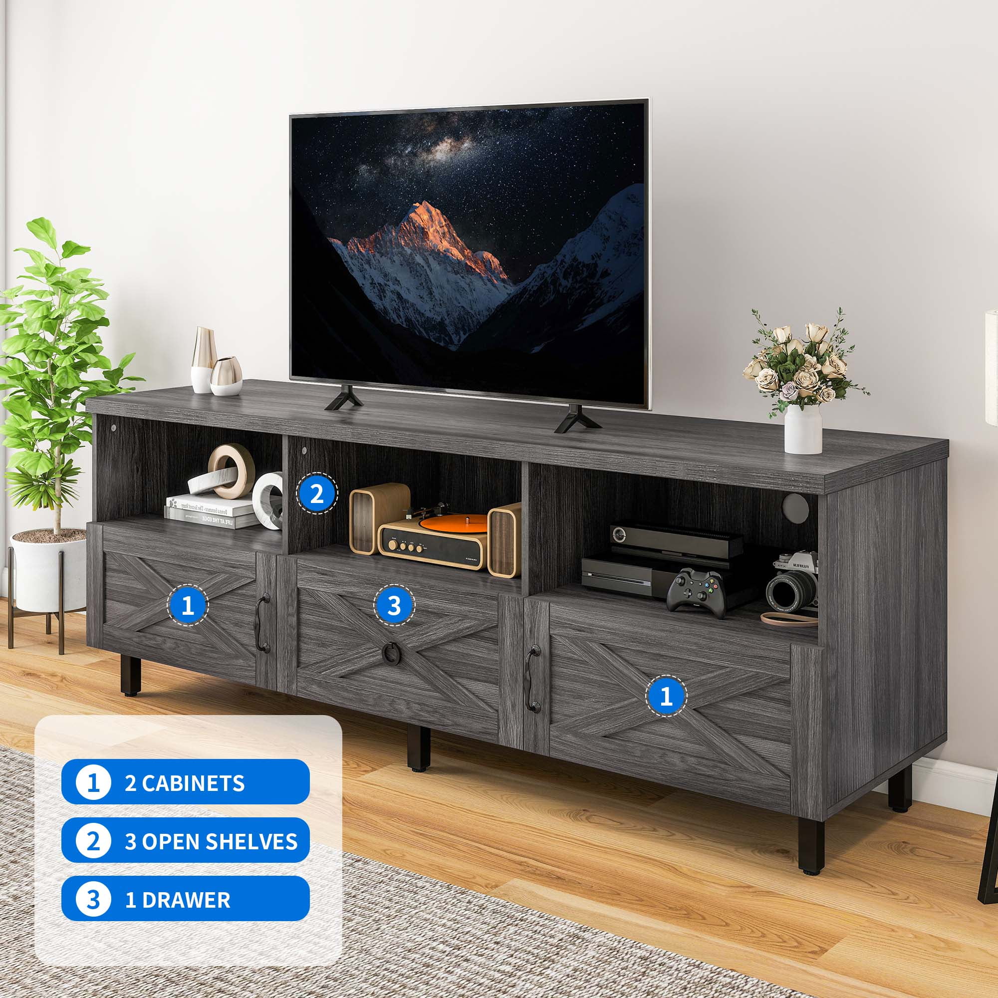 Dextrus Farmhouse TV Stand for 70 inch TV, Wood TV Table Media Console with Storage, Dark Grey