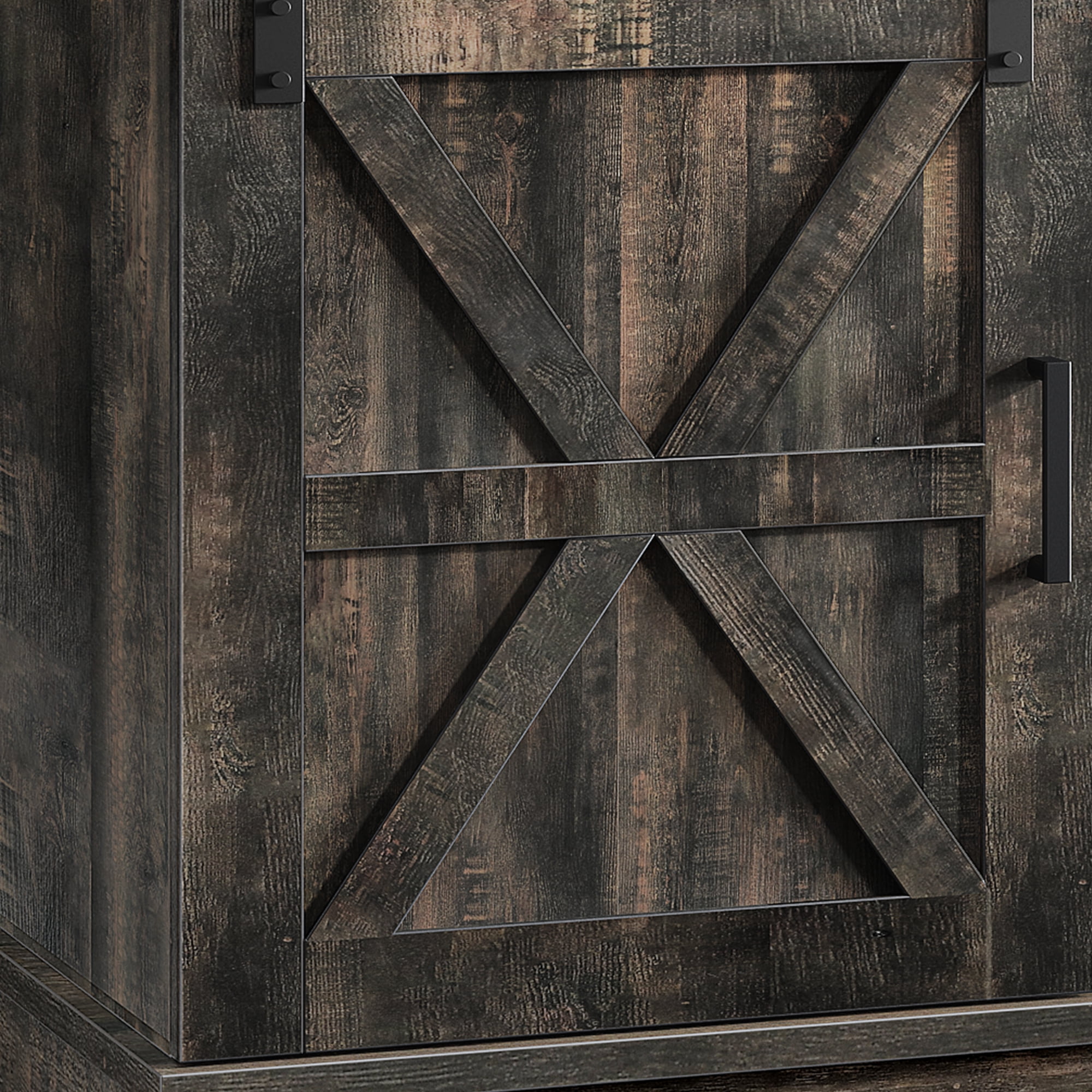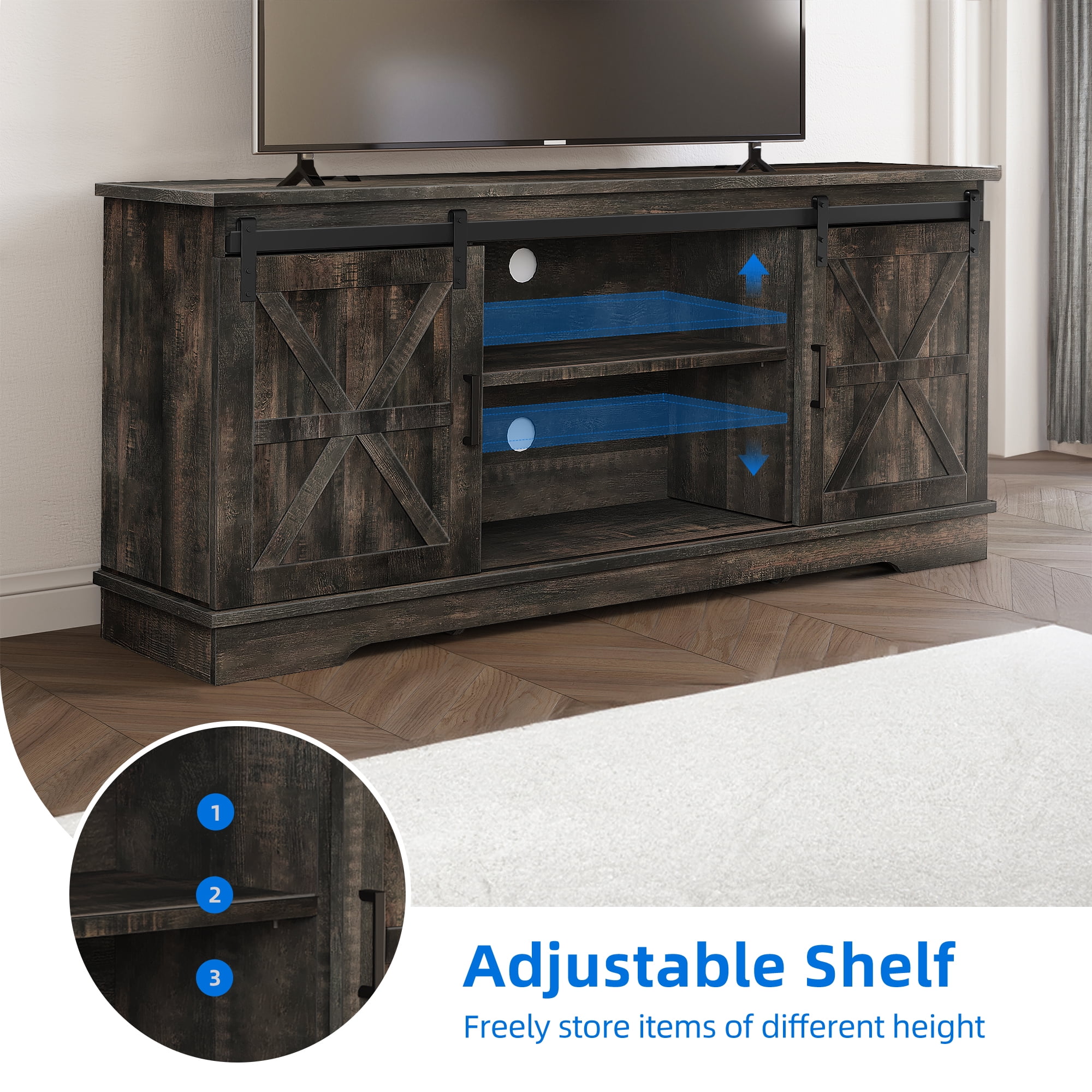 Scratch-proof & Sturdy for 300Lbs: The modern TV stand is made from well-done P2-certified boards with high-level wood grain surface. Fits 55/ 60/ 65 inch TV. Dimensions: 59.1” L×15.7” W×26.8” H Barn Style & Unique color: The double barn doors with X elements, elegant grey white and grey wash color mixing make rustic TV stand a piece of farmhouse & decorative furniture, easily blending with other room decor and adding natural charm to your living space. Ideal for cottage, modern, or industrial-inspired settings Sliding Barn Doors: This wooden TV stand has a smooth sliding mechanism that allows you to easily move double barn doors without taking up space. You can also move 2 doors on one side or separate them on 2 sides for satisfying different storage & display needs Open Closed Storage & Adjustable Shelf: The open tabletop and half open & closed compartments give you spacious storage space. Adjustable shelf makes it easy to store items of different height and 2 cord management ports keep cables tidy Strict Package Testing: Each solid farmhouse TV stand with shelves is strictly tested before delivery to ensure you get an intact package. All necessary accessories and detailed user manual are included, making installation easier. It’s more efficient and effortless if 2 persons assemble the long media console
