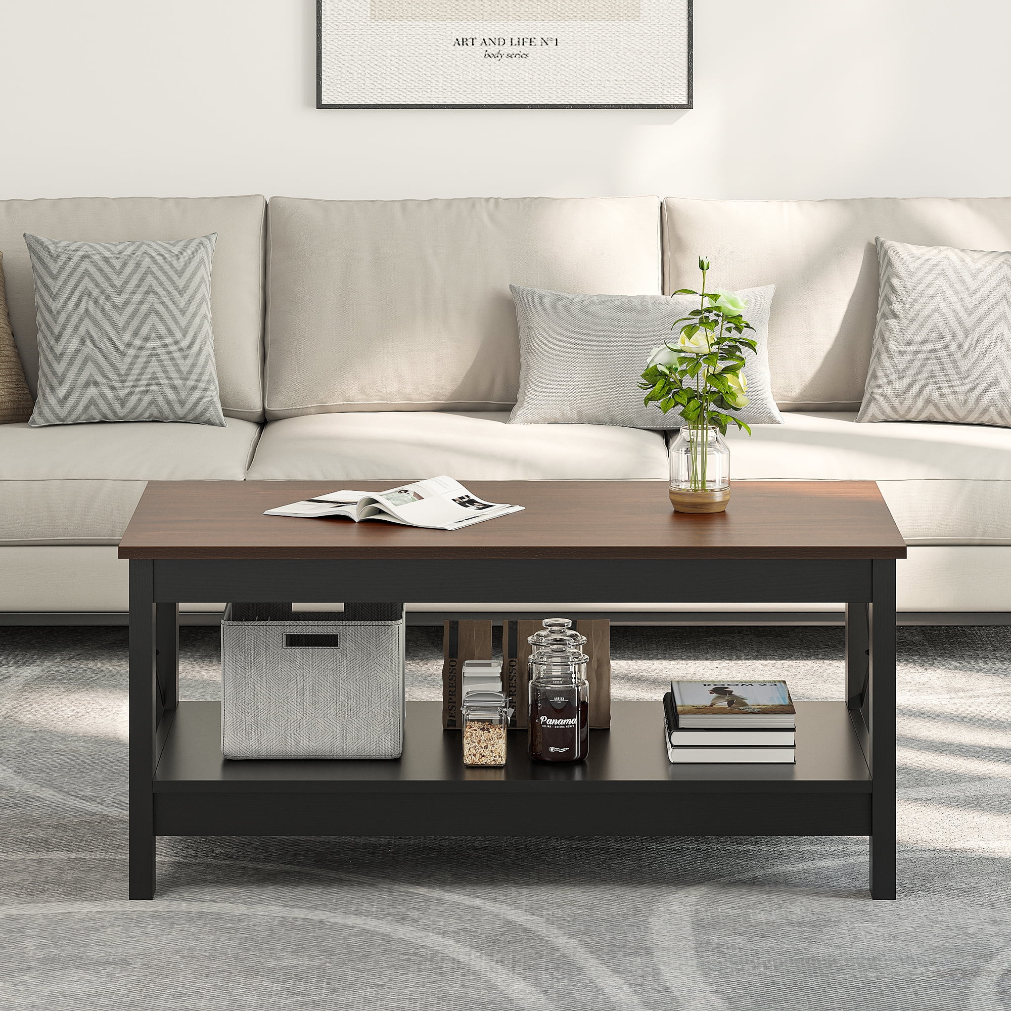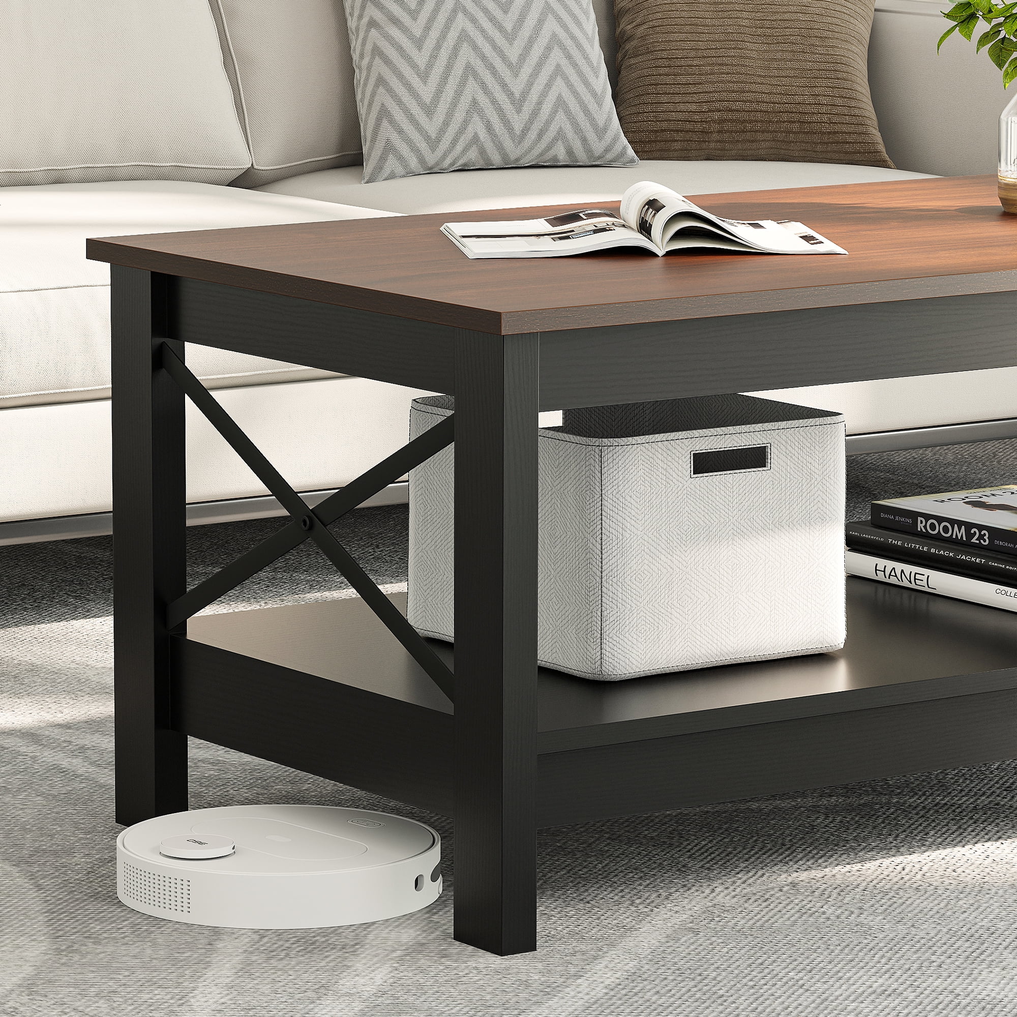 Dextrus Farmhouse Wood Coffee Table with Storage Shelf, Brown Durable and spacious storage with 2 shelves for daily necessities and thickened legs for added stability Reinforced X-shaped design with non-slip features for stability and a unique decorative touch Minimalist brown finish complements rustic and modern spaces, ideal for living rooms, bedrooms, and lounges Scratch-resistant and waterproof wood tabletop for long-lasting durability and easy cleaning with a damp cloth Easy assembly with all necessary tools, instructions, and an illustrated user manual included