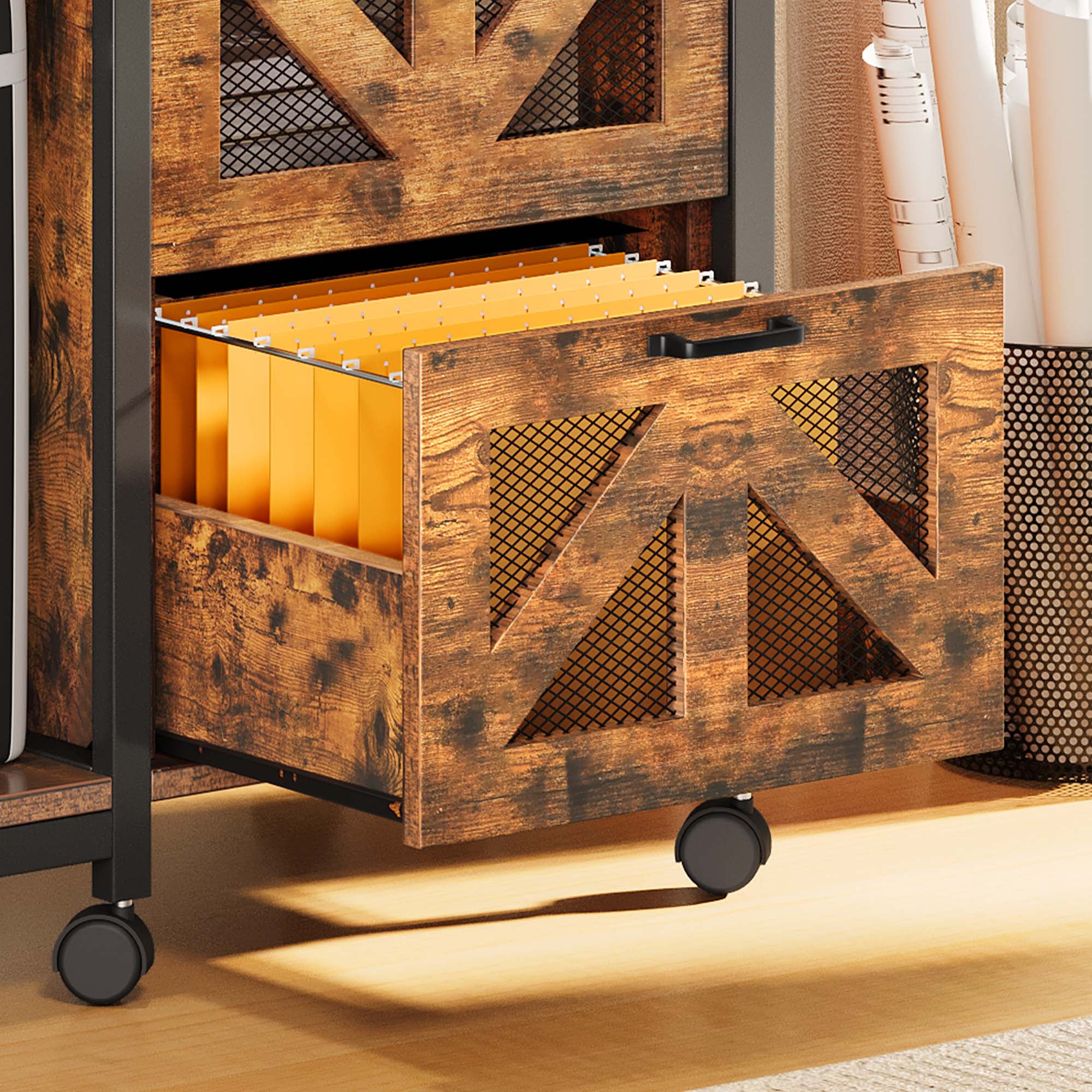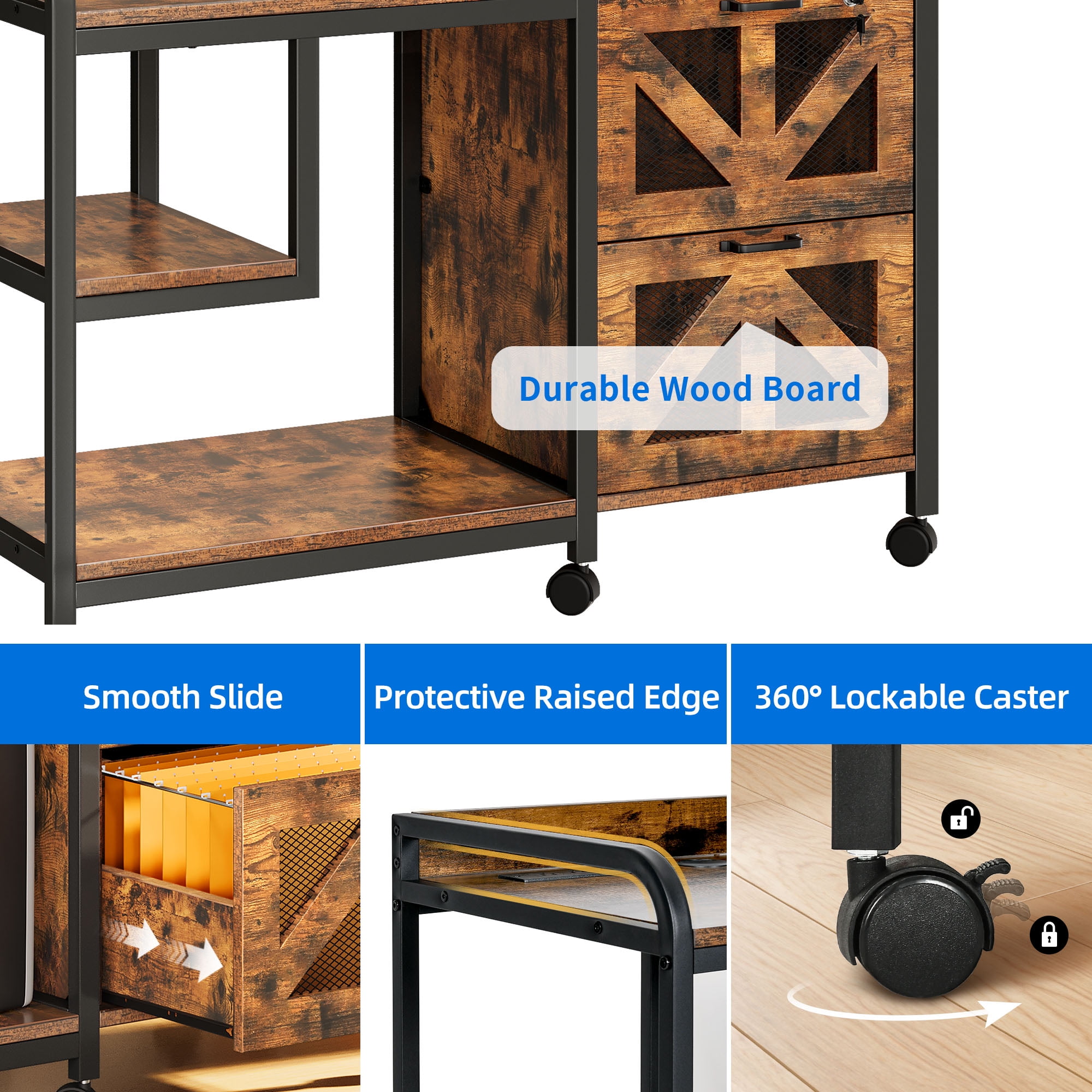 Expansive Organization: Unveil our intelligently designed file cabinet with shelves, offering ample space to arrange your printer and more on its generous desktop surface. Revel in the accessibility provided by the large computer monitor compartment and open storage areas for your everyday essentials. Sturdy Elegance: Embrace durability and strength with each shelf supported by a robust metal frame, ensuring structural integrity. The high-density board wards off scratches and water damage, while the inviting warm brown hue sets this cabinet apart, seamlessly blending functionality with sophistication. Versatility Redefined: Transcend conventional usage with this marvel—beyond being a mere printer cabinet or home office storage solution, it transforms effortlessly into a bedside table, a living room fish tank rack, or an ingenious mini refrigerator stand, meeting a multitude of organizational needs with grace. Empowering Functionality: Elevate your workspace with our printer stand equipped with drawers featuring hanging rails tailored for A4, letter, and legal-size files. Safeguard sensitive documents with the lock-equipped drawer, while the inclusion of six sturdy casters, three of them with brakes, ensures smooth mobility and effortless stability. Seamless Assembly Experience: Experience stress-free assembly with our user-friendly instructions and numbered parts, making setup a simple task. For added peace of mind, we provide extra screws, ensuring a worry-free construction process.
