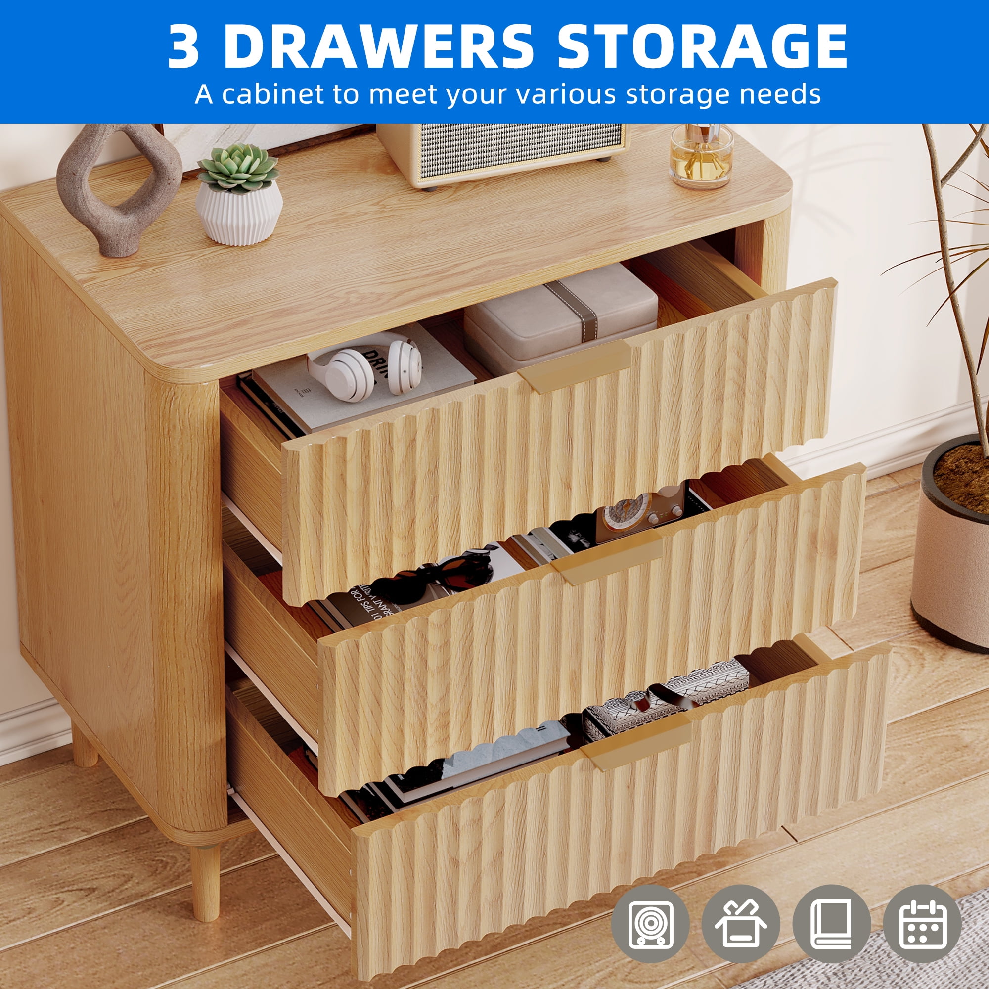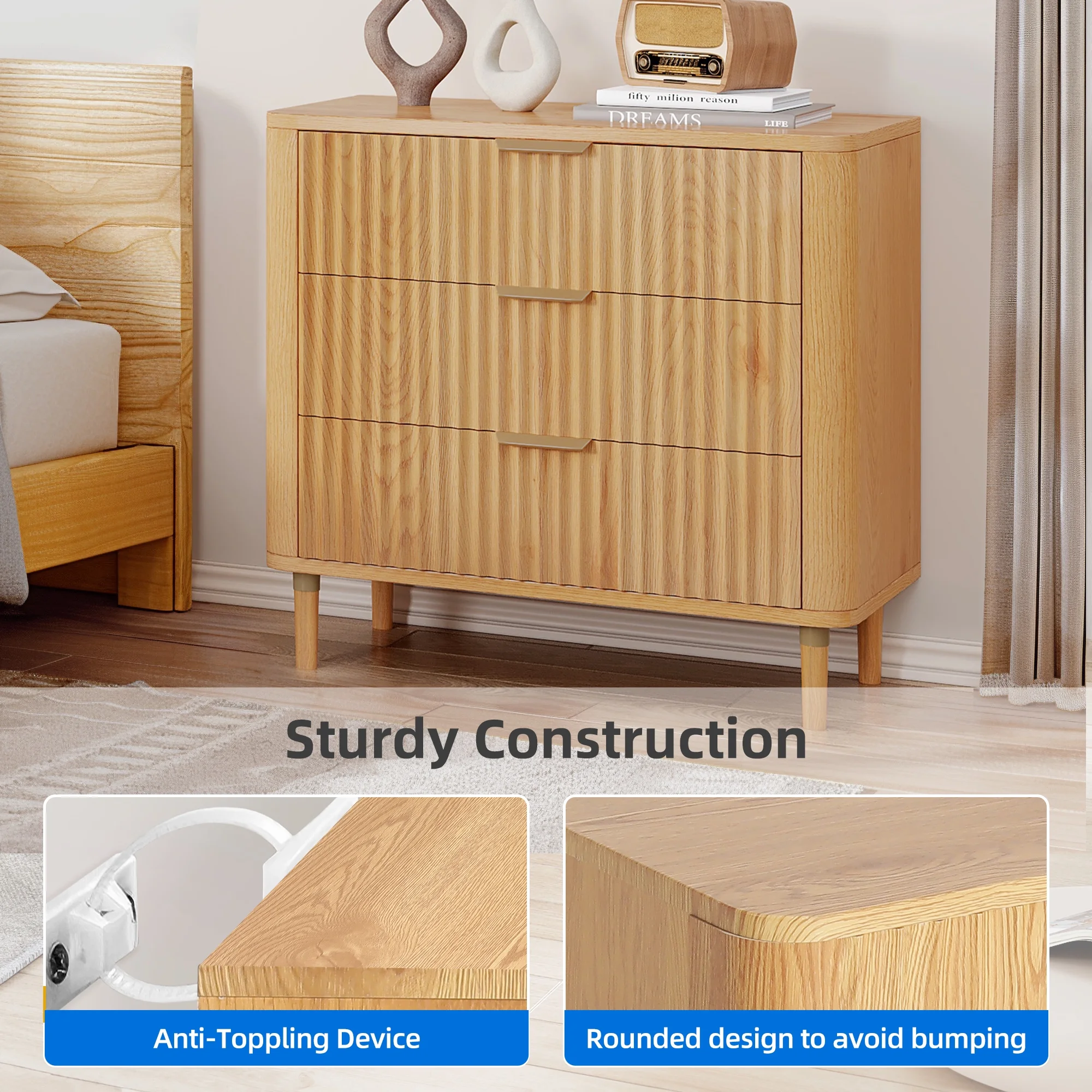 Dextrus Fluted 3-Drawer Dresser, Chest of Drawers Wood Storage Cabinet for Bedroom Living Room, Oak