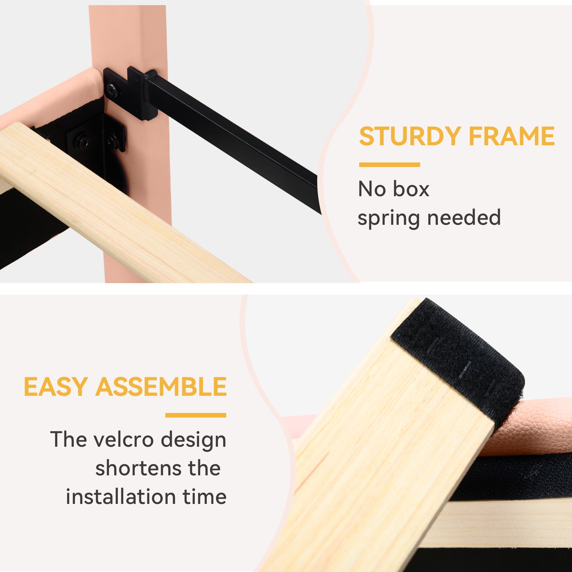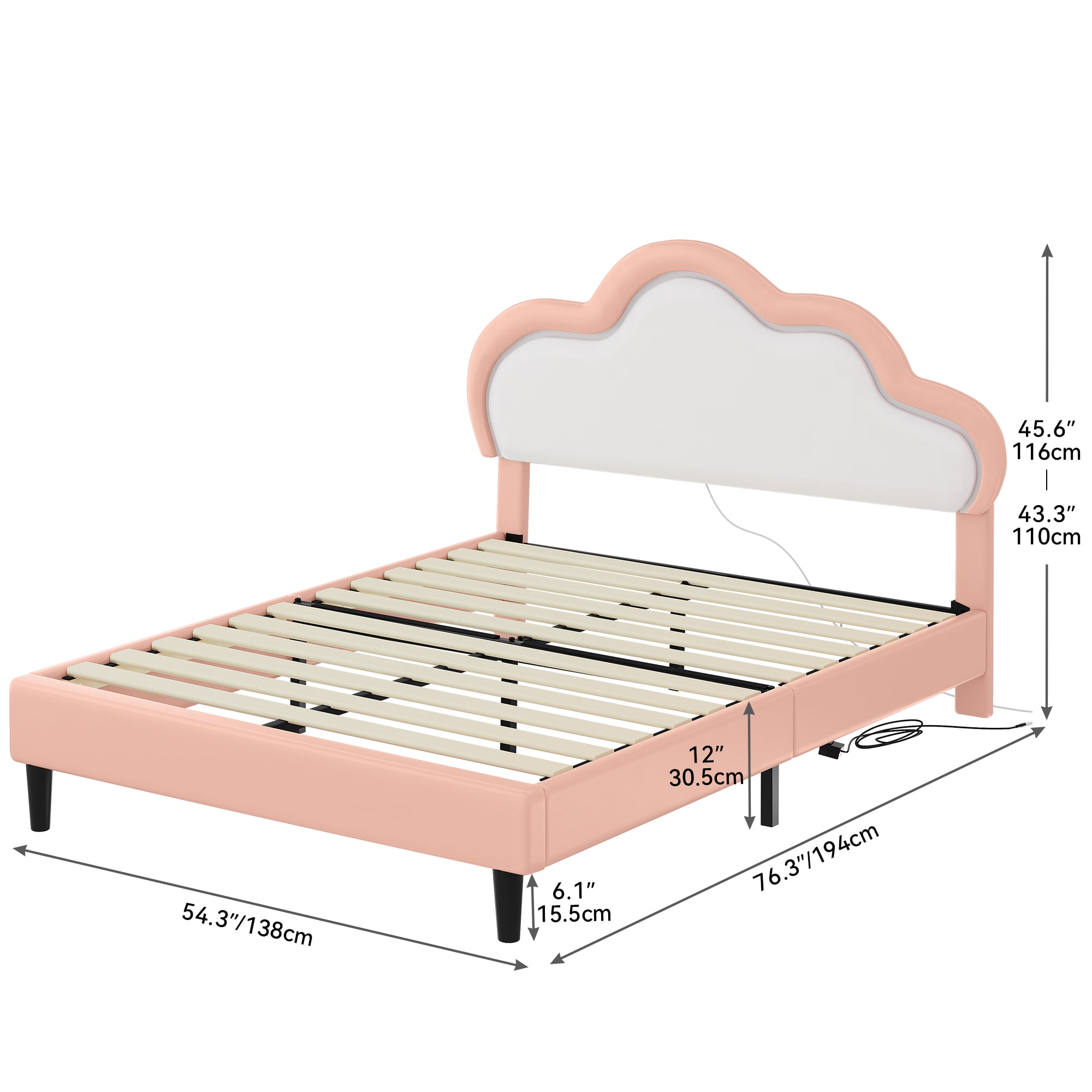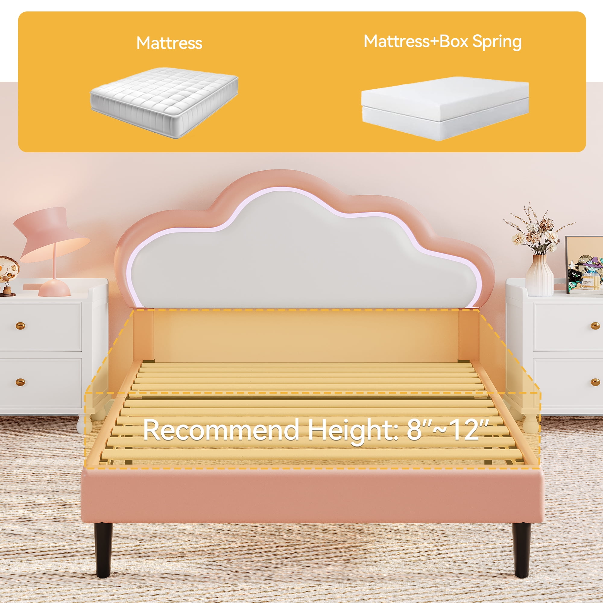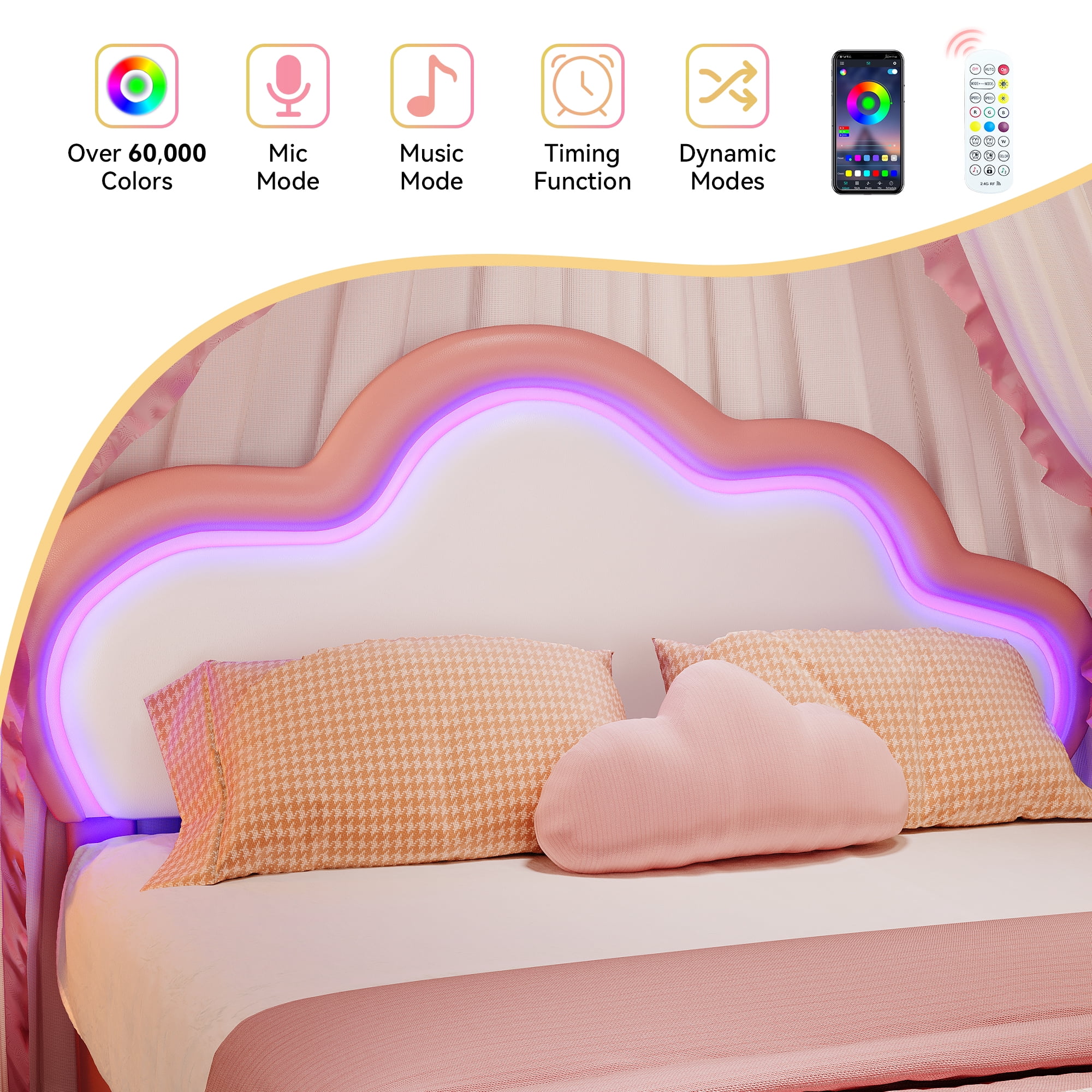 Dextrus Full Size Pink LED Bed Frame with Adjustable Headboard, Wood and Steel Room Glow – Reinvent your bedroom with our LED-integrated bed frame, providing over 16 million color variations and 20+ pre-configured effects for an engaging in-home light spectacle Unmatched Comfort – Bask in the luxury of our pink cloud headboard, adjustable from 433″ to 456″, filled with high-bounce foam and built-in LED lights, suitable for 8″ to 12″ mattresses Space Efficiency – Leverage space with our 63″ elevated full bed frame, offering generous under-bed storage for a clutter-free bedroom Simple Assembly – Set-up is straightforward with included tools and instructions Our responsive customer support team is always available for help Restful Repose – Find tranquility with our robust, quiet platform bed frame, crafted from metal legs and wooden slats A Velcro strip and noiseless bar reduce friction for uninterrupted sleep