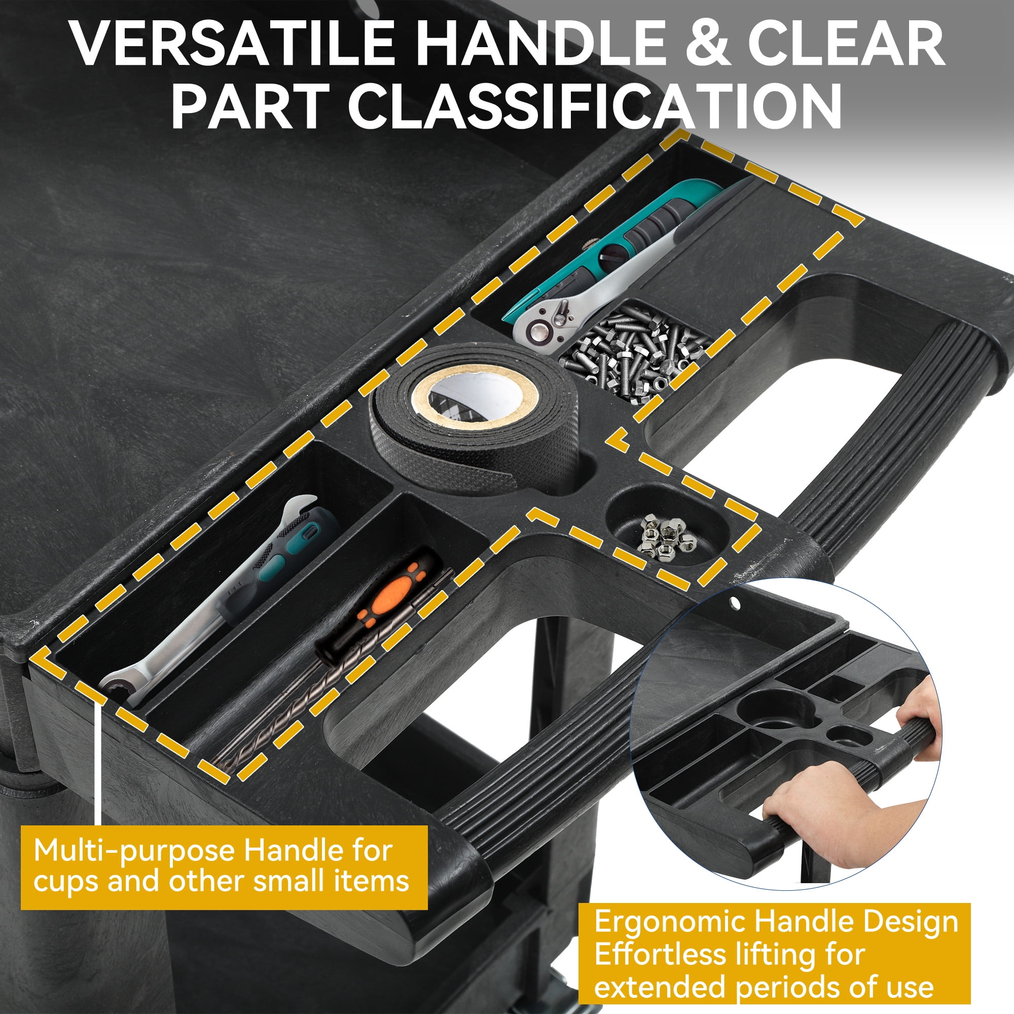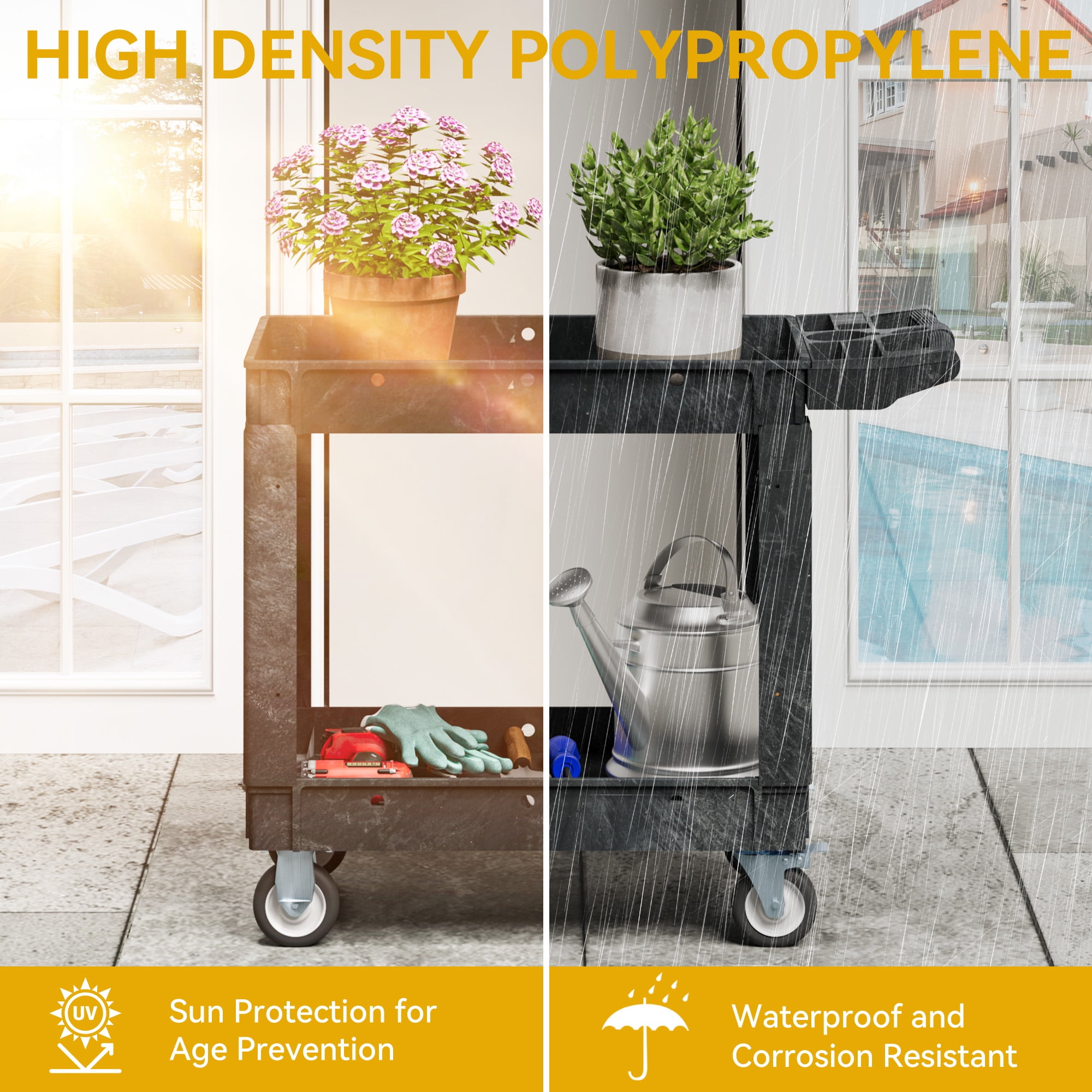 Dextrus Black HDPE Heavy Duty 2-Tier Utility Cart with Lockable Wheels, 550lbs Capacity, 40×17 inch Durable Construction: Made from robust, heavy duty plastic, this cart ensures exceptional strength, stability, and corrosion resistance for long term use High Load Capacity: Supports up to 550 lbs, enabling the transport of more items at once to enhance productivity Lockable Wheels: Equipped with four 5 inch swivel casters made of industrial strength polypropylene, including two lockable wheels for 360 degree flexibility and effortless transportation Weather Protection: Features rainproof material and a protective coating to safeguard against rain and sun exposure, maintaining its shape and durability Easy Assembly: Comes with detailed instructions for hassle free assembly in just three steps, with dimensions of 45x25x17.4 inches and two layers for efficient storage and organization