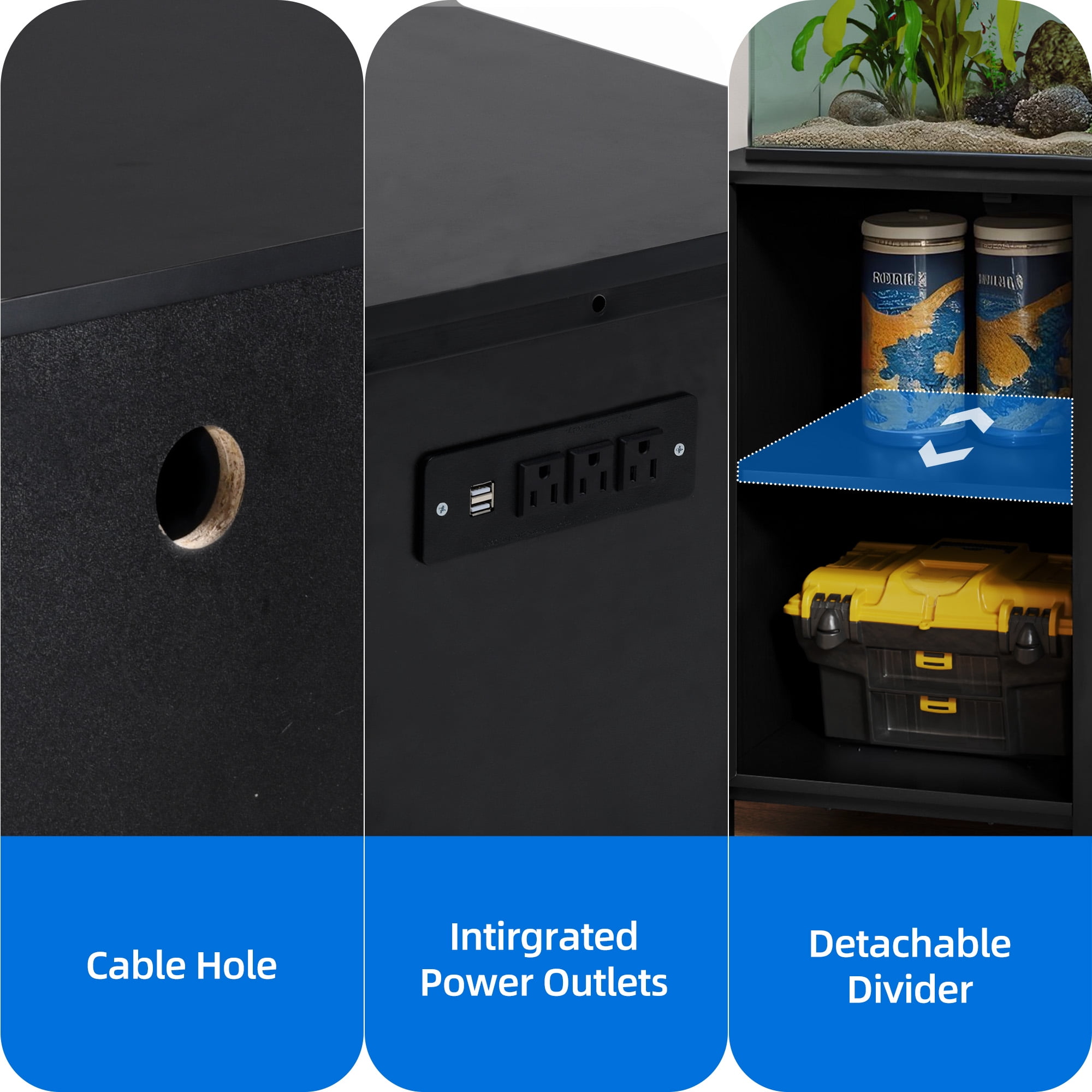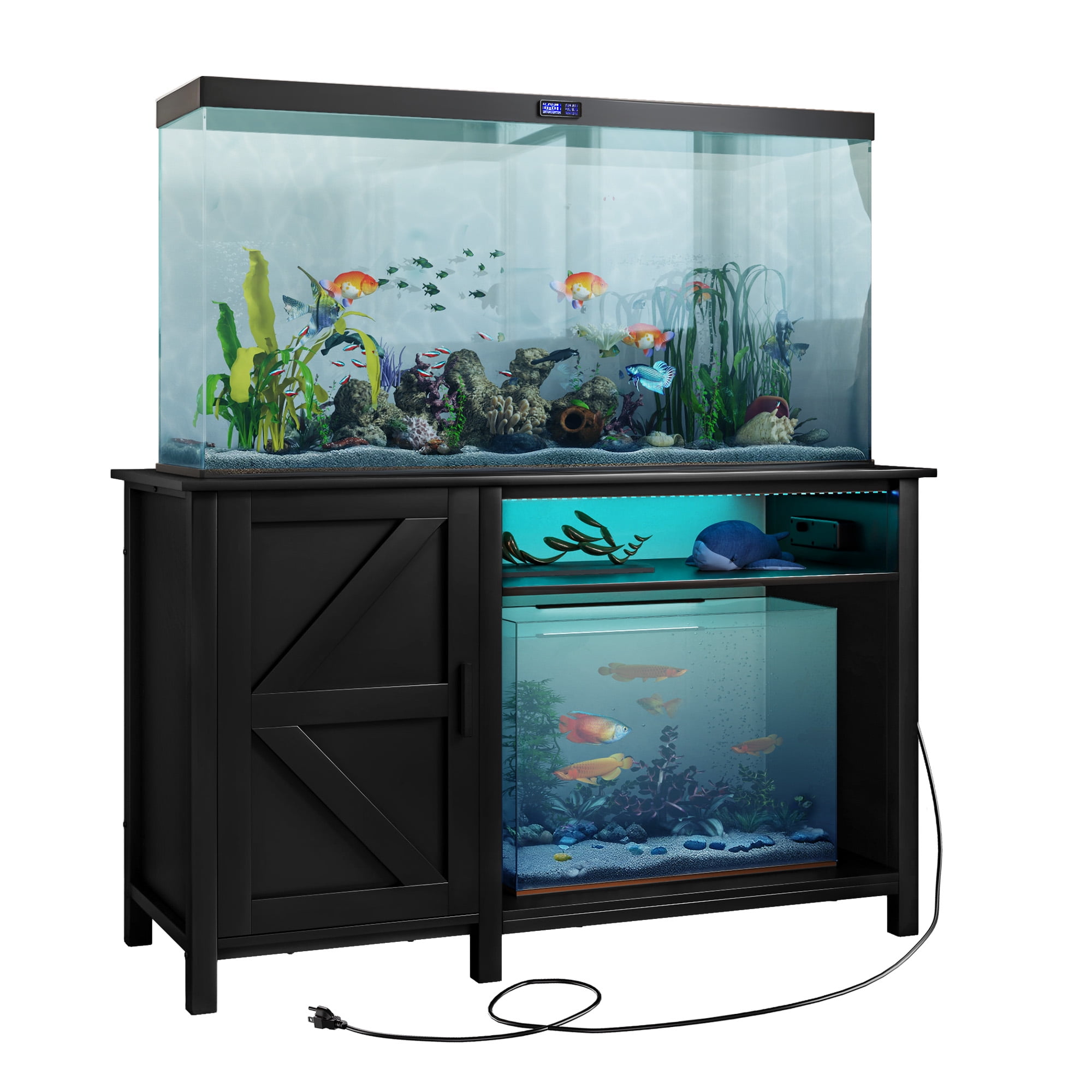 Innovative Aesthetic: Featuring an RGB light strip and plug-in design, our aquarium stand boasts a visually appealing display. The charming barn door design adds a rustic touch to your living space, making it a versatile fit for various rooms including living rooms, entryways, bedrooms, and basements. Exceptional Capacity: Equipped with three additional support bars beneath the tabletop, the Dextrus fish tank stand effortlessly accommodates 55-75 gallon aquariums weighing up to 800 lbs, guaranteeing the safety and stability of your aquatic habitat. Dual Aquarium Housing: In addition to the primary 55-75 gallon tank, our fish tank stand seamlessly accommodates a 20-gallon mini aquarium, allowing you to diversify your aquatic life in one convenient and stylish location. Convenient Storage: The Dextrus aquarium stand provides ample storage space with adjustable dividers for enhanced convenience and flexibility. Perfect for organizing fish feed, aquarium accessories, and other necessities for your underwater world. Effortless Assembly: Delivered unassembled, the fish tank accessories storage ensures an easy setup process. Simply follow the included instructions for a hassle-free assembly experience, allowing you to enjoy your new aquatic display in no time.