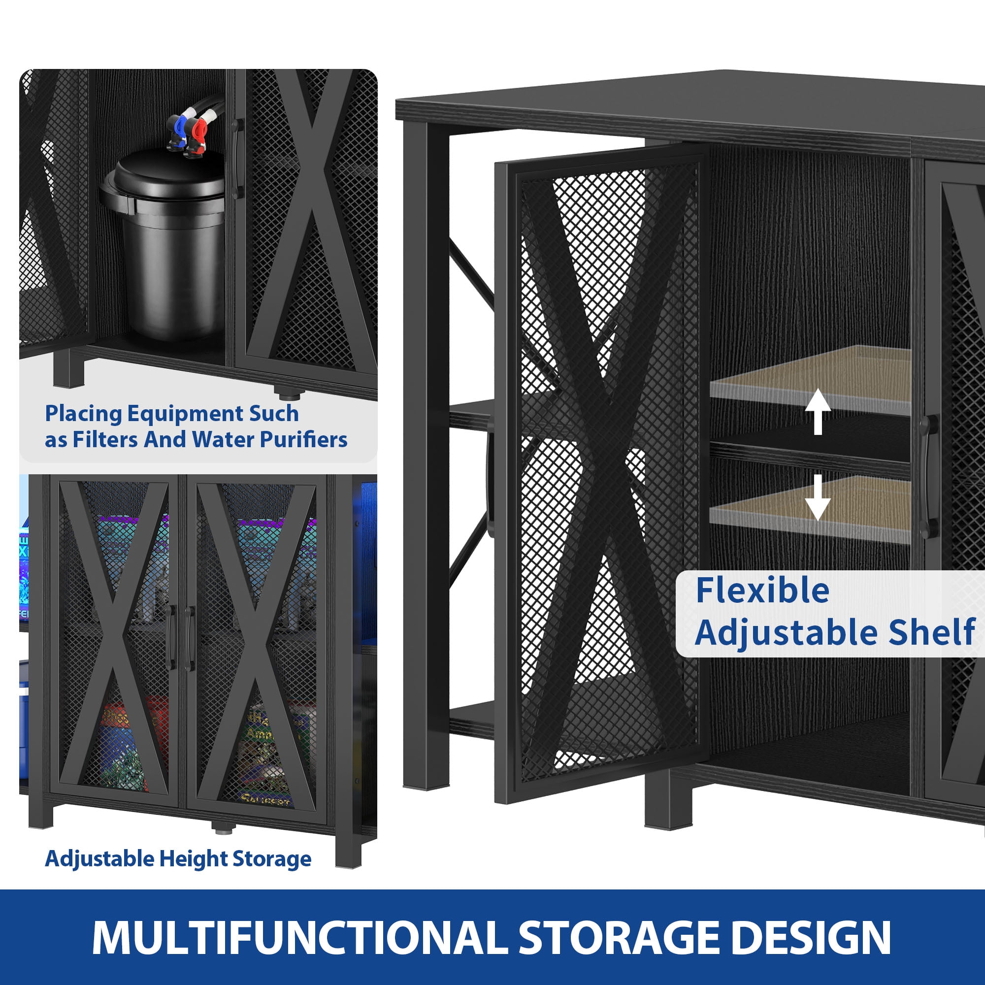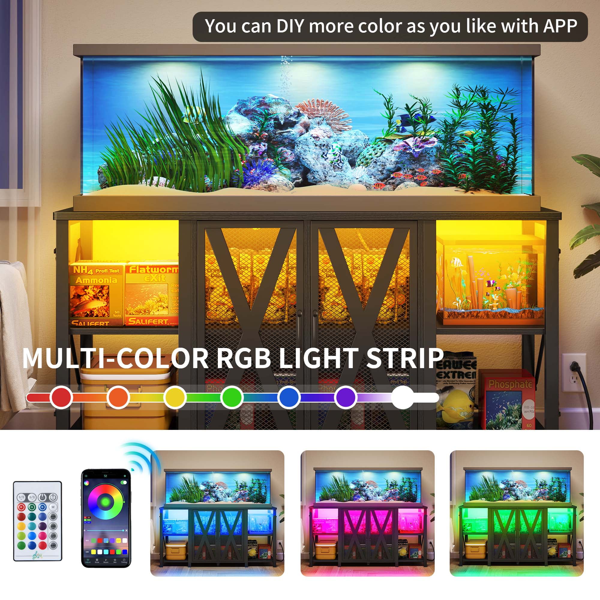 Breathtaking Ambience: The RGB LED lights on both the cabinet and stand create a vibrant atmosphere, adding beautiful colors to your aquarium. Optimized Efficiency: This heavy-duty stand holds a 75-120 gallon tank on top and a 5-gallon aquarium on the bottom, fitting most standard tank sizes. (Tanks not included.) Neat & Tidy: Keep your aquarium setup organized with a built-in cabinet for storage. The adjustable shelves offer flexible space for your accessories. Effortless Convenience: With built-in power outlets, you can easily connect lights, heaters, and pumps, making your aquarium setup simpler and more convenient. Robust & Enduring: The strong legs support up to 2000lbs, and anti-tip devices add safety. The moisture-resistant material ensures long-lasting durability.
