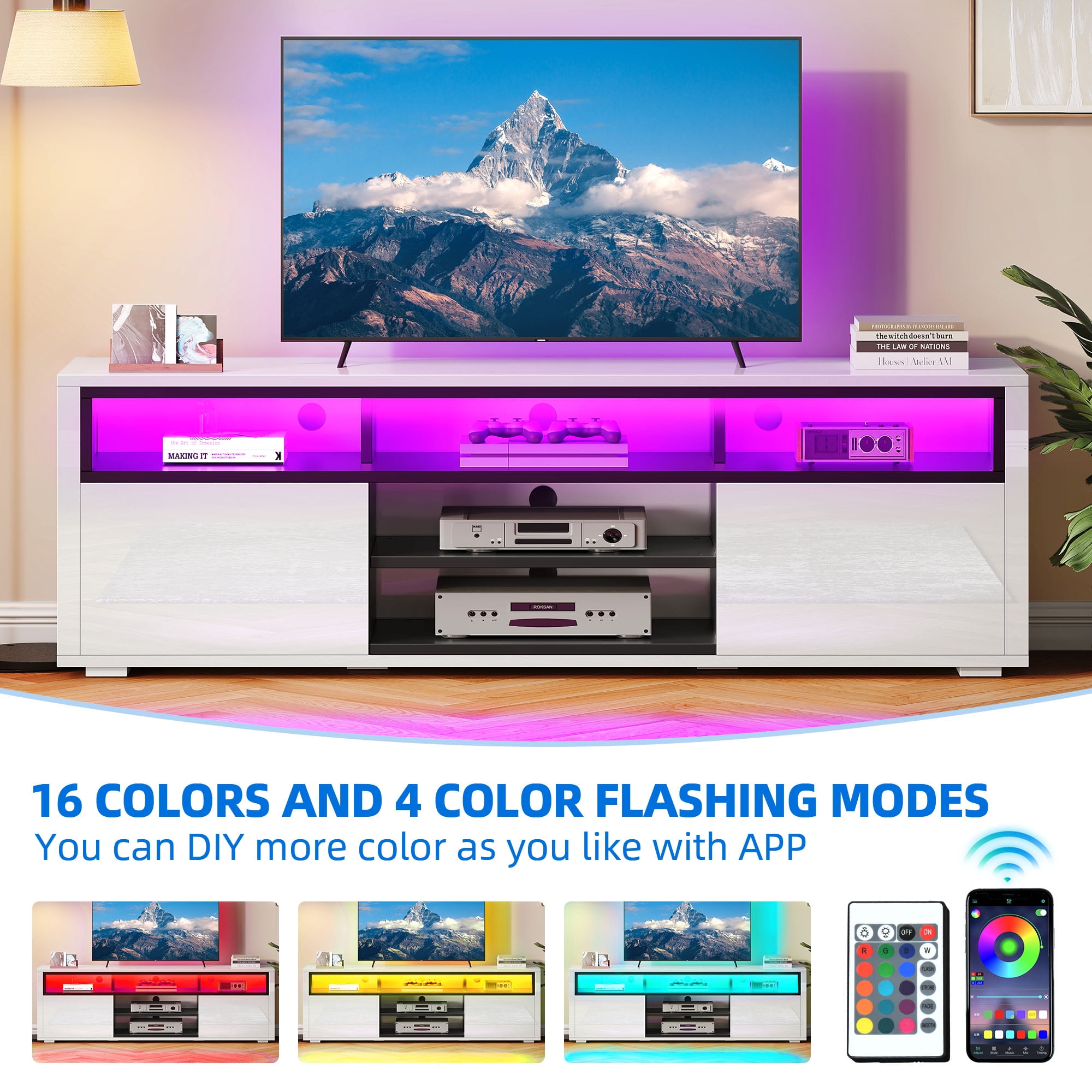 【Modern Design TV Stand】— This LED TV stand with modern and simple design is very suitable for most home decorations, such as magazines and photos. The elegant and generous glossy finish design ensures that the TV entertainment center is outstanding and elegant, adding dynamic vitality to the modern and concise design for your living room or bedroom. 【Adjustable LED System】 — With 16-color LED lights and 4 flash effects, ideal for home lovers. This LED lights system is controlled by remote control to switch ON/OFF or change dynamic effects, decorating your home colorful and beautiful. 【Sturdy Material】 — Made of high-grade (E1) MDF, tempered glass, and high-quality hardware that makes the table waterproof and wear-resistant for long time use, which can bear weights up to 66.15lbs. Thicken base can keep the table more stable on floor. 【Widely Used】 — High gloss finish with simple white lines makes the TV table look great in different home decor styles, like modern, mid-century, farmhouse, rustic, retro, industrial decor and more. Fit well for your bedroom, living room and lounge room, etc. 【Easy to Assembly】 — All parts and accessories are included in package. Fast to put it together with our easy-to-follow instructions. If you have any questions about this universal TV stand, please feel free to contact us.