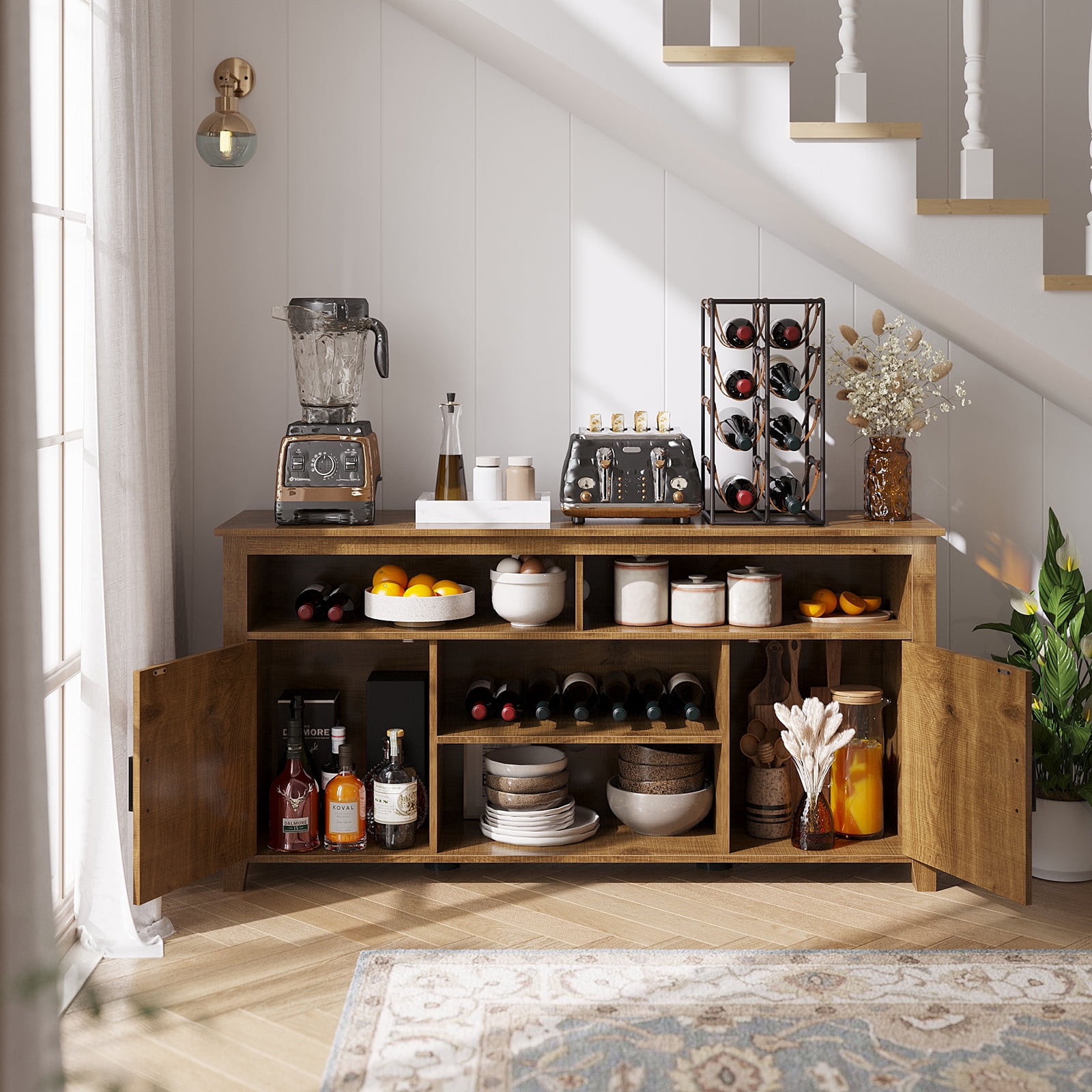 【MULTIFUNCTIONAL CABINET】This multifunctional farmhouse sideboard cabinet has many uses, it can act as coffee bar cabinet, TV stand for 65″, kitchen buffet, sideboard cabinet or other storage cabinets in the bars, kitchen, living room, dining room, etc; This all-purpose storage cabinet can meet your various storage need. 【MATERIALS PREVENT MOISTURE】Our coffee bar cabinet is made of high-class warp-resistant MDF (P2 grade medium density fiberboard), which can last for a long time. The waterproof cabinet with great relief grain door can effectively prevent moisture and dust so it can also be used as a bathroom floor cabinet. 【STRUDY for 300 lbs & FARMHOUSE BARN DOOR CABINET】We specially add 4 legs pads under the bar cabinet to maintain better stability to hold 300lbs and protect your floor when you move it. The barn door farmhouse style cabinet tends to be practical and family-friendly; its weathered worn look adds simple flourish to your home. 【LARGE STORAGE SPACE】15.7″D x 59″W x 26″H; Coffee cabinet designed with quality hinge door with handles, which can both be opened and closed storage space for easy access your items. There are 2 open shelves, 4 cubicles, middle adjustable shelf and wide desktop maximize your storage space for your books, pictures, dishes, etc. 【EASY ASSEMBLY】Takes only 40-50 mins to finish the installation by 2 people. Attached a step-by-step instruction; Any problem will be solved properly to your satisfaction.