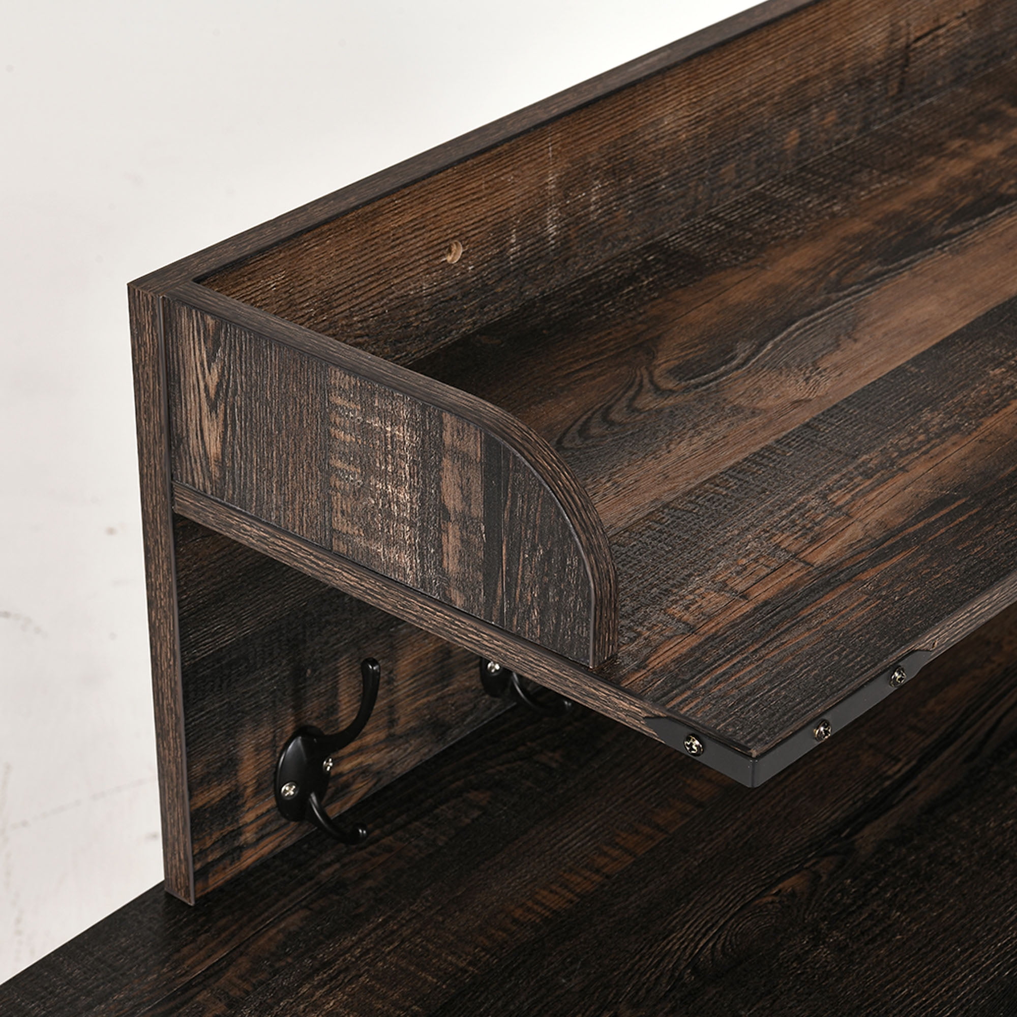 With stylish and rustic appeal, Dextrus entryway bench with coat rack wall mounted can match perfectly with other furniture in your home.Comfortably sit on this bench to change your shoes and hang your coat on the rack when coming home or going out. No tripping over your shoes or leaving your coat lying around anymore! Conveniently get bags, coats, scarves, etc at the front door without needing to open the closet. The top shelf act as a stage to show off photos, small plants, books, etc.