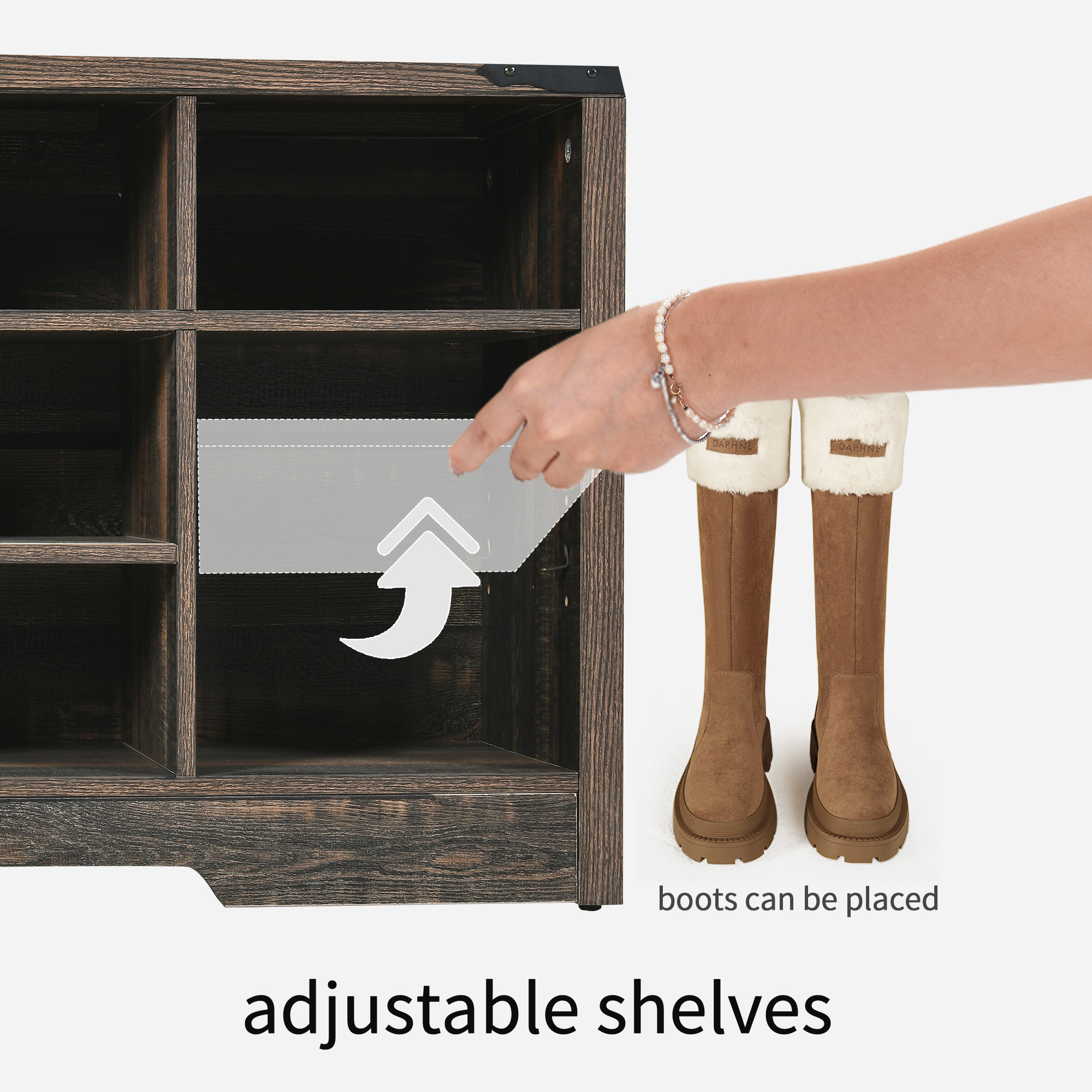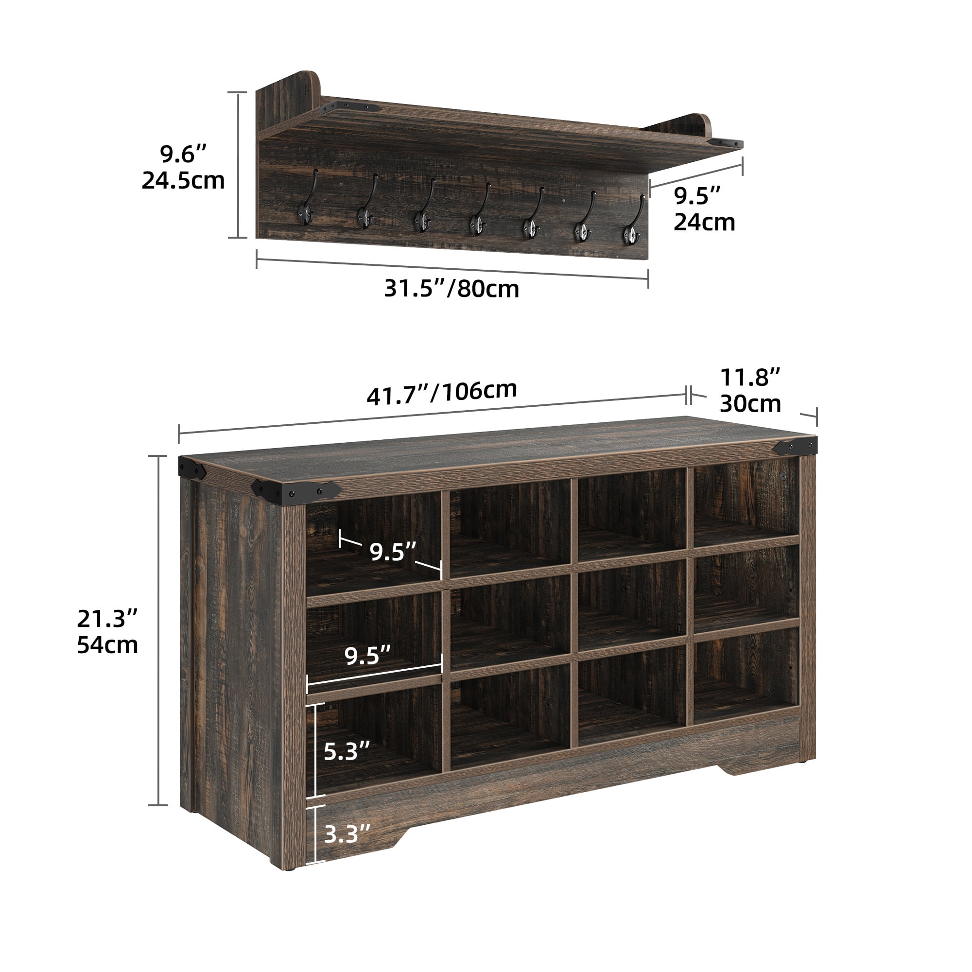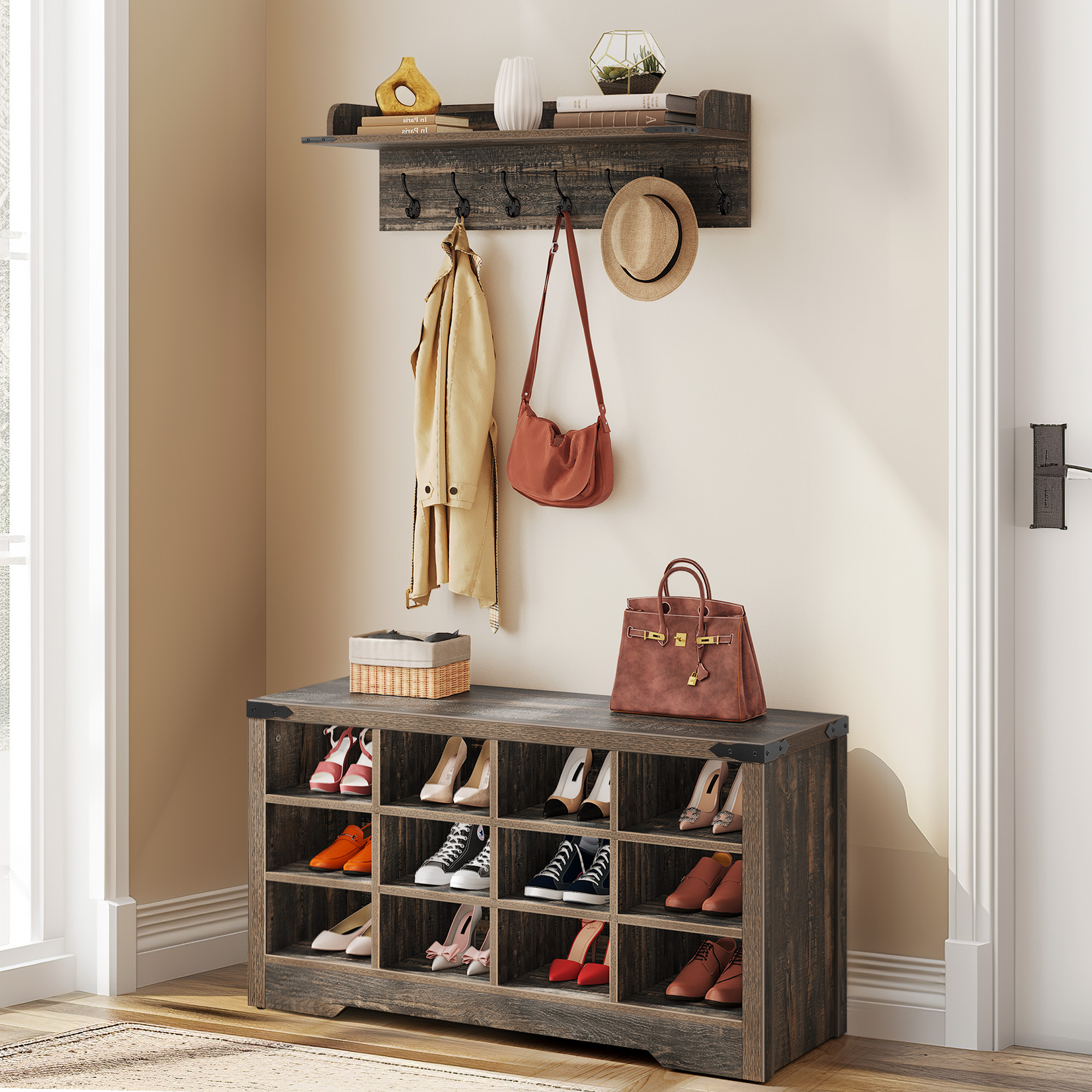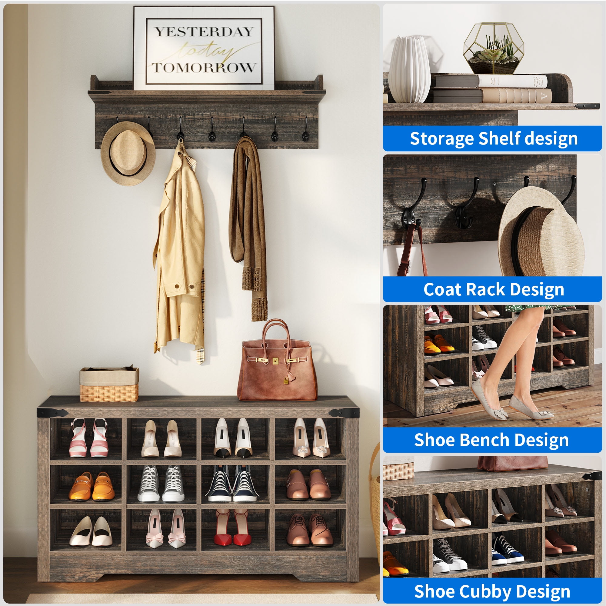 4-In-1 coat rack with bench: Keep your hallway neat and organized with this all-in-one coat rack. It features a top storage shelf, 6 hooks, and a bench with 18 shoe cubbies. Get ready to transform your home! Large storage hall tree: Maximize your storage space with this spacious entry bench. Each of its 3 tiers can hold 5-6 pairs of shoes (depending on shoe size), and there’s even a dedicated cubby for boots. Hang coats, bags, hats, keys, and more on the 7 hooks, and display photos, plants, or books on the 2 storage cubbies with a top shelf. Space saver & flexible structure: Our entryway bench with coat rack offers ample storage without taking up much space. The partition is removable, allowing you to customize the storage layout. Store your boots perfectly, and for larger shoes, we recommend using one cubby per shoe for a better fit. Elegant and Rustic Design: Add a touch of rustic elegance to your space with the YITAHOME wall coat rack with hooks and shoe storage bench. It’s crafted from high-grade particle board, ensuring a stable and sturdy design that won’t wobble or collapse. Easy Assembly: Assembling this coat rack with shoe storage is a breeze with our step-by-step instruction guide. If you have any questions or need assistance, please don’t hesitate to reach out to us. We are dedicated to resolving any issues and ensuring your satisfaction.