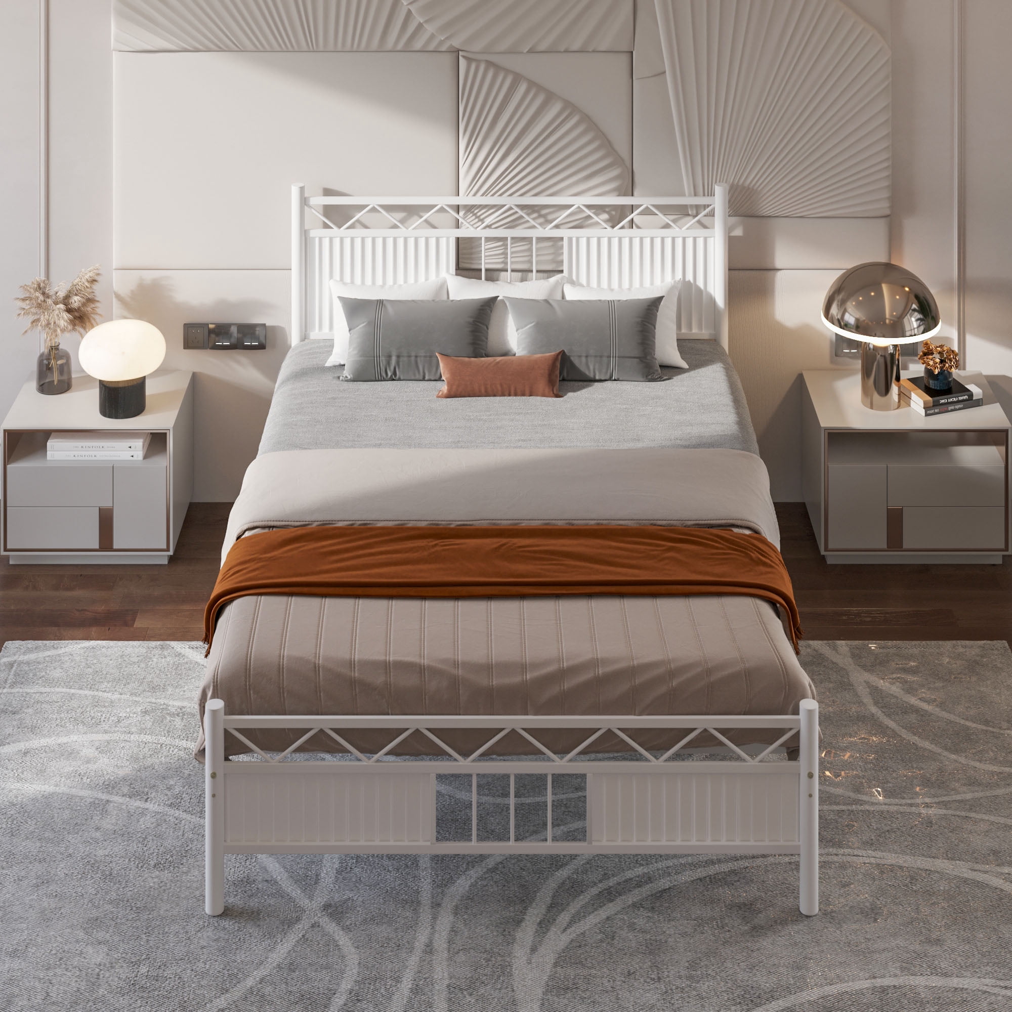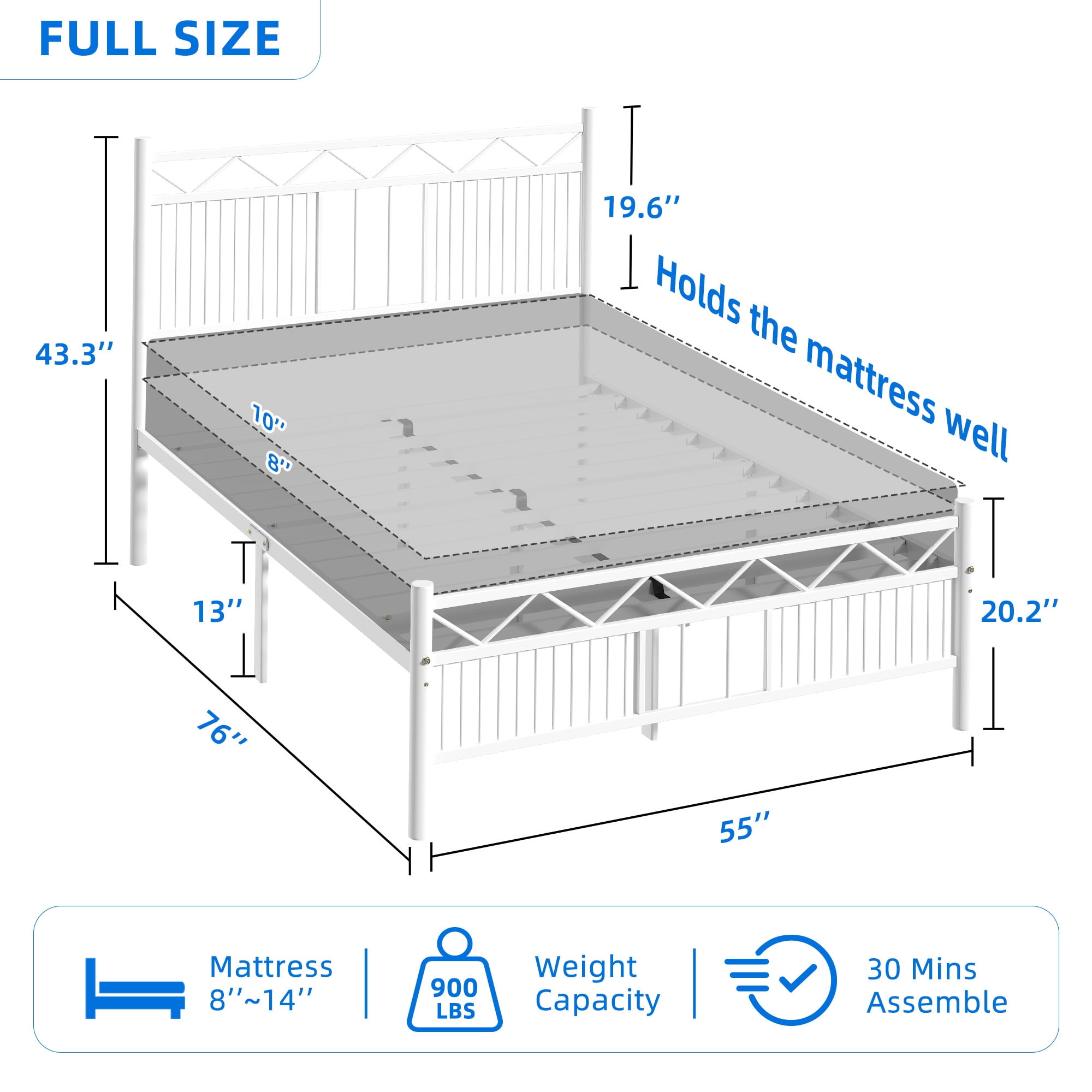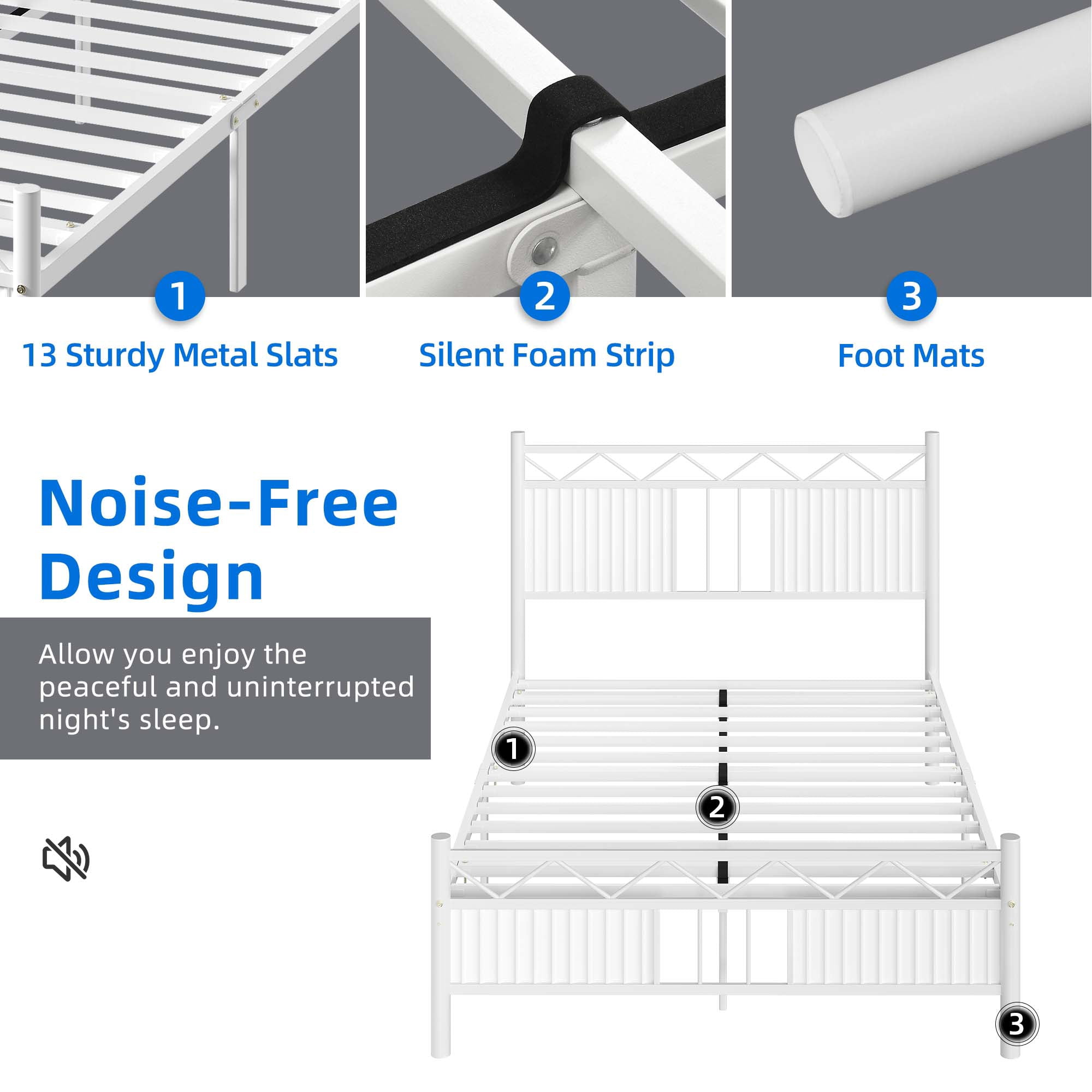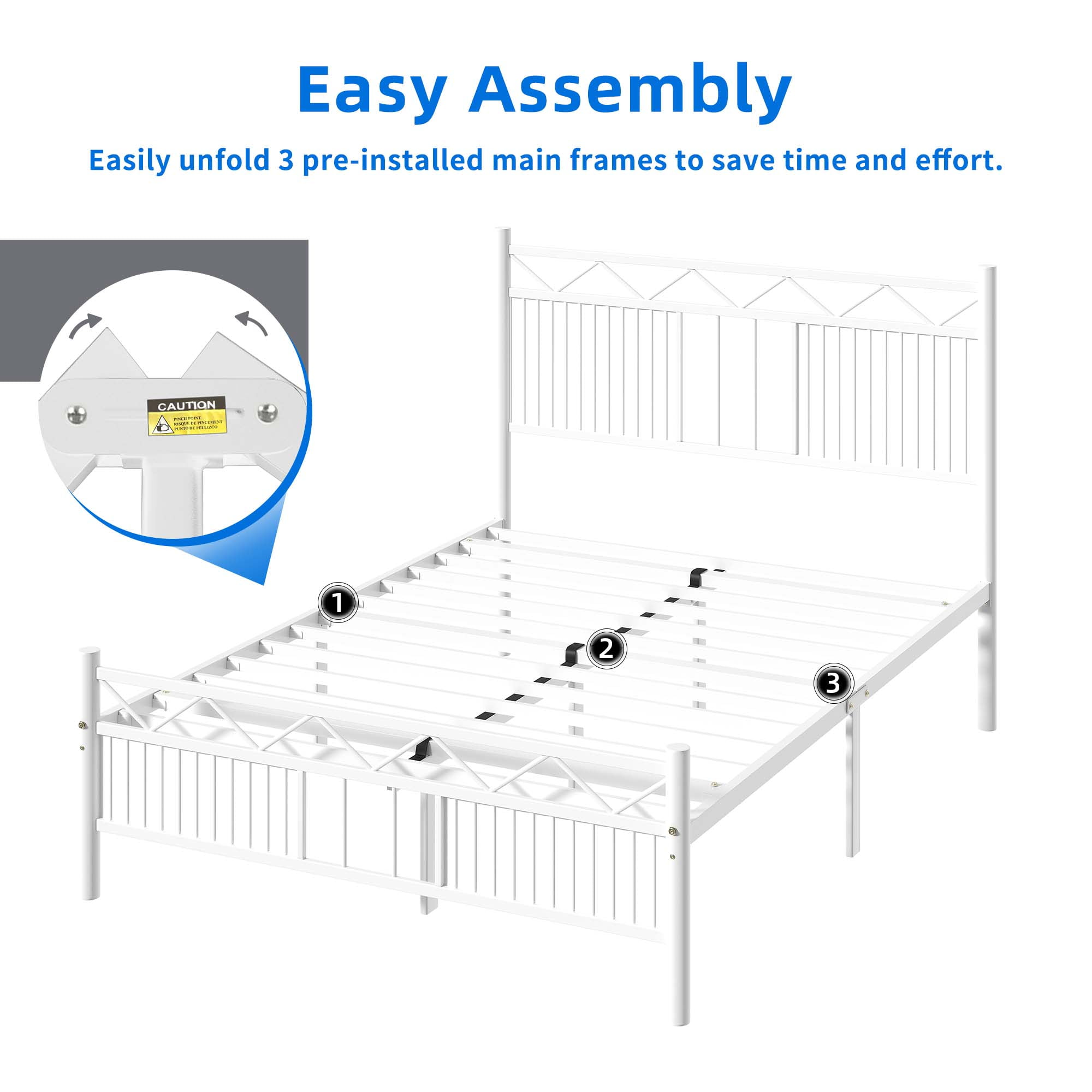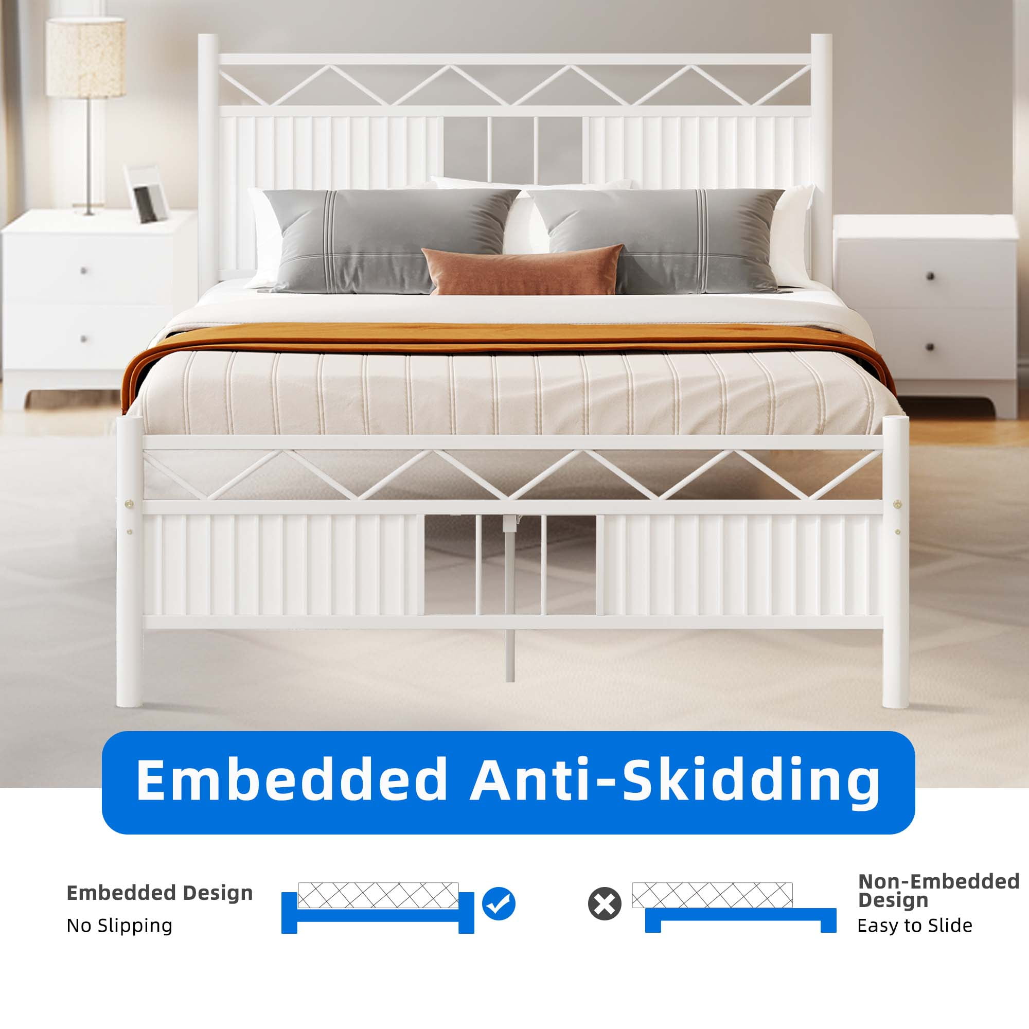 DEXTRUS Industrial Full Size Platform Metal Bed Frame with Headboard, No Box Spring Needed, White