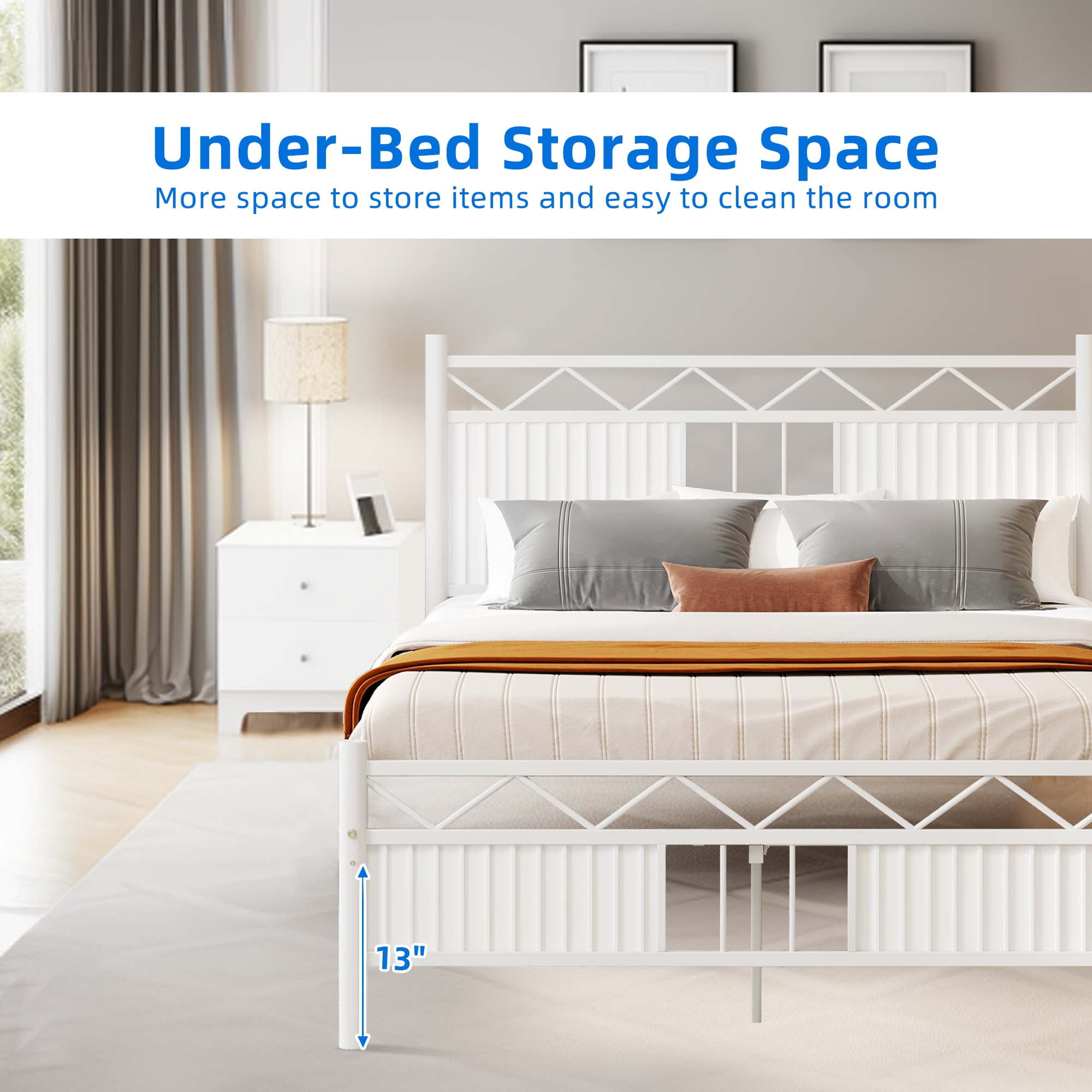 【Minimalist and Stylish Design】Featuring sleek lines and a metallic finish, the metal bed frame exudes a minimalist and stylish design. The faux wooden wave headboard and footboard not only enhance the aesthetics but also ensure the mattress stays securely in place, maintaining a neat and tidy bed. 【Superior Support and Silent Design】Setting it apart from other king bed frames with fewer support legs, the sturdy bed frame is equipped with 13 heavy-duty metal slats and 12 legs, providing exceptional support and long-lasting durability. With a weight capacity of up to 1200lbs, it offers premium support. Additionally, the bed frame incorporates silent strips to eliminate any unwanted squeaks, allowing for a peaceful and uninterrupted sleep experience. 【Elevated Headboard Design】The metal bed frame king boasts a higher headboard compared to alternative options in the market. Standing at a height of 43 inches, it provides additional support and allows you to place a cushion behind your back for added comfort while reading or watching TV in bed. 【Ample Under-Bed Storage】With a generous 13-inch height gap, this platform bed frame offers valuable storage space beneath the bed. It enables you to maximize your living space by easily organizing extra bedding, seasonal clothing, or other items, creating a clutter-free and comfortable room. Age_group: Adult. 【Effortless Assembly】The bed frame includes a detailed. installation manual with assembly serial numbers for each component, ensuring a straightforward and efficient setup process. No additional tools or parts are required.
