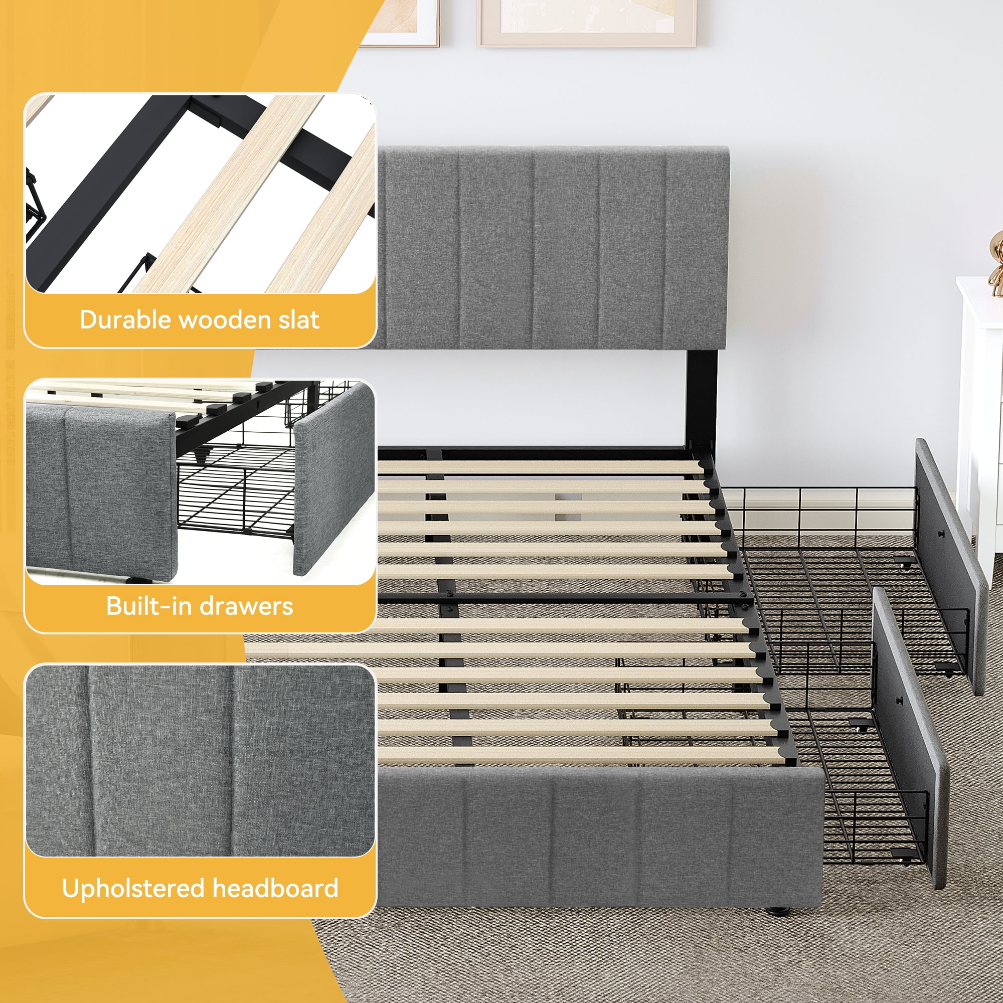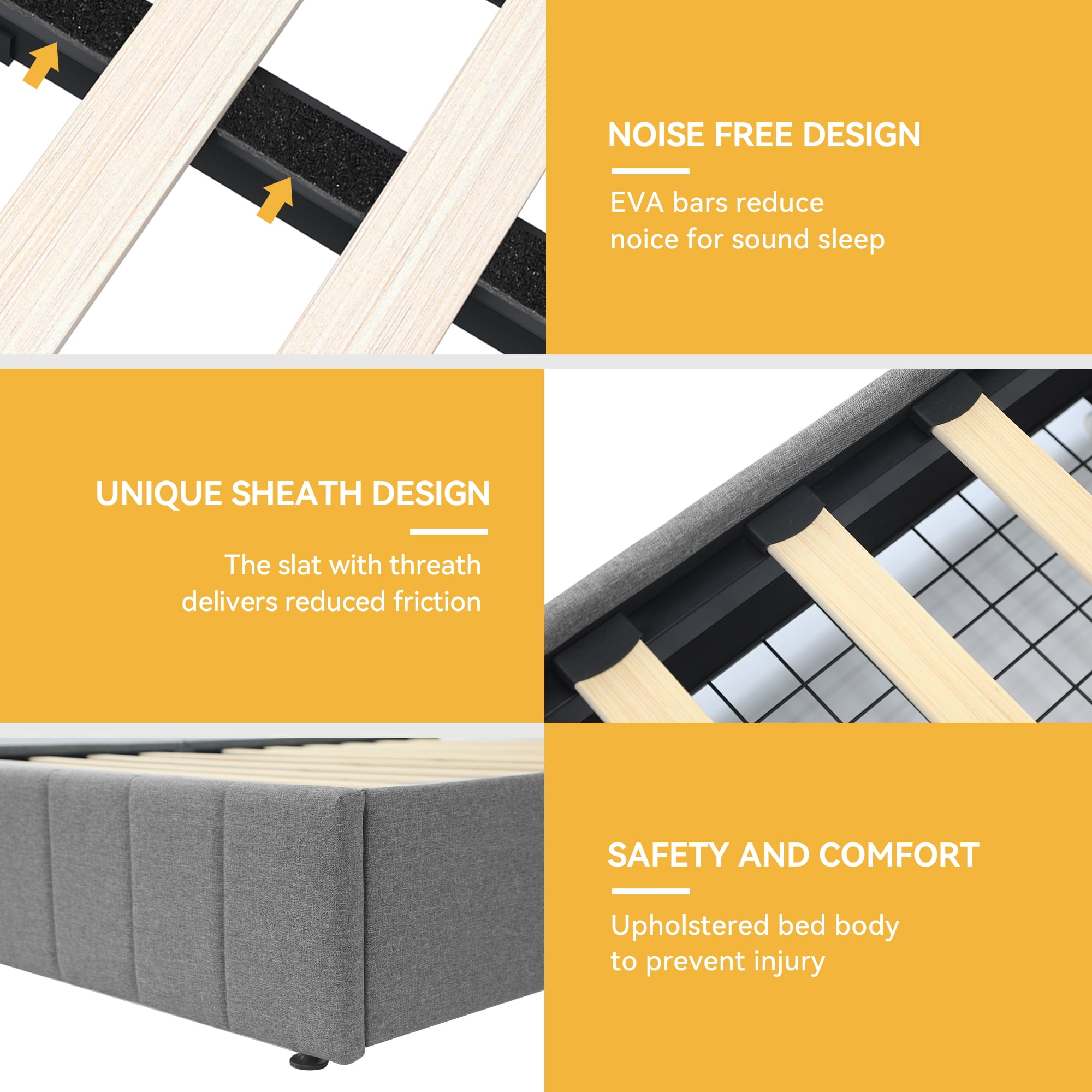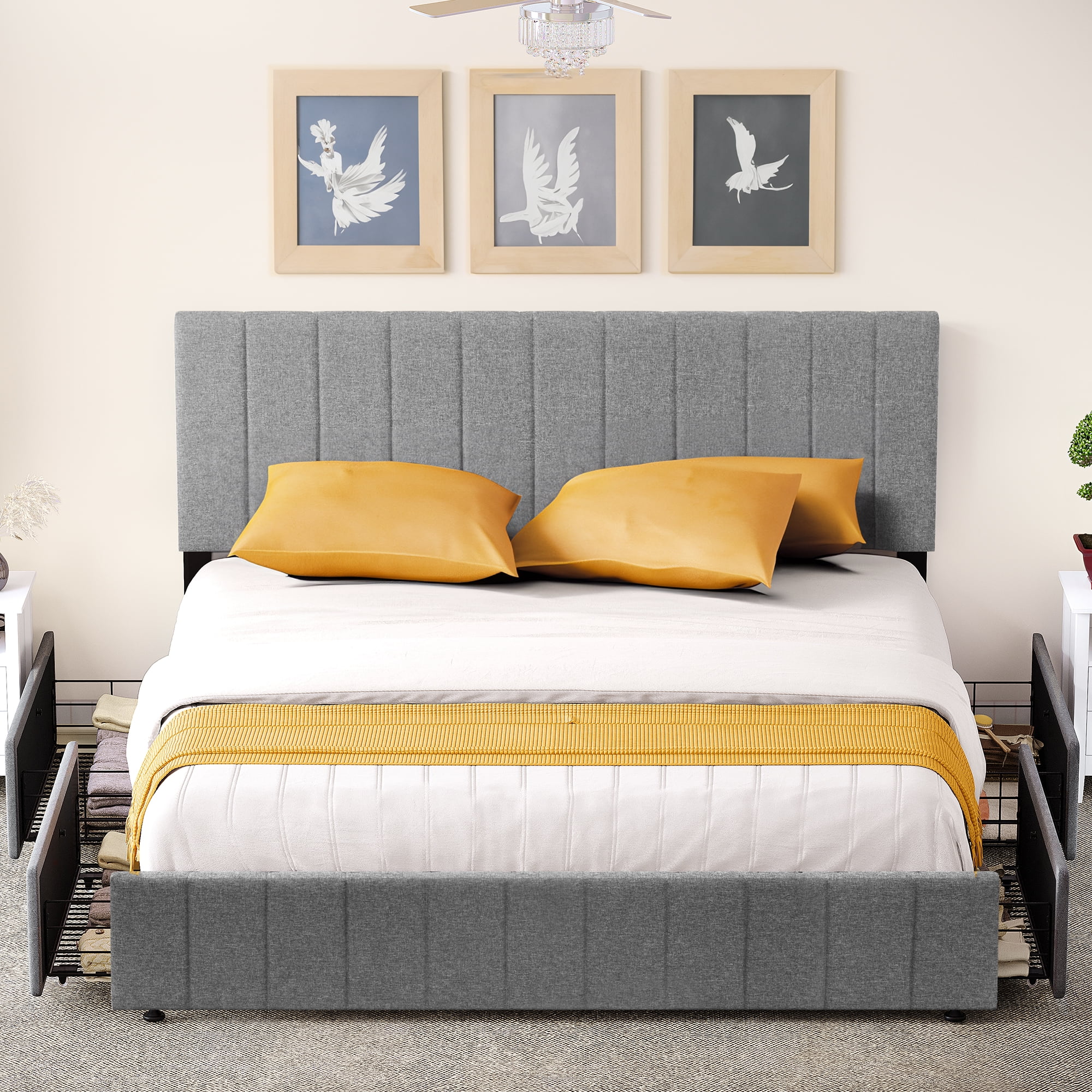 LESS SPACE, MORE STORAGE: This upholstered bed frame boasts 4 storage bins for immense storage capacity; Conveniently store your linens, accessories, off-season clothing, and blankets; All your items are readily available under the bed, saving space while being accessible in a snap. USER-FRIENDLY DESIGN: Silent pads on a metal frame reduce noise for relaxing sleep; The slat has a sheath to reduce friction and strengthen firmness, while the plastic feet protect your floor from scratches; All are designed to add comfort and stability to your sound. DURABLE & STURDY: This king-upholstered storage bed frame combines the solid steel structure with a sturdy fixed wooden slat system for longevity, stability, and weight capacity of 1100lbs without having to worry about scratches or dents; Under the bed are drawers made from high-density steel. QUICK ASSEMBLY: Effortless setup of this king-size bed frame with 4 drawers using the included instructions, assembly tools, and numbered parts; Contact us with any questions and we’ll reply in 24 hours. ADJUSTABLE HEADBOARD: The king bed’s headboard has holes for up to 10cm adjustment to perfectly accommodate the thickness of your mattress; Covered in linen fabric that’s breathable for lasting use; Enjoy comfortably reading or watching TV in bed.