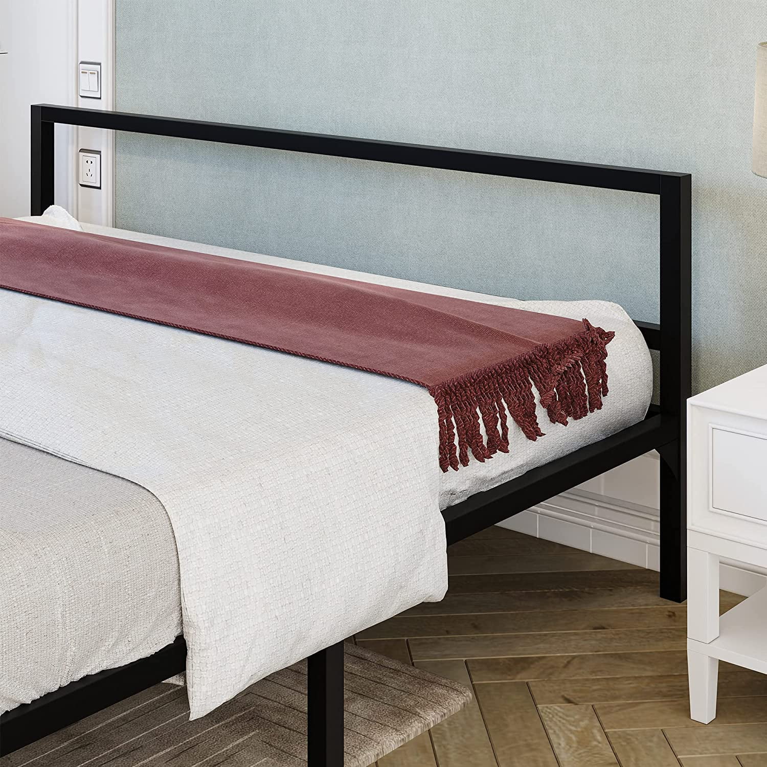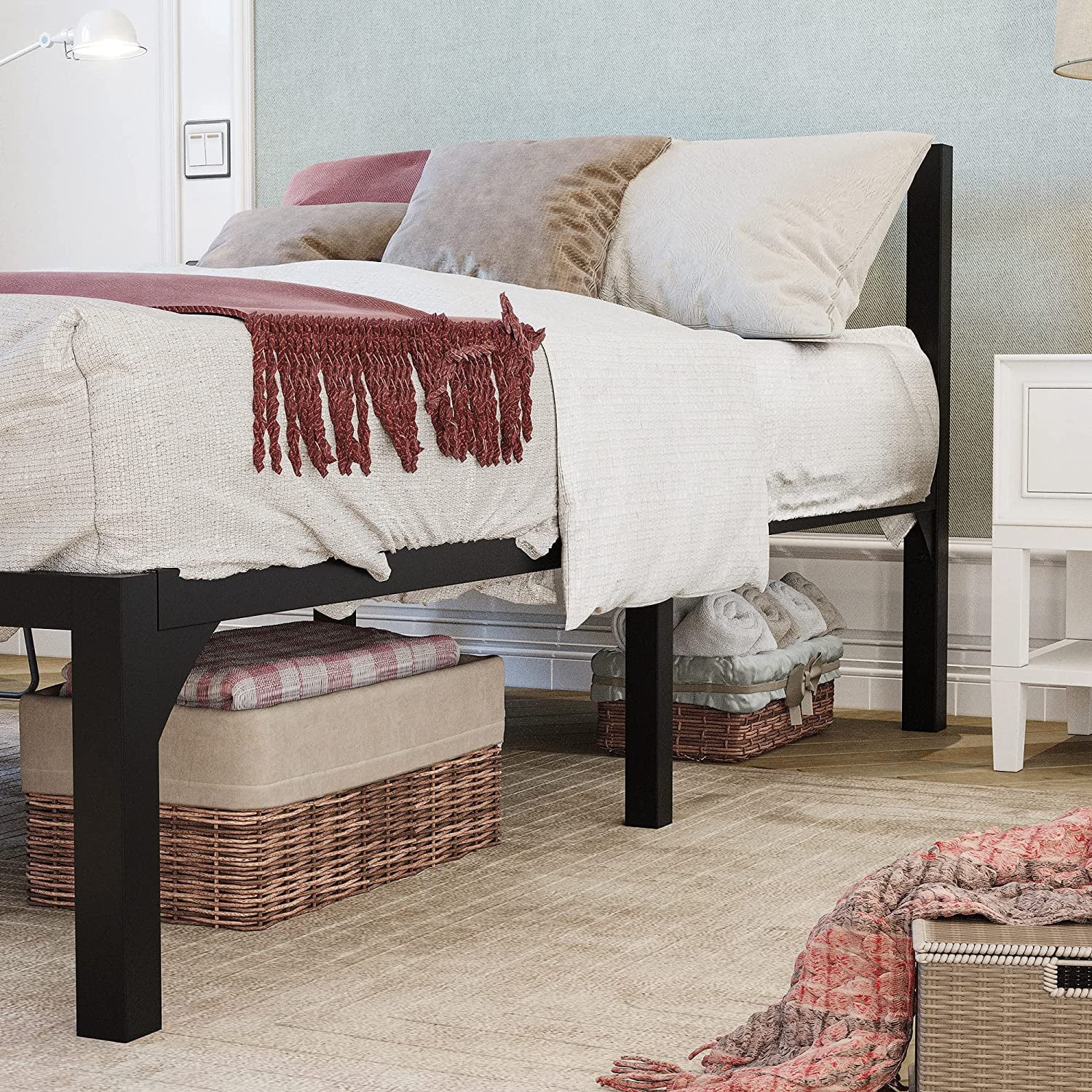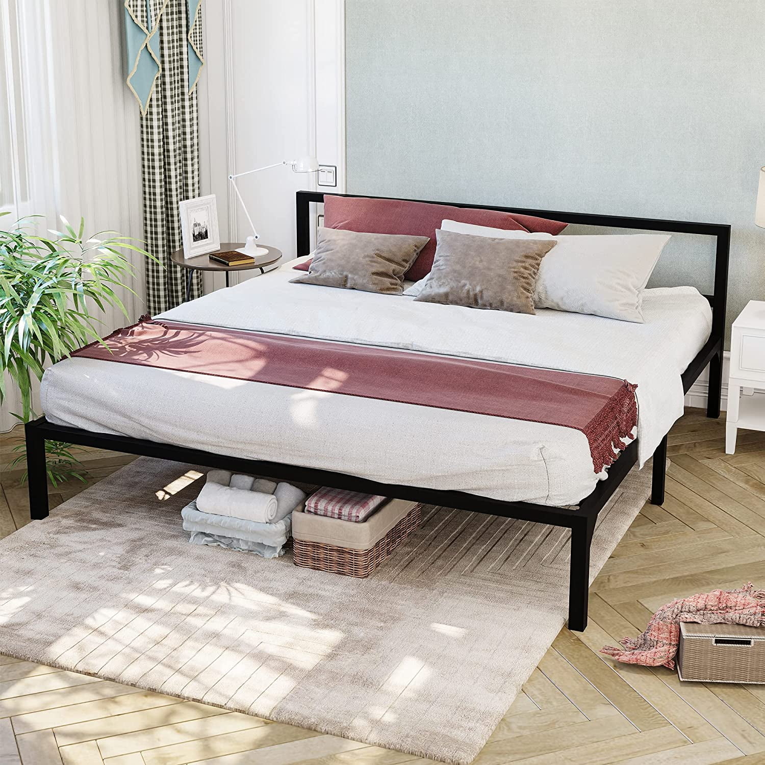 STURDY METAL FRAME – Features a thick & sturdy metal frame constructed from premium iron to provide product with a longer lifespan; King bed’s overall dimensions are 80” L x 76” W and can support up to 1100 lbs; The weight capacity is calculated as an average after covering a 0.59-inch MDF UNDER BED STORAGE – All sizes are 14 inches platform bed; Below the steel bed frame is storage space up to 12-inches tall where you can store your boxes, suitcase or toys; Provides more space when tidying up your bedroom UPGRADED SLATS – Distance between slats: twin/full – 5.31”, queen/king – 5.98 ”; Sturdy slats provide strong support and prevent the mattress from sagging; This extends your mattress lifespan; The central bar’s non-slip foam tape prevents the metal slats from making noise; A minimalist aesthetic for a cozy and sound sleep NO BOX SPRING NEEDED – Easy to assemble due to the minimalist design; Central bar’s non-slip foam tape prevents sturdy steel slats from making noise; Directly place a mattress pad on the frame, no box spring required ENJOY SOUND SLEEP – The double cross rails near the headboard and the supportive legs in the center improve overall stability; Middle bed legs are upgraded, and the metal bed and foot pads are anti-scratch and anti-flipping for top-notched comfort; anti-scratch foot pads keep the floor or mats free from harm NOTE – Please follow the instructions, professional installation and paired with spring mattress are recommended. Do not jump on the bed.