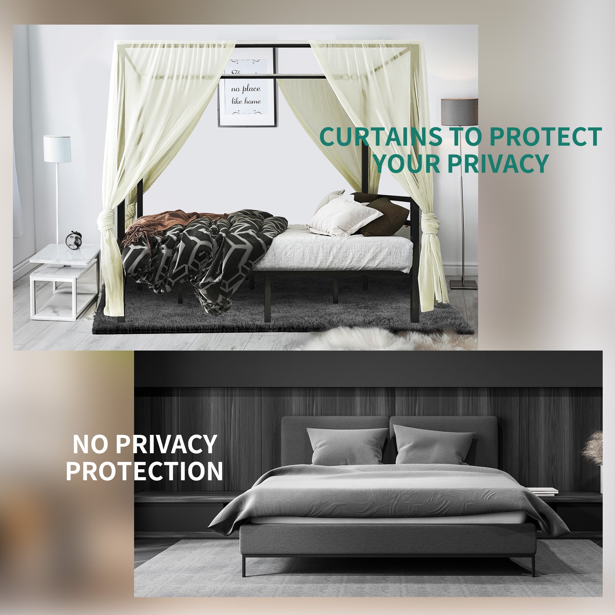 This platform bed is manufactured with heavy duty metal material and features highly supportive legs for increased stability.Enough storage space underneath the bed frame for you to store boxes, suitcase and others.Intensive gaps between the slats maximize weight capacity and prevents the mattress from sagging.Round bars are more gentle and soft to set up curtains or decor lights, and this canopy bed frame offers life enjoyment in variety.Velco design reduces difficulty and time of assemble a lot and offers noise-free relax environment. Floor protectors offers a noise-free and keep your floor or mats from wearing out for your sound sleep. Specifications Color: Black Size: King Material: Wooden slat Item Weight: 83.25 Pounds Maximum Weight Recommendation: 900 Pounds Product Dimensions : 82″L x 76″W x 72″H