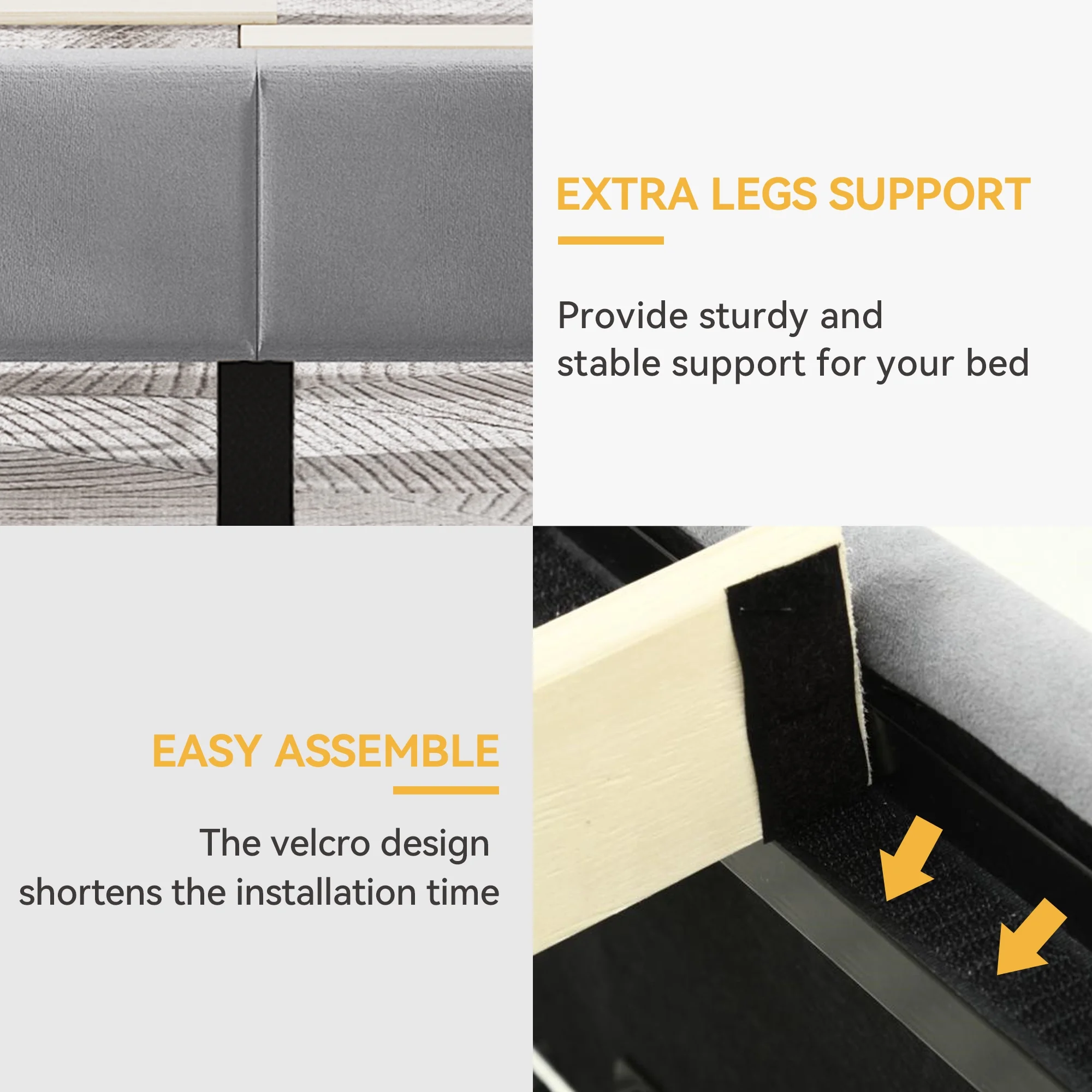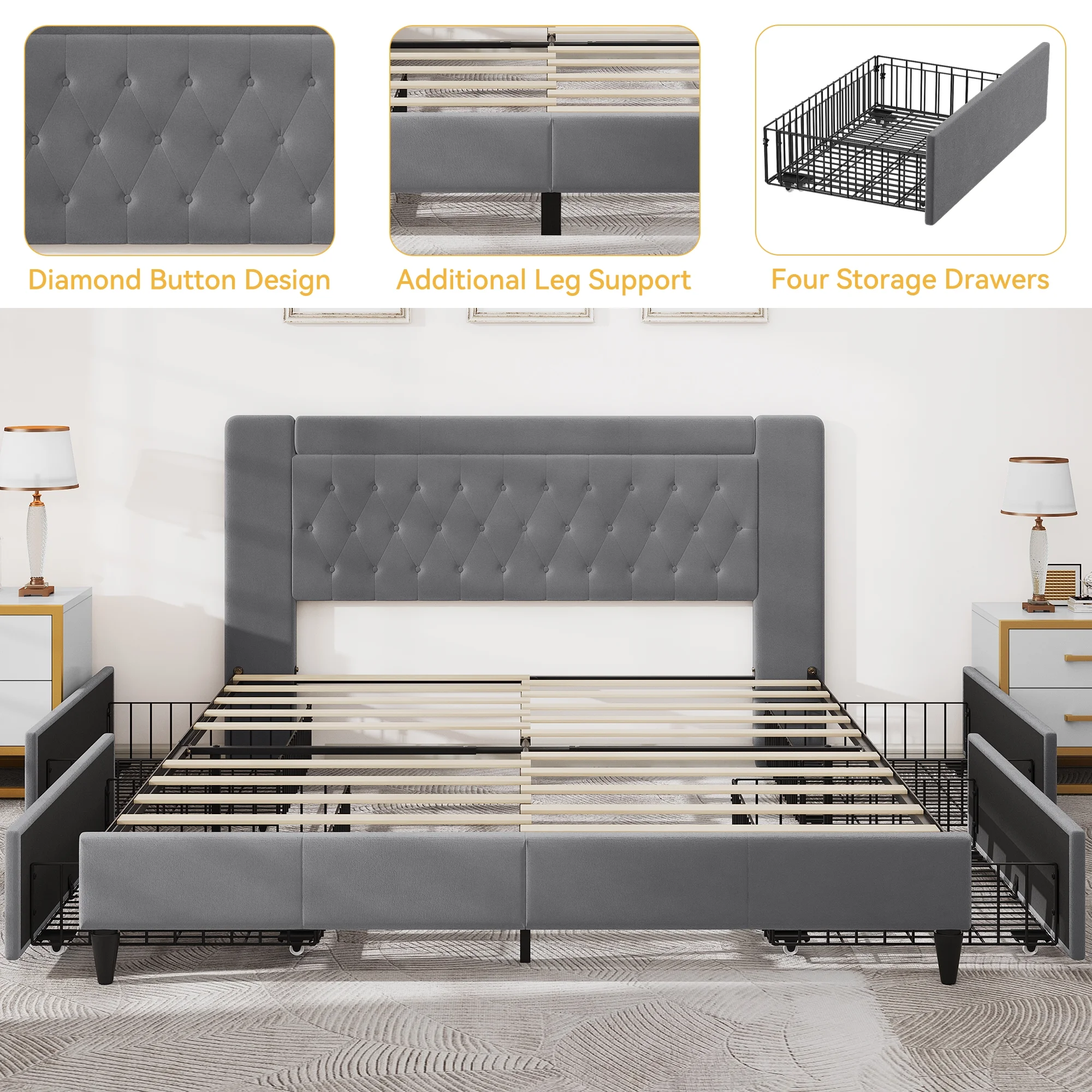 Efficient Storage Solution: This king size bed frame offers four spacious bottom drawers, providing ample storage for bed linen, clothing, and more. With easy-to-use wheels, the drawers slide in and out effortlessly, ensuring convenient access to your belongings. Elegant Headboard Design: Elevate the aesthetic appeal of your bedroom with this platform bed featuring a unique headboard. The charming diamond pattern and button tufting add a touch of sophistication to any room. The headboard stands at a height of 46.4 inches, perfectly complementing your mattress. Aesthetic and Comfortable: Experience both style and comfort with this grey upholstered bed frame. The square-stitched detailing, plush sponge filling, and luxurious velvet finish provide a soft and comfortable surface to lean back on. Enhance the overall look of your bedroom while enjoying a cozy rest. Robust and Silent: Rest assured on this sturdy storage bed, constructed with a durable metal frame and reliable wooden slats. No need for a box spring as this bed provides exceptional support and stability. The internal metal frame incorporates a silent strip design, ensuring a peaceful and undisturbed sleep. Easy Assembly and Support: Setting up this king bed frame with drawers is hassle-free. All components are labeled, and the package includes installation tools and clear instructions for straightforward assembly. If you have any concerns, our dedicated customer service team is readily available to assist you. Transform your bedroom with style, functionality, and ease.