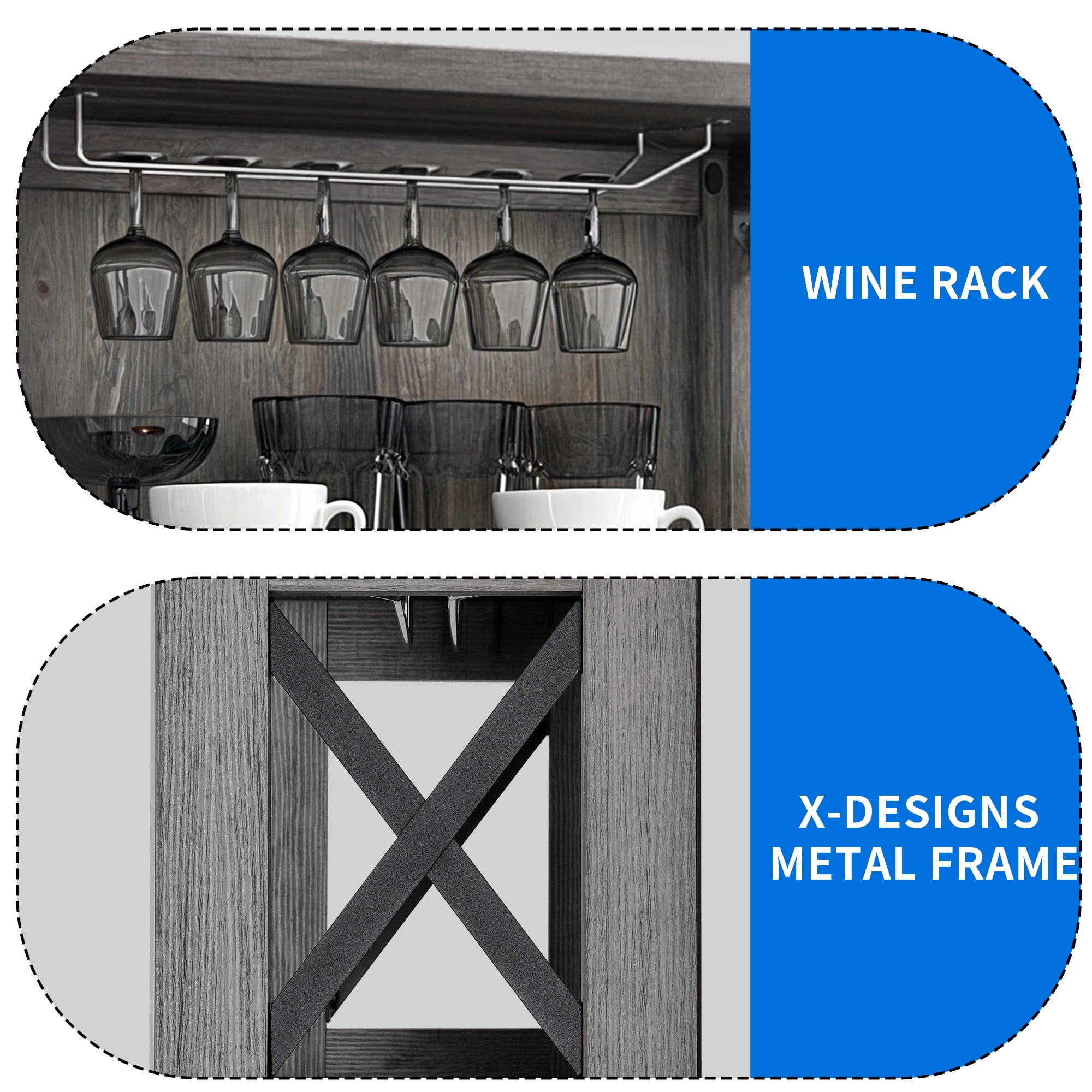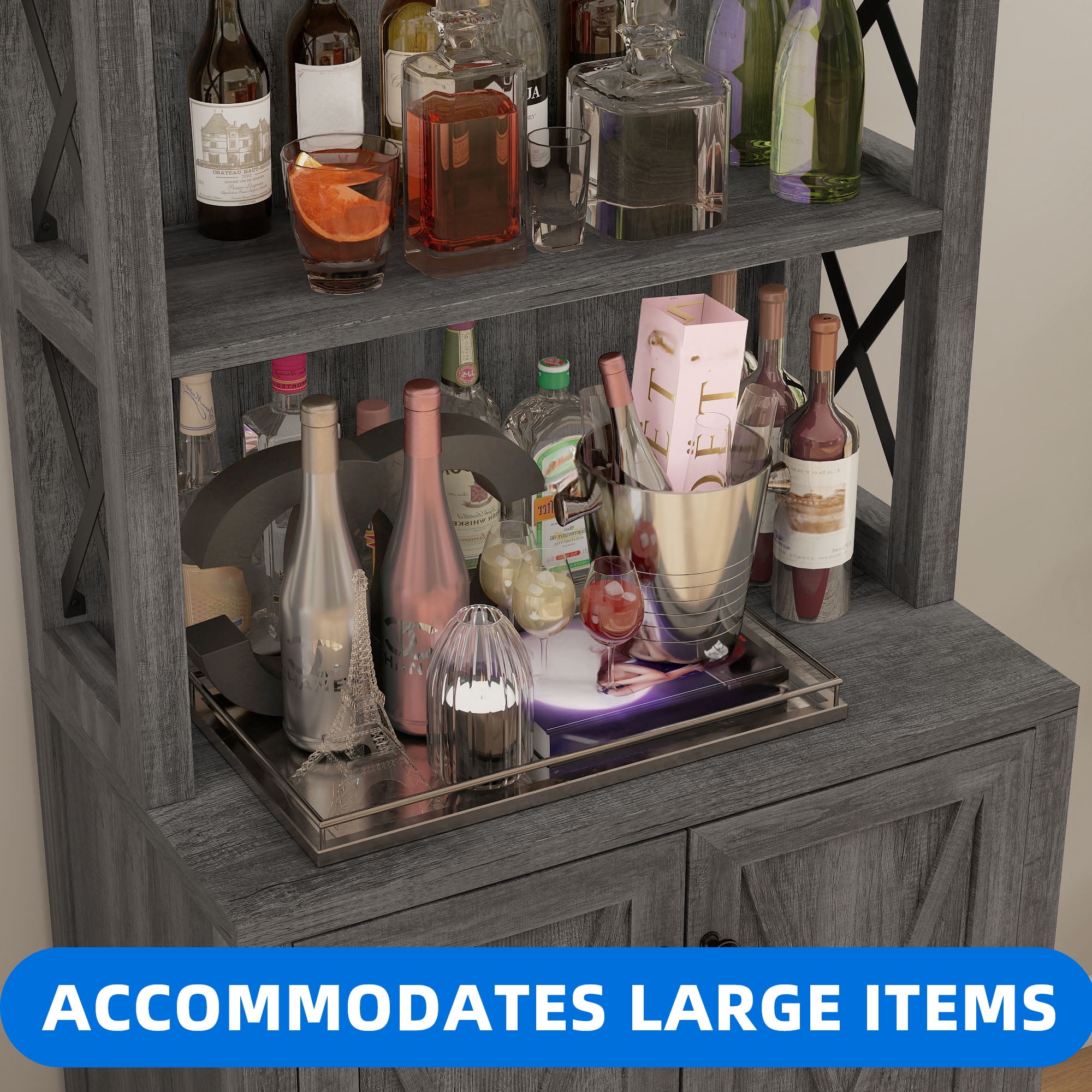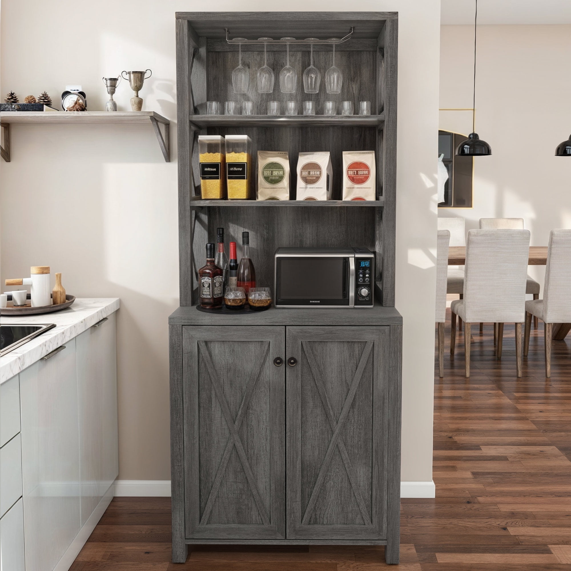 VERSATILE TALL CABINET: Dextrus bar cabinet combines open storage shelves and a concealed 3-tier cabinet, serving as a home bar, microwave stand, buffet, sideboard, or coffee station. It works well in the kitchen, pantry, dining room, living room, or bar. TONS OF STORAGE: Organize everything efficiently in this liquor bar cabinet. It offers an upper wine rack for hanging wine glasses, 3 open shelves for coffee makers, toasters, decor, and an enclosed cabinet with 3-tier shelves to keep items tidy. RUSTIC ELEGANCE: Elevate your living space with this bar cabinet’s chic dark grey finish and stylish X pattern, infusing your room with innovative charm while maximizing your storage. ENHANCED STABILITY: Crafted from robust P2 grade engineered wood and featuring X-shaped metal supports, this bar cabinet delivers a sturdy load capacity and wobble-free performance. HASSLE-FREE ASSEMBLY & SUPPORT: Enjoy a seamless setup with included hardware and clear instructions. For any inquiries, reach out via email, and we’ll promptly address your concerns with a satisfying solution. Product Weight: 78 Pounds
