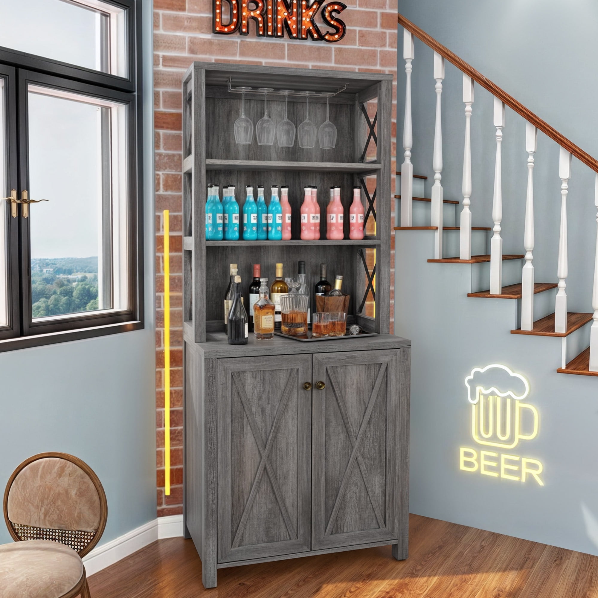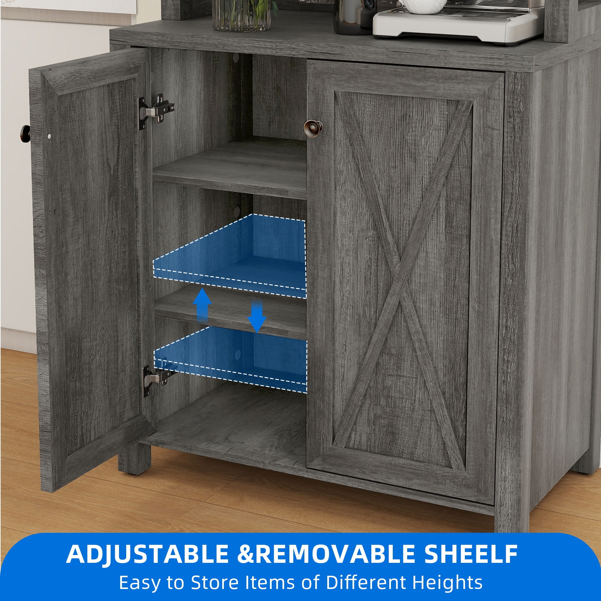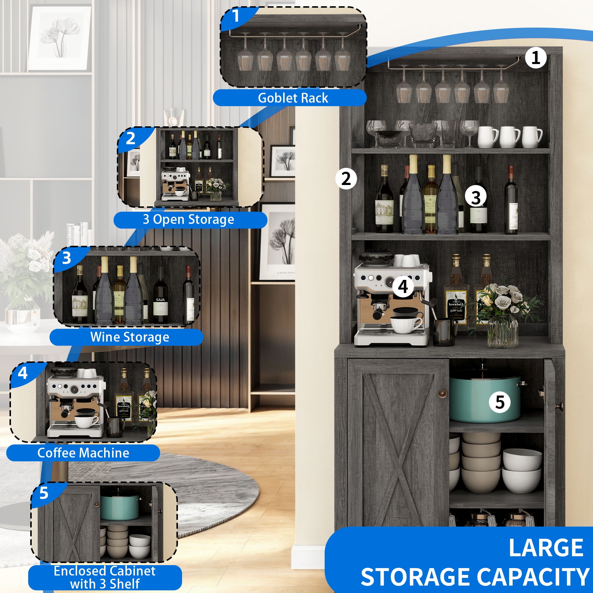 VERSATILE TALL CABINET: Dextrus bar cabinet combines open storage shelves and a concealed 3-tier cabinet, serving as a home bar, microwave stand, buffet, sideboard, or coffee station. It works well in the kitchen, pantry, dining room, living room, or bar. TONS OF STORAGE: Organize everything efficiently in this liquor bar cabinet. It offers an upper wine rack for hanging wine glasses, 3 open shelves for coffee makers, toasters, decor, and an enclosed cabinet with 3-tier shelves to keep items tidy. RUSTIC ELEGANCE: Elevate your living space with this bar cabinet’s chic dark grey finish and stylish X pattern, infusing your room with innovative charm while maximizing your storage. ENHANCED STABILITY: Crafted from robust P2 grade engineered wood and featuring X-shaped metal supports, this bar cabinet delivers a sturdy load capacity and wobble-free performance. HASSLE-FREE ASSEMBLY & SUPPORT: Enjoy a seamless setup with included hardware and clear instructions. For any inquiries, reach out via email, and we’ll promptly address your concerns with a satisfying solution. Product Weight: 78 Pounds