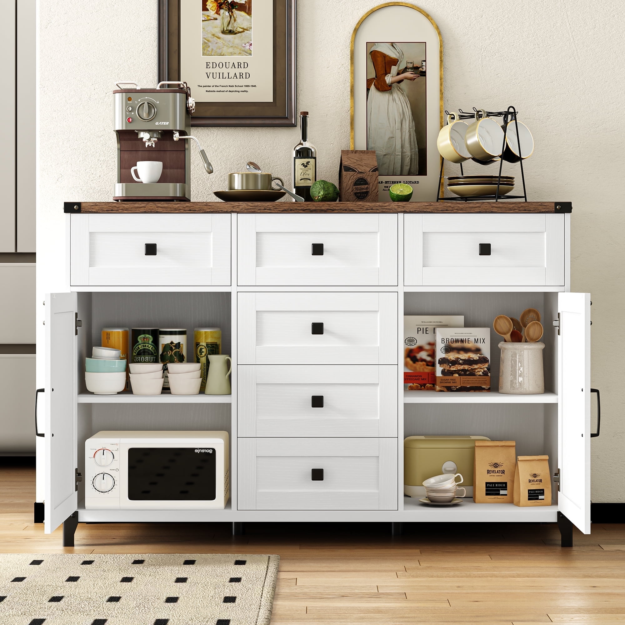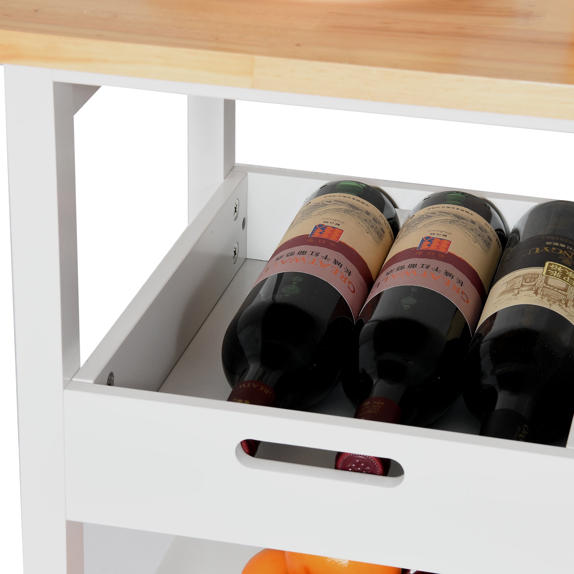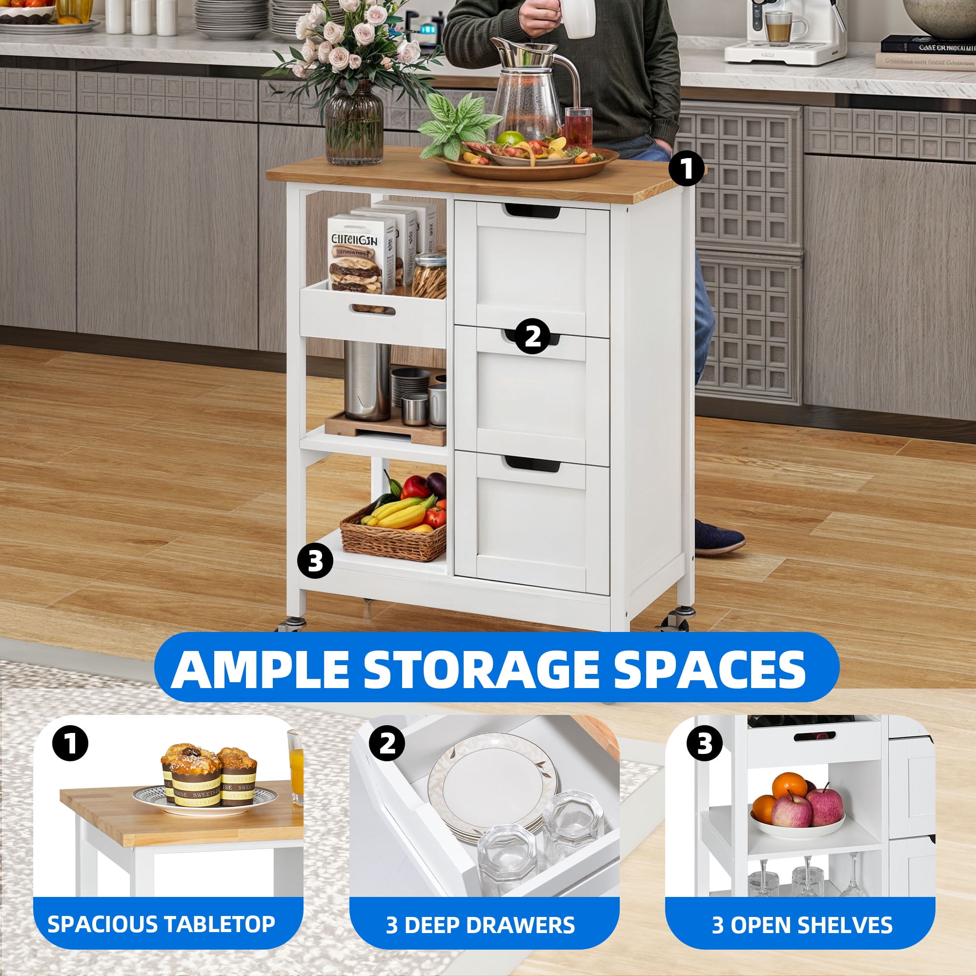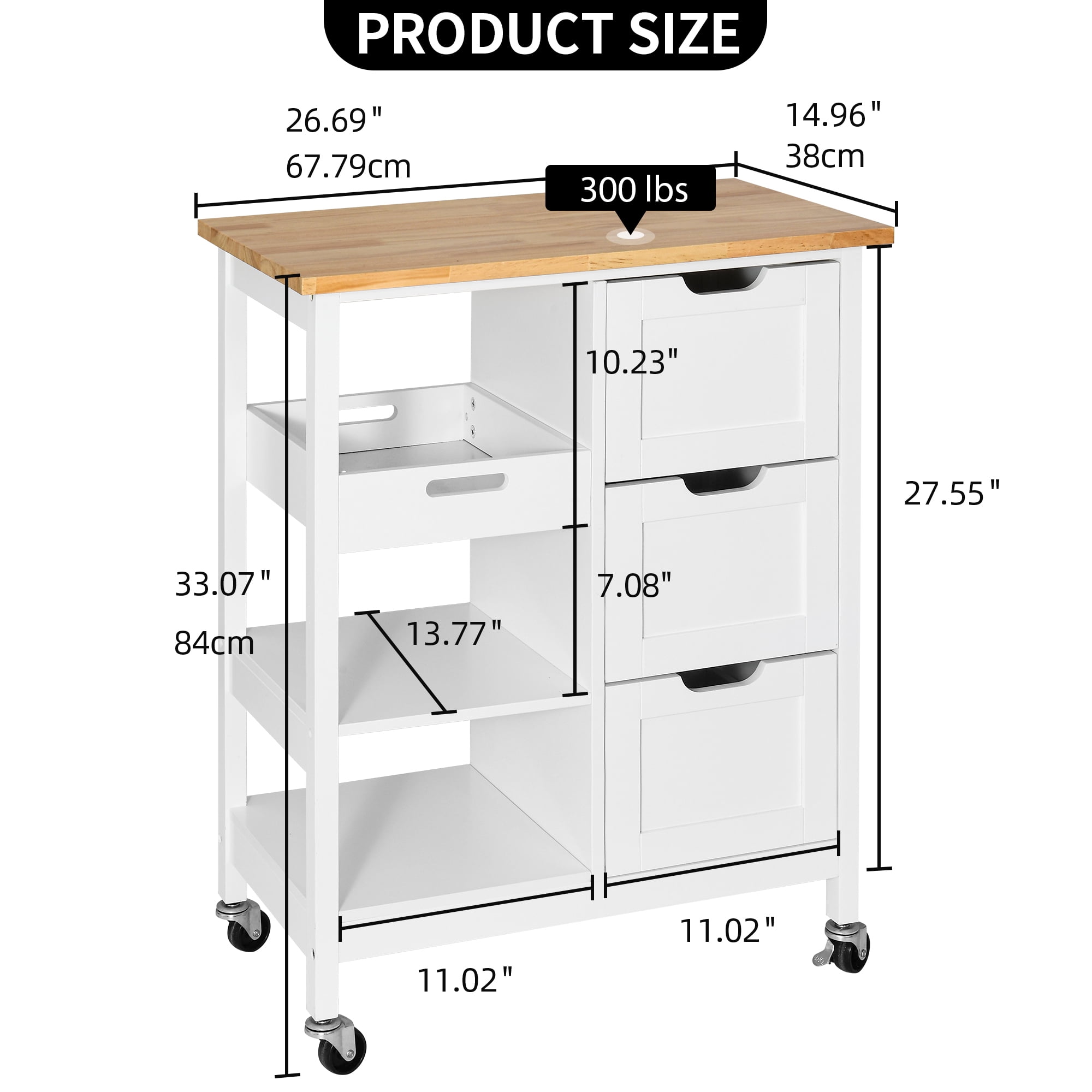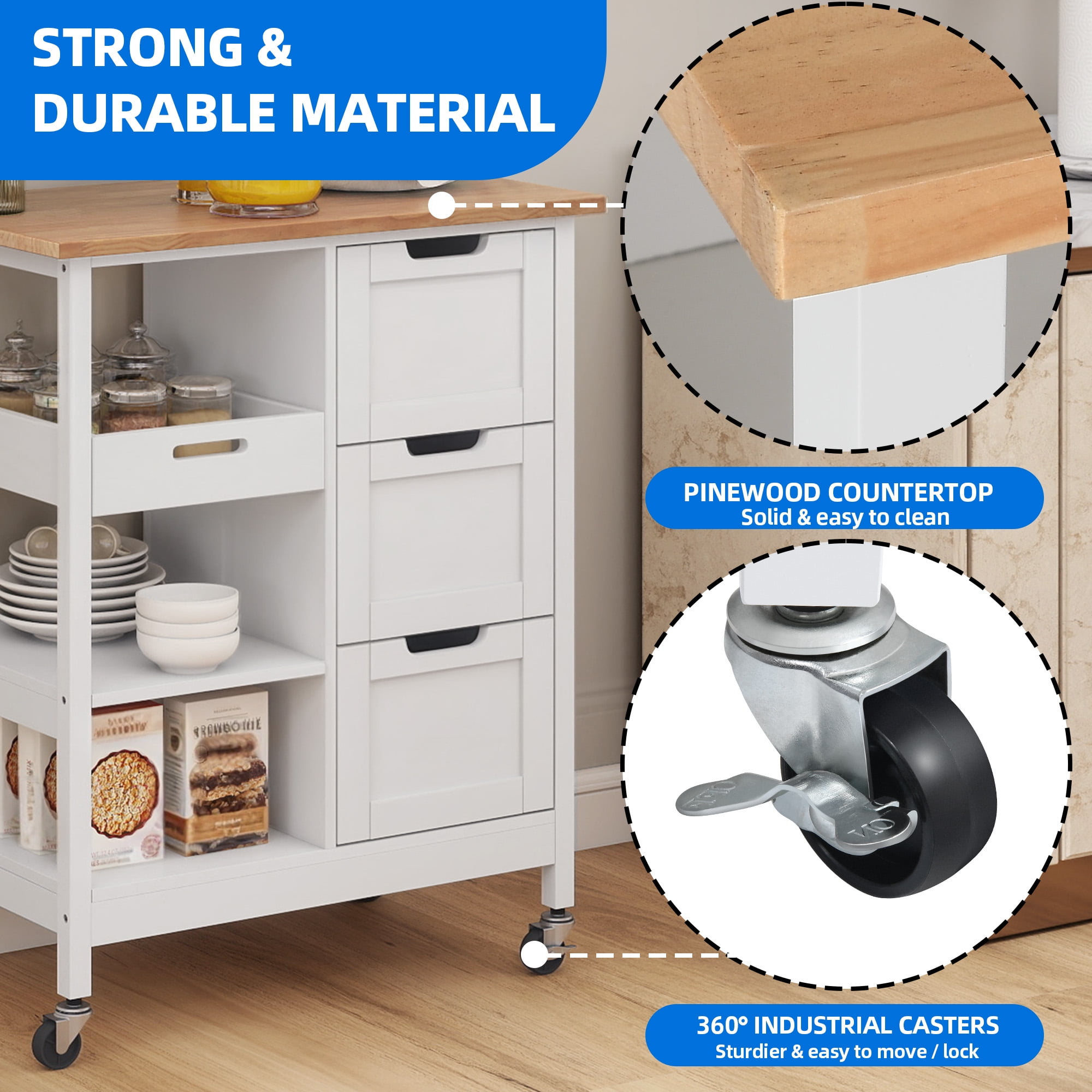 [Multi-functional Kitchen Mobile Cart]: Elevate your kitchen experience with this versatile kitchen cart, designed to provide additional storage space. Whether you need to accommodate kitchen utensils, prepared foods, or create a stylish coffee bar to house your prized coffee beans and supplies, this cart has got you covered. Its mobility allows for effortless navigation around your kitchen, dining room, or even the garden, ensuring delightful meals and tea time with your beloved family and friends. [Ample Storage Space]: The spacious top surface of this rolling kitchen island serves as a versatile cutting board or a shelf for your microwave oven. Additionally, it features 3 open storage shelves and 3 pull-out drawers, providing ample room to organize your utensils, pots, bowls, and ladles, creating a clutter-free cooking space. [Waterproof and Scratch-Resistant]: Crafted with a thick pine top and supported by four sturdy legs made from P2 grade MDF, this cart guarantees stability while effortlessly supporting up to 300 pounds without any wobbling. Its smooth food-safe surface is not only waterproof but also scratch-resistant, ensuring easy cleaning and a hygienic environment for food preparation. [360° Swivel Casters]: Equipped with 360° industrial swivel wheels that can effortlessly glide to wherever it’s needed. These wheels are exceptionally durable and can withstand heavy loads without breaking, surpassing the strength of other plastic alternatives. Moreover, 2 lockable casters provide enhanced stability when the cart is stationary. [Easy to install]: we provide clear instructions and the necessary tools to ensure a seamless installation process. Our commitment to delivering quality products and exceptional customer service means that any issues you may encounter will be promptly resolved to your utmost satisfaction.