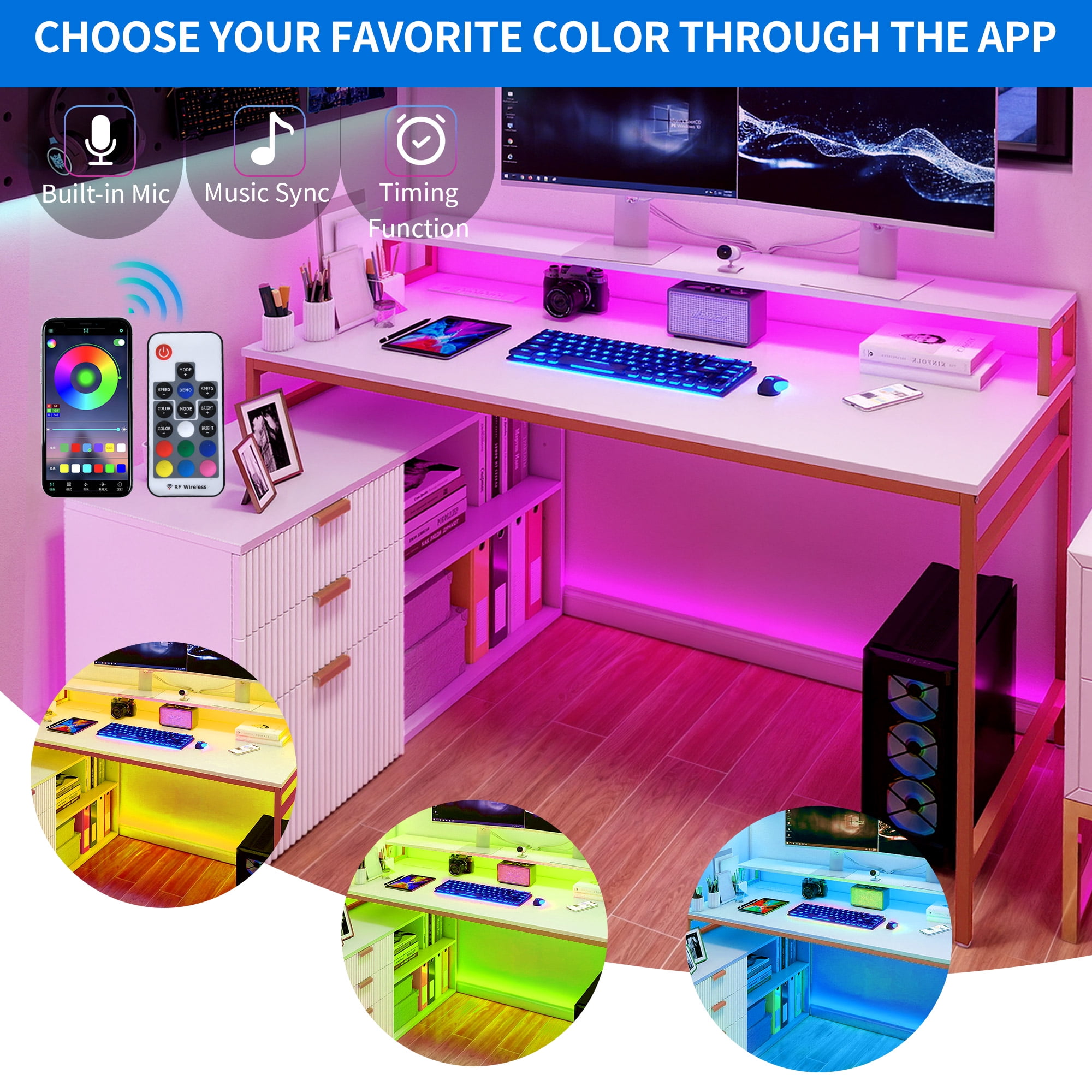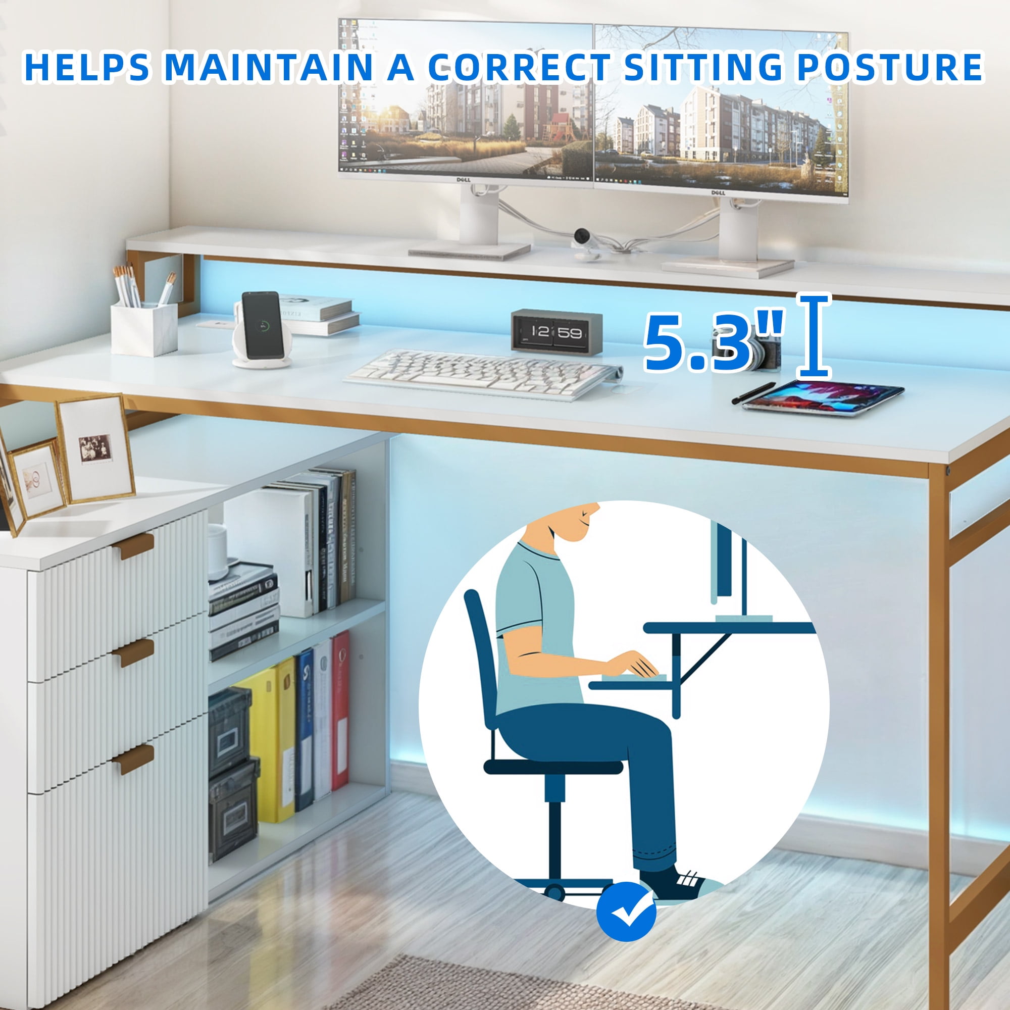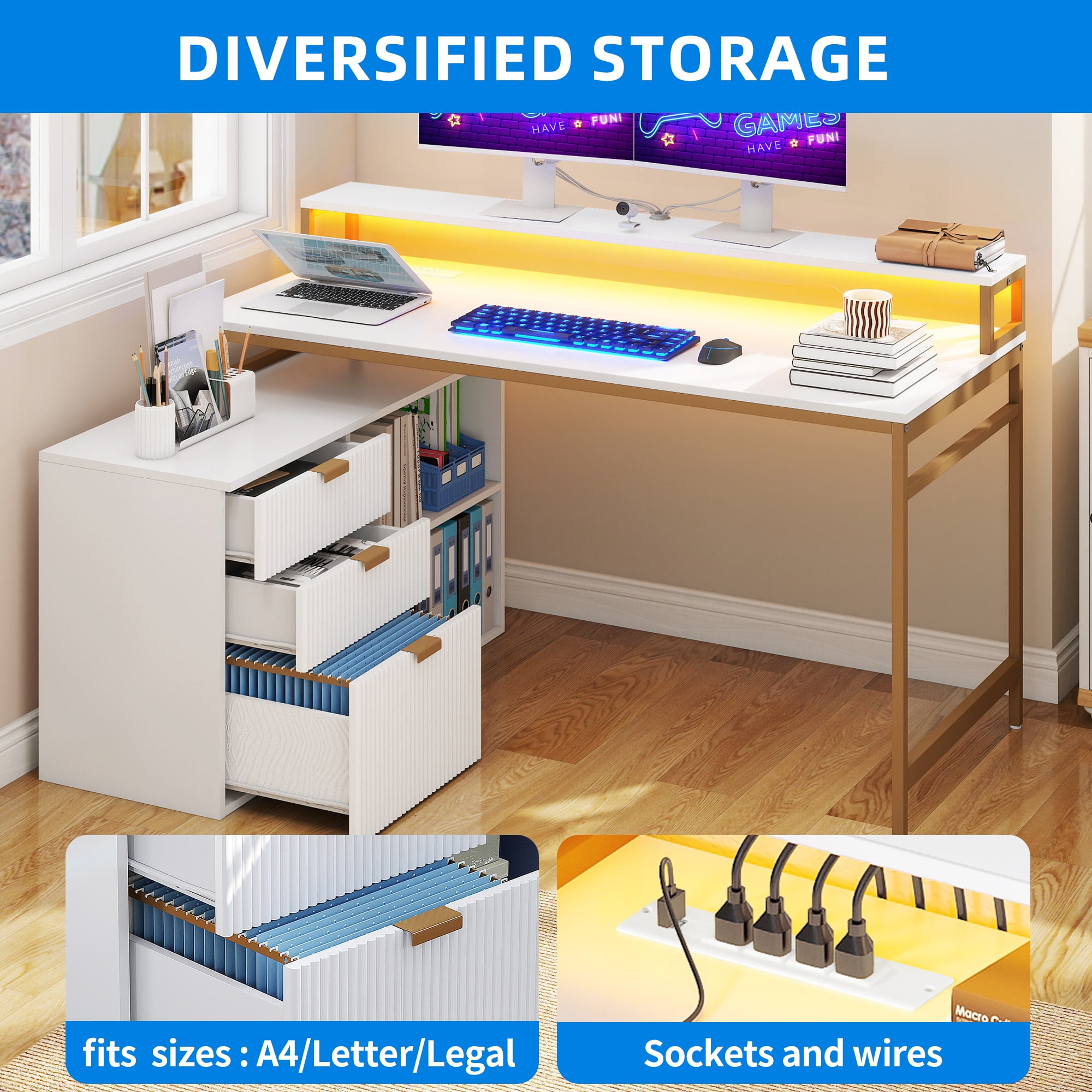 CONVENIENCE AT YOUR FINGERTIPS: Our L-shaped computer desk is equipped with 2 USB ports, 4 power outlets, and a lengthy 6.56ft power cord, it’s your one-stop charging station for laptops, tablets, printers, and more. ILLUMINATE YOUR WORKSPACE: This L-shaped desk’s RGB LED light strip is stunning. Control it via a phone app or remote, and let your creativity flow with customizable colors, music sync, and timer modes. Inspire yourself while you work. OPTIMIZE SPACE AND ORGANIZATION: This 2-in-1 corner desk combines a computer desk with a file cabinet, offering versatile storage. With adjustable file drawers, spacious shelves, and extra hooks, you can keep your workspace tidy and efficient. EXPAND YOUR WORKING AREA: Enjoy a generous work surface with our white computer desk, featuring a wide 55.1″L x 22.04″W desktop. Enhance your comfort with a monitor stand and keep your essentials close at hand on the open shelf. BUILT TO LAST: Crafted from high-grade particle board with a scratch-resistant finish, our white corner desk ensures long-lasting durability. Supported by a sturdy 1.57″ x 0.79″ heavy-duty gold metal frame, it combines functionality with a touch of modern charm. Age_group: Adult