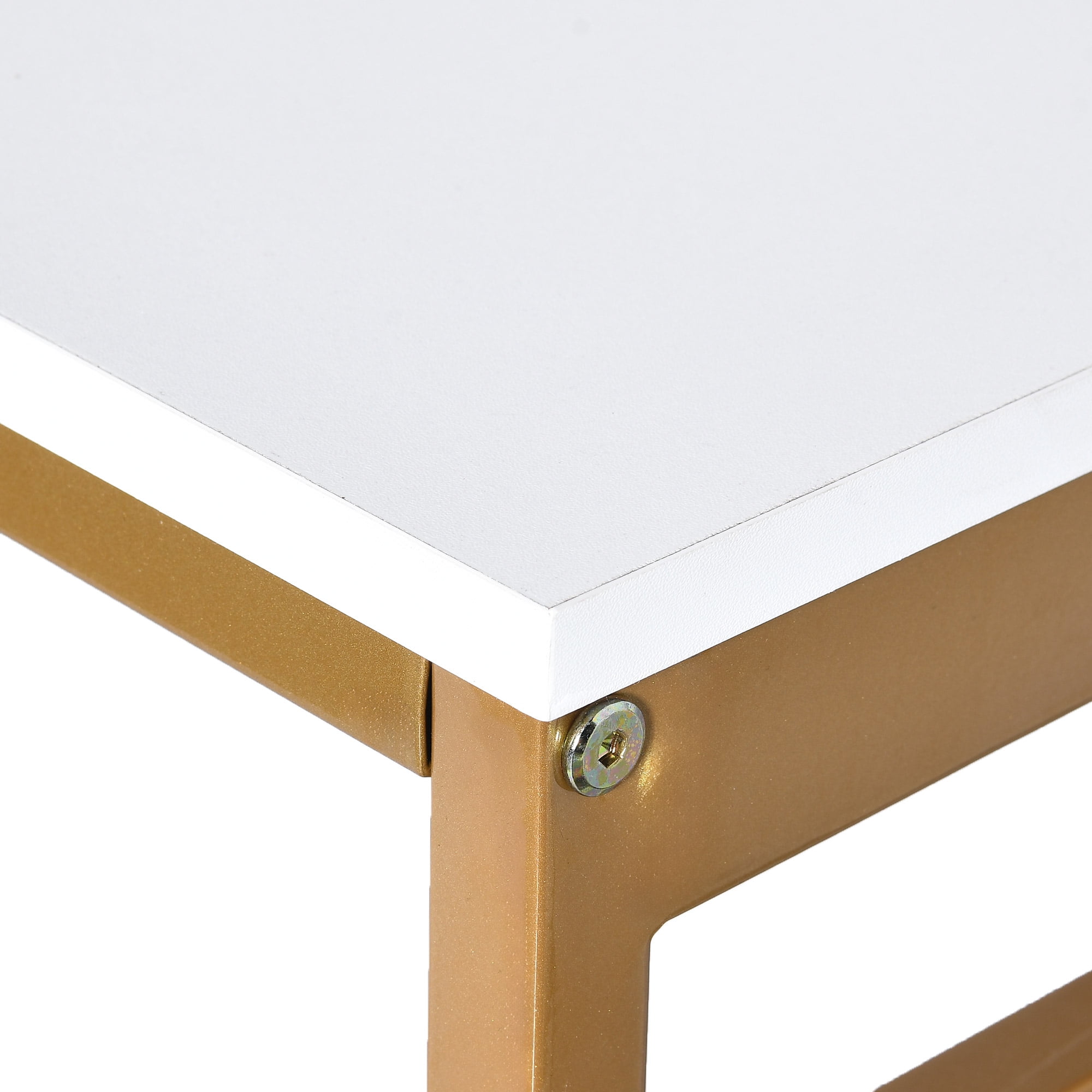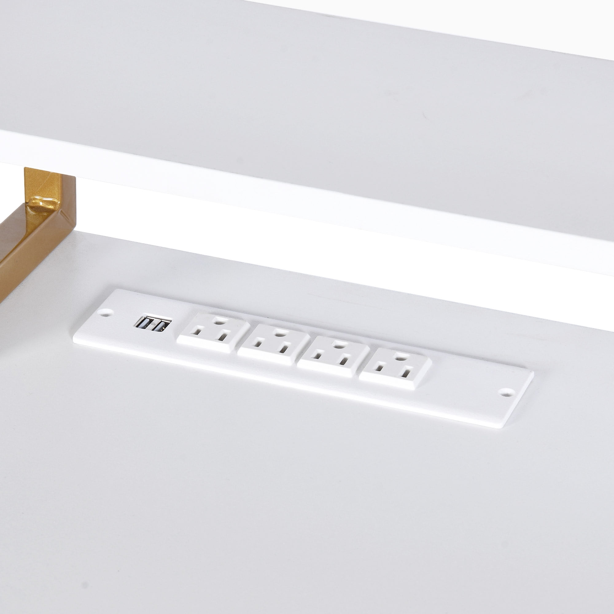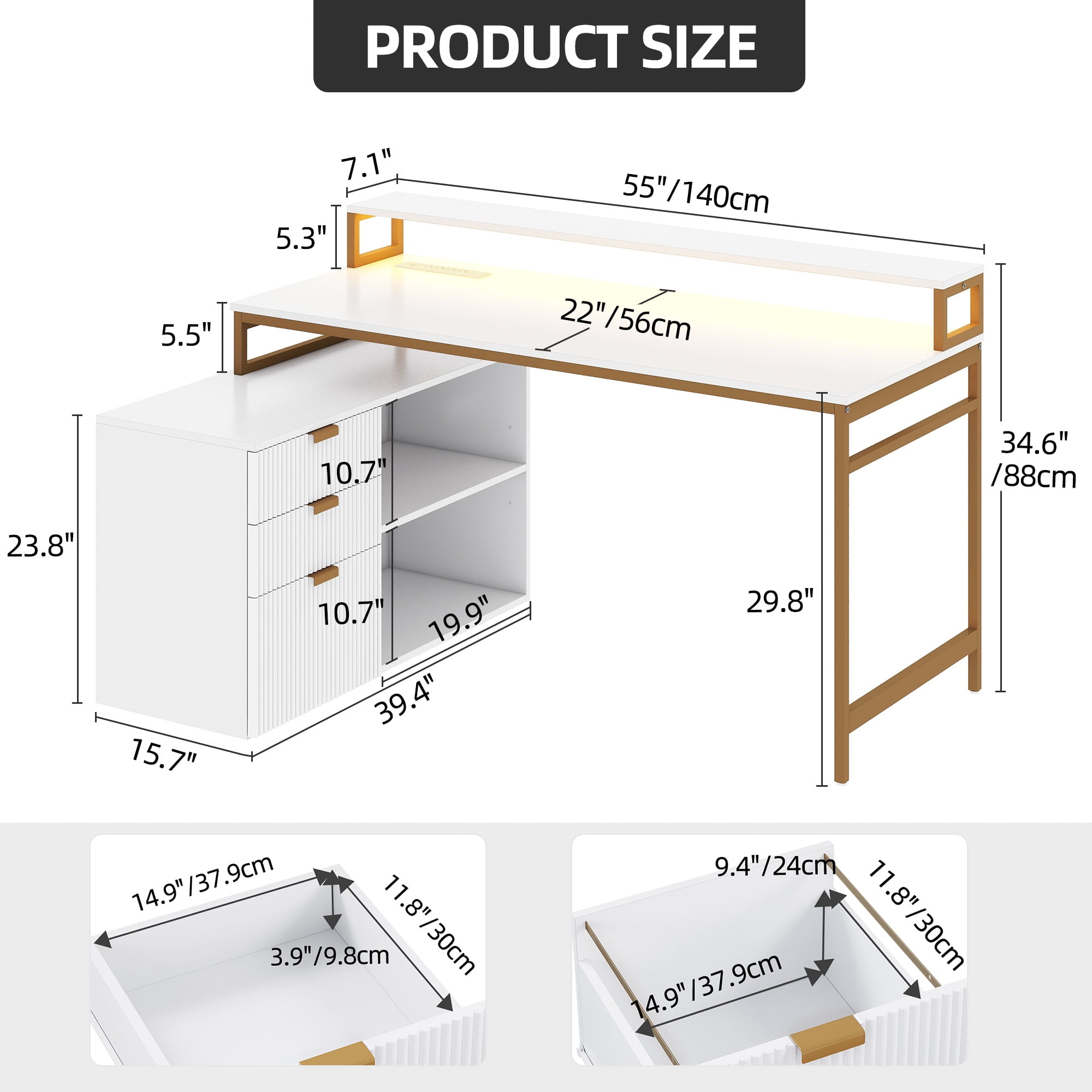 Optimize your corner space with a chic corner computer desk that includes a filing cabinet. This desk keeps you organized and powered with a built-in charging station offering 2 USB ports and 4 outlets. Set the mood with RGB LED lights for a warm, sophisticated glow. The monitor stand elevates your screen for better posture and less strain. A gold metal base ensures stability and adds a touch of elegance. This L-shaped desk is a practical and stylish choice to boost productivity and workspace aesthetics. Product information: Shape: L-Shape Desk design: Computer Desk Product Dimensions: 39″D x 55.1″W x 34.64″H Color: White+gold Style: Modern Base Material: Engineered Wood + Metal Top Material Type: Engineered Wood Special Feature: With Power Outlets & USB Outlets & LED Lights & Minitor Stand & File Drawer Room Type: Office, Living Room, Bedroom, Study Room Mounting Type: Floor Mount Product Weight: 102.51 Pounds Drawer Type: File Drawer Included Components: 1 x L Shaped Desk; 1 x Packet of Fittings; 1 x Instructions Manual; 3 x hooks; Age_group: Adult