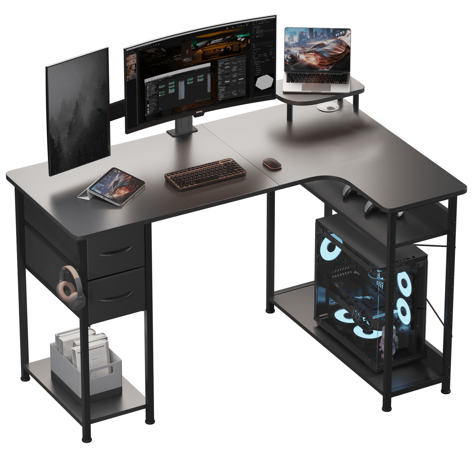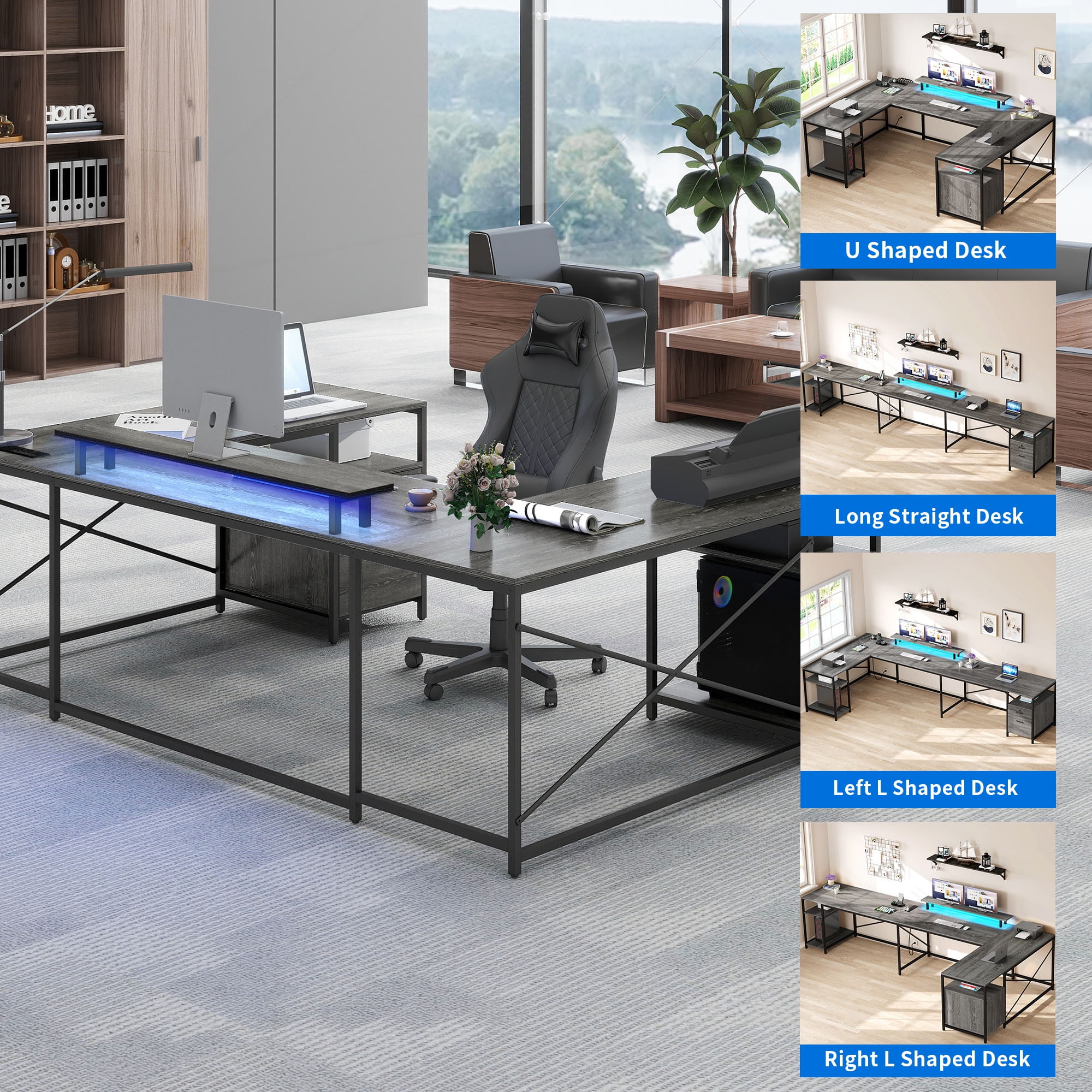 EFFORTLESS CHARGING: Power your devices with ease! Our U-shaped desk boasts 4 standard outlets, 2 USB ports, and a 6.56ft cord. Say goodbye to charging hassles for phones, laptops, and more. VIVID ILLUMINATION: Our U-shaped desk showcases a dynamic RGB LED strip. Easily customize colors via a mobile app or remote. Explore music sync and timer modes for an inspiring work atmosphere. ADAPTABLE WORKSPACE: A desk for all needs! Transform it to a 78.7″ U-shaped, 106.3″ L-shaped, or 133.9″ long desk. Ideal for bedrooms, offices, and more, serving as a office computer desk, gaming desk, study desk, writing desk, file cabinet, and printer stand. PRODUCTIVE & ORGANIZED: Our U-shaped desk provides 3 wide desktops with a monitor stand. It also offers a file drawer, small office supplies drawer, and open shelves for easy access to folders, magazines, and more. BUILT TO LAST: Crafted from robust steel and P2 MDF with a scratch-resistant finish, this desk stands up to daily use. 12 adjustable feet pads ensure stability on uneven floors. The rustic brown embossed texture adds style to your workspace. AGE GROUP: Adult