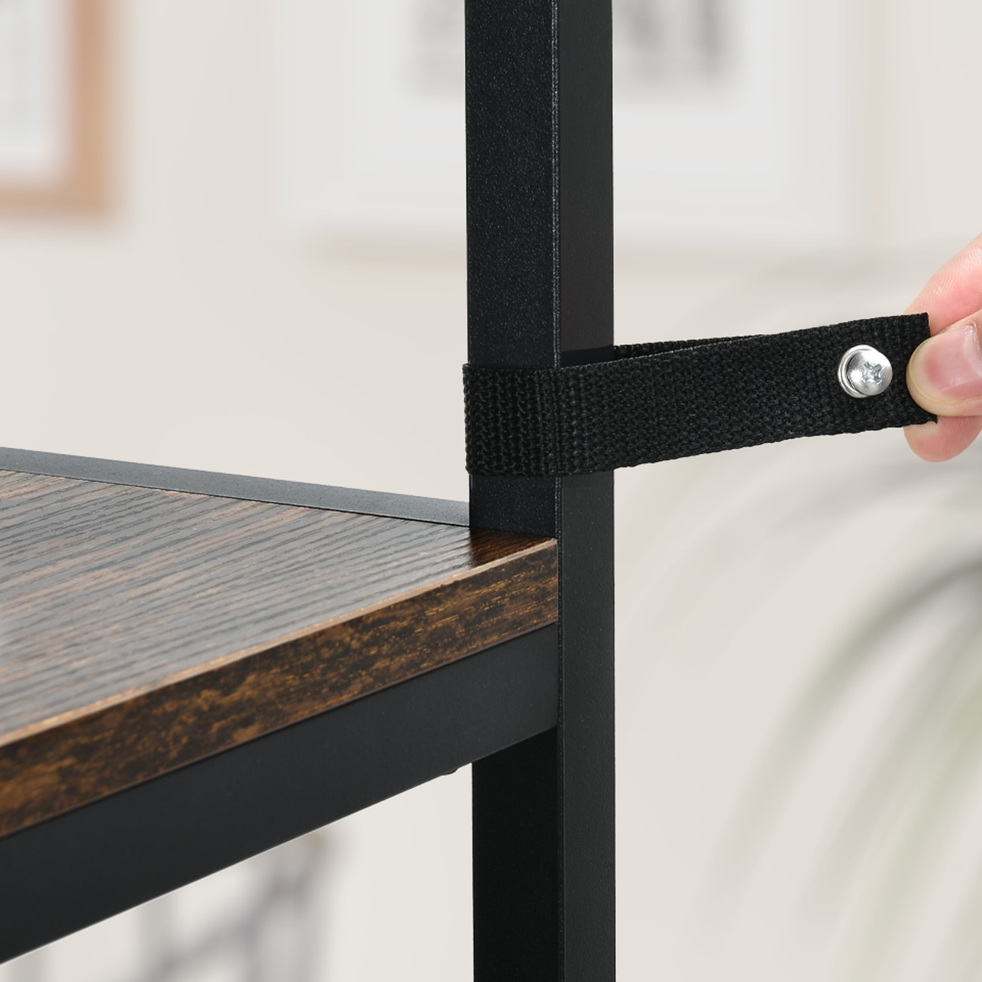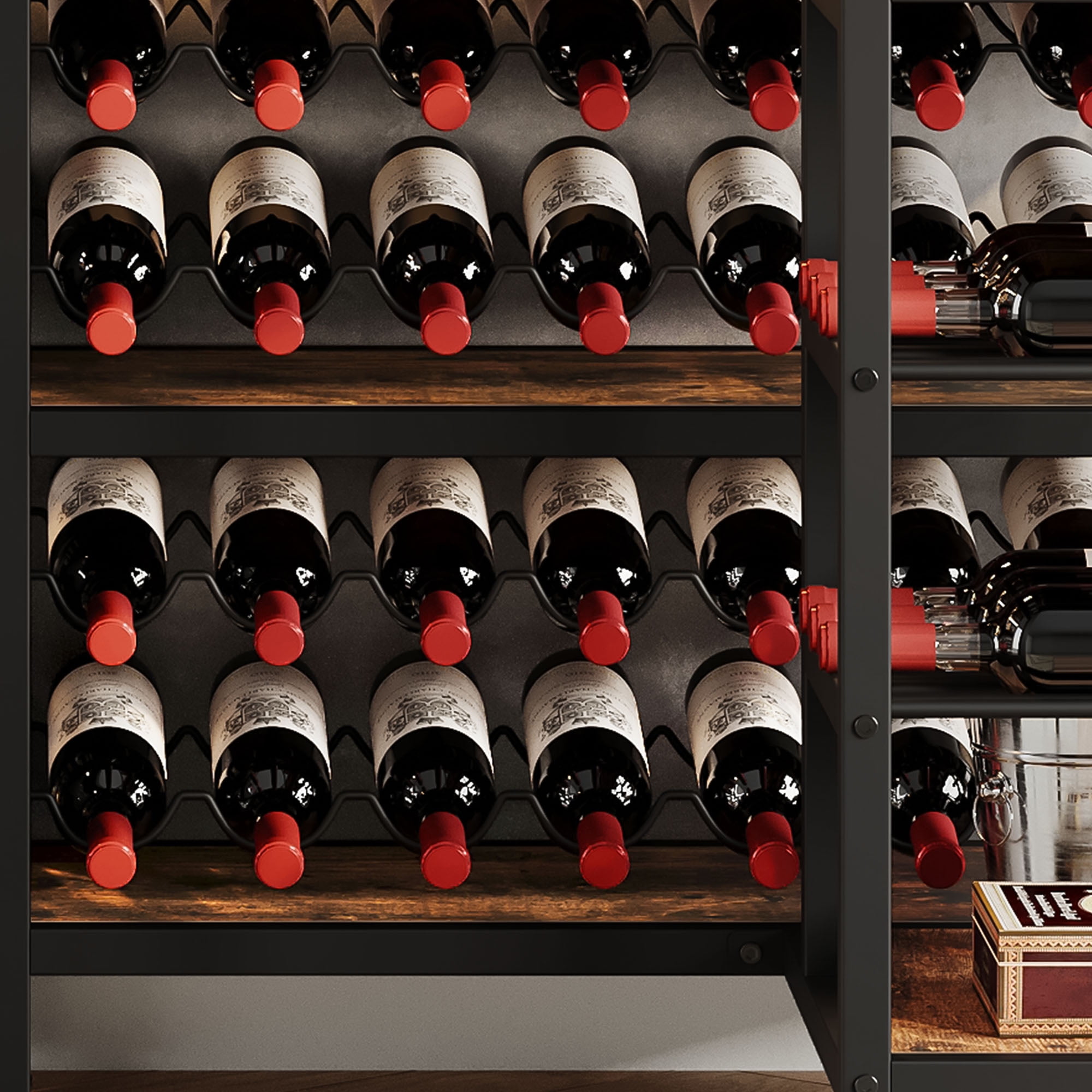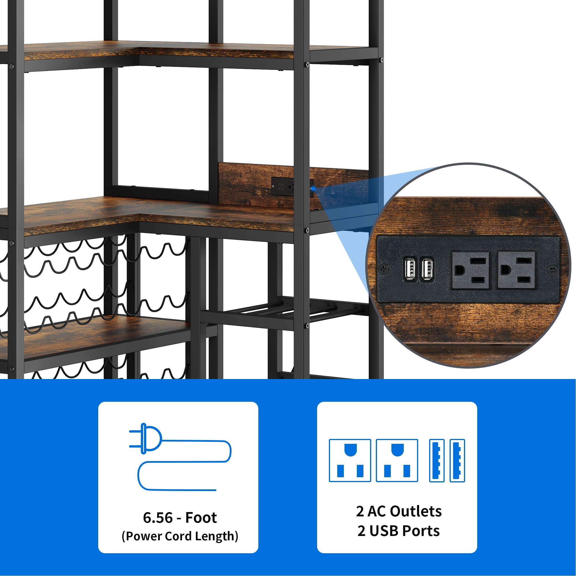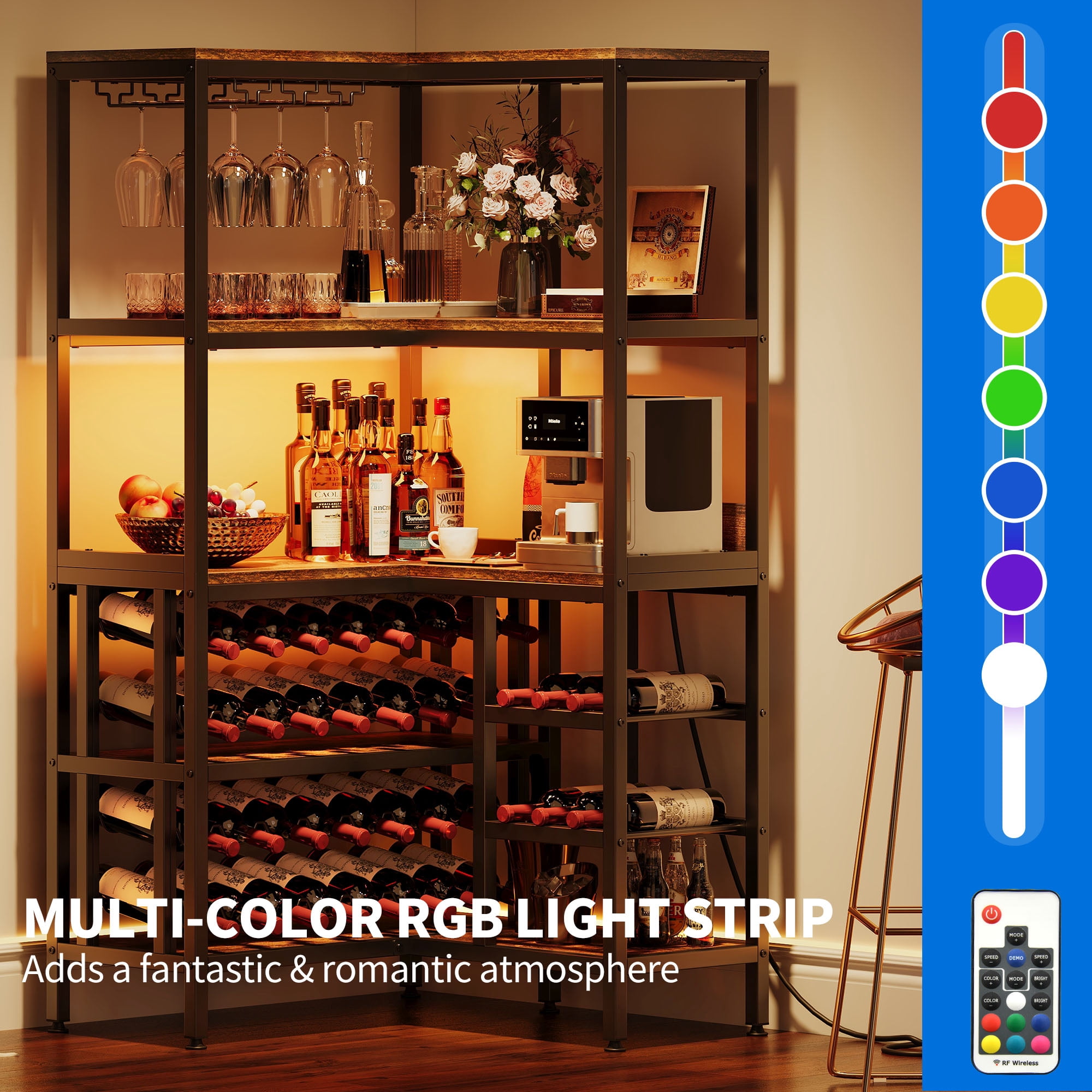 Spacious Wine Storage: This wine bar rack features a grid shelf that can comfortably hold up to 38 wine bottles, allowing you to store them horizontally and maintain their freshness until you’re ready to enjoy them. Additionally, the glass holder can accommodate up to 9 glasses, making it convenient and organized. Smart Corner Design: Make the most of unused corner spaces in your home with this corner wine rack. It efficiently utilizes minimal space while providing 5 tier shelves to store wine buckets, drinks, trays, dishes, condiments, and other kitchen supplies, keeping everything within reach and neatly organized. Industrial Rustic Charm: The black painted metal frame of this wine rack exudes a timeless vintage style. Its versatile design complements any home decor, blending seamlessly with various furniture styles. Whether placed in the kitchen, living room, front door, or basement, this standing wine rack adds a chic touch to your space. It also makes a perfect gift for housewarmings, weddings, birthdays, and more. Dynamic LED Lighting: Our corner Wine Rack features a stunning multi-color RGB LED light strip that can be easily controlled via a phone app or remote. The vibrant light colors change and flash in sync with the rhythm of your music, creating a captivating atmosphere in any room. Easy Assembly and Support: Assembly is a breeze with clear picture instructions and well-marked parts. If you have any questions during the assembly process, don’t hesitate to contact us. We are dedicated to ensuring your satisfaction and will provide prompt assistance to resolve any issues you may encounter.