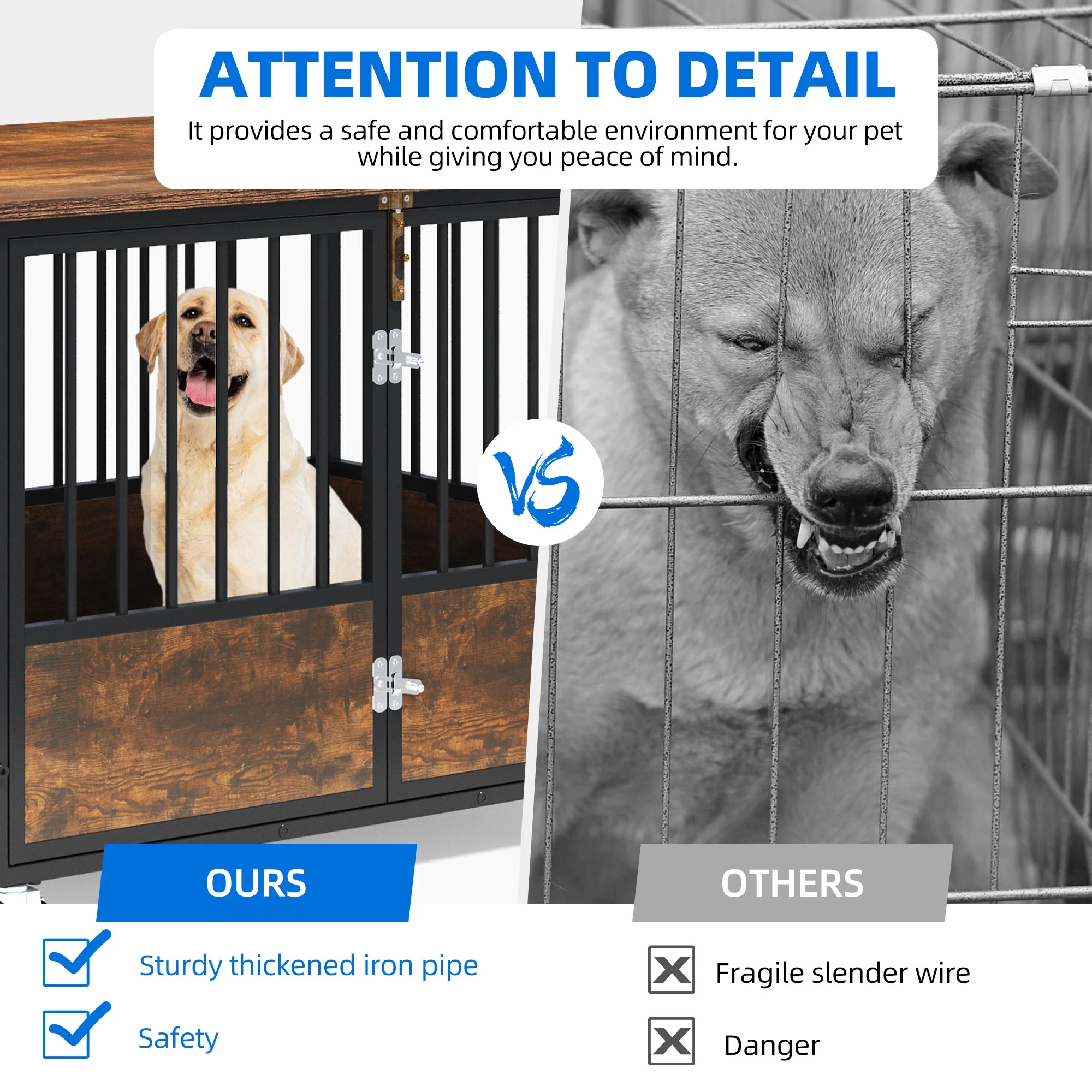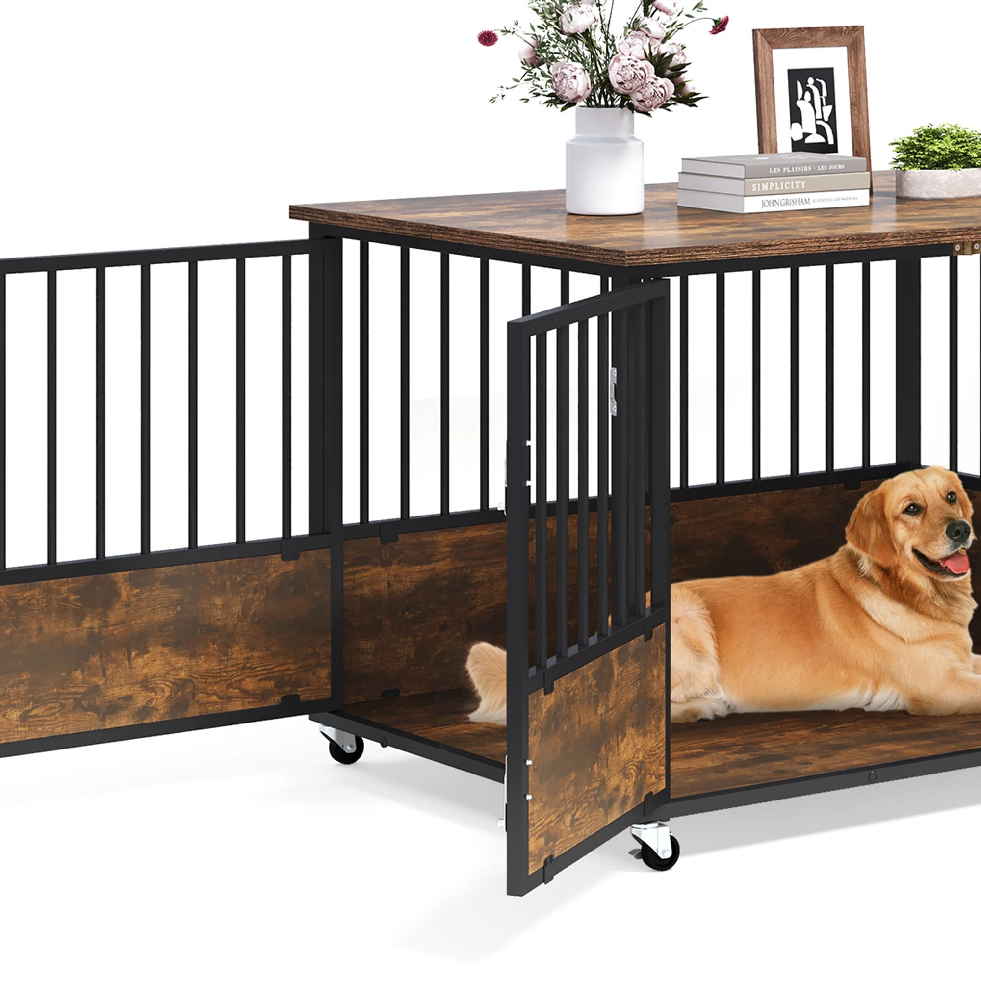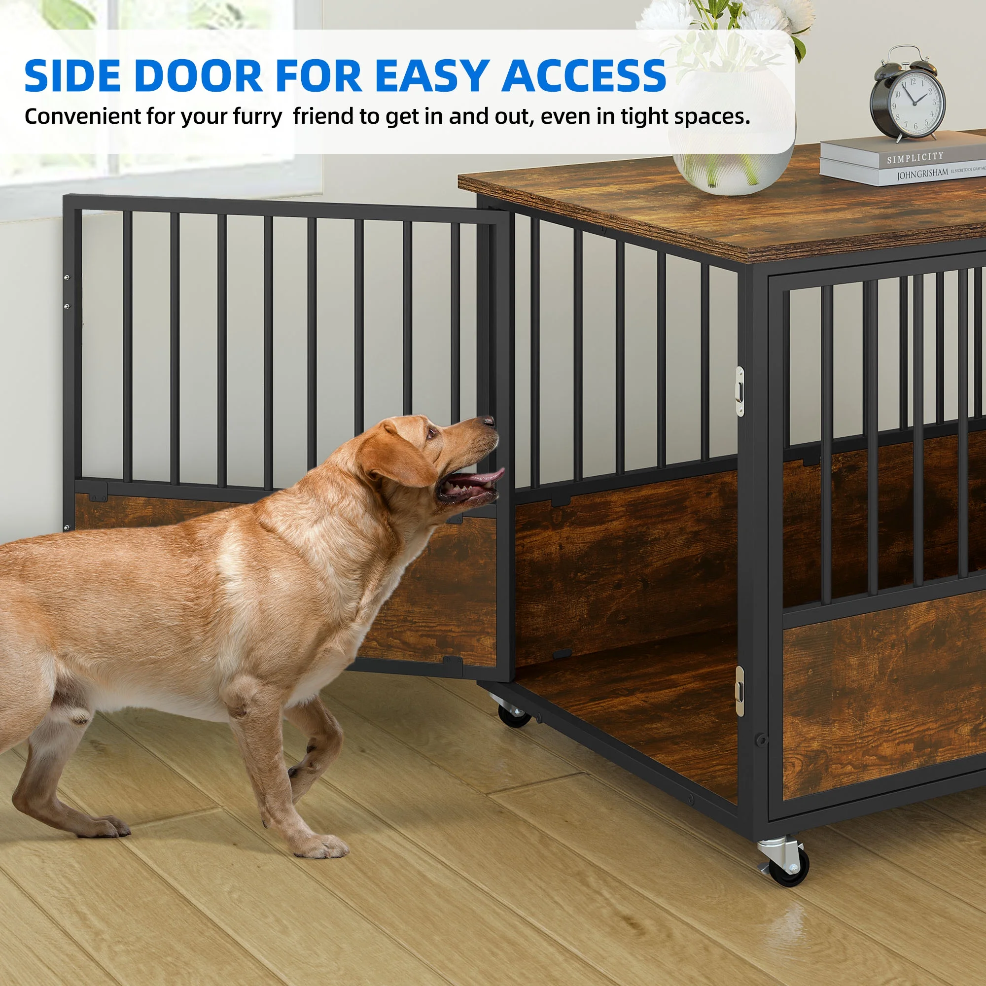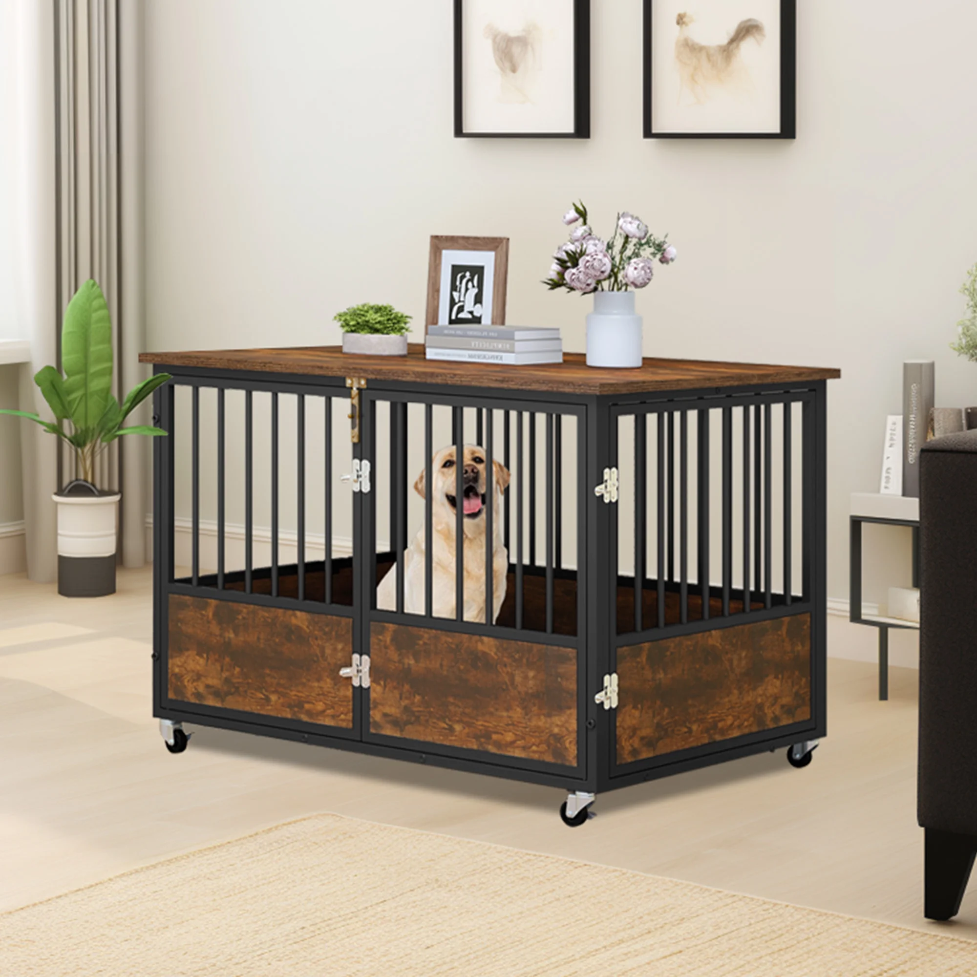 Versatile Pet Oasis: Experience the ultimate in pet comfort and functionality with our multi-purpose dog haven. This secure crate is designed to accommodate small, medium, and large dogs, offering a safe and cozy space while doubling as an elegant end table or bedside cabinet. Add a touch of charm to your living space by adorning it with delightful decorations. Versatile Pet Oasis: Experience the ultimate in pet comfort and functionality with our multi-purpose dog haven. This secure crate is designed to accommodate small, medium, and large dogs, offering a safe and cozy space while doubling as an elegant end table or bedside cabinet. Add a touch of charm to your living space by adorning it with delightful decorations. Robust and Reliable Construction: Our metal dog crate is built to withstand the test of time. The 0.6-inch diameter corrosion-resistant steel tube design sets it apart from traditional wire cages, providing superior strength and durability. Even for strong, powerful, or aggressive dogs, this heavy-duty crate offers unparalleled sturdiness. The multi-layered protective non-toxic coating ensures the well-being of your dog, even if they bite or lick the cage frame. Robust and Reliable Construction: Our metal dog crate is built to withstand the test of time. The 0.6-inch diameter corrosion-resistant steel tube design sets it apart from traditional wire cages, providing superior strength and durability. Even for strong, powerful, or aggressive dogs, this heavy-duty crate offers unparalleled sturdiness. The multi-layered protective non-toxic coating ensures the well-being of your dog, even if they bite or lick the cage frame. Enhanced Durability and Easy Maintenance: The wide and sturdy top panel of our dog kennel end table can support up to 200 lbs, making it a reliable surface for various uses. Not only does it protect your dog from potential injuries, but the smooth surfaces also make cleaning the dog house a breeze. Spend more quality time with your furry friend and less time on maintenance. Enhanced Durability and Easy Maintenance: The wide and sturdy top panel of our dog kennel end table can support up to 200 lbs, making it a reliable surface for various uses. Not only does it protect your dog from potential injuries, but the smooth surfaces also make cleaning the dog house a breeze. Spend more quality time with your furry friend and less time on maintenance. Convenient Double Door Design: Our dog haven features both a front door and a side door, catering to every situation. The front door allows for easy entry and exit for your pets, while the side door can be opened even in limited spaces. Customize the orientation of the side door according to your needs, ensuring maximum convenience. 360° Lockable Wheels: Effortlessly move our dog haven throughout your home with the built-in 360° wheels. Enjoy the flexibility to place it wherever you desire, catering to your preferences and needs. The wheels come with locks to securely hold the dog crate in place, providing stability and peace of mind. Convenient Double Door Design: Our dog haven features both a front door and a side door, catering to every situation. The front door allows for easy entry and exit for your pets, while the side door can be opened even in limited spaces. Customize the orientation of the side door according to your needs, ensuring maximum convenience. 360° Lockable Wheels: Effortlessly move our dog haven throughout your home with the built-in 360° wheels. Enjoy the flexibility to place it wherever you desire, catering to your preferences and needs. The wheels come with locks to securely hold the dog crate in place, providing stability and peace of mind.