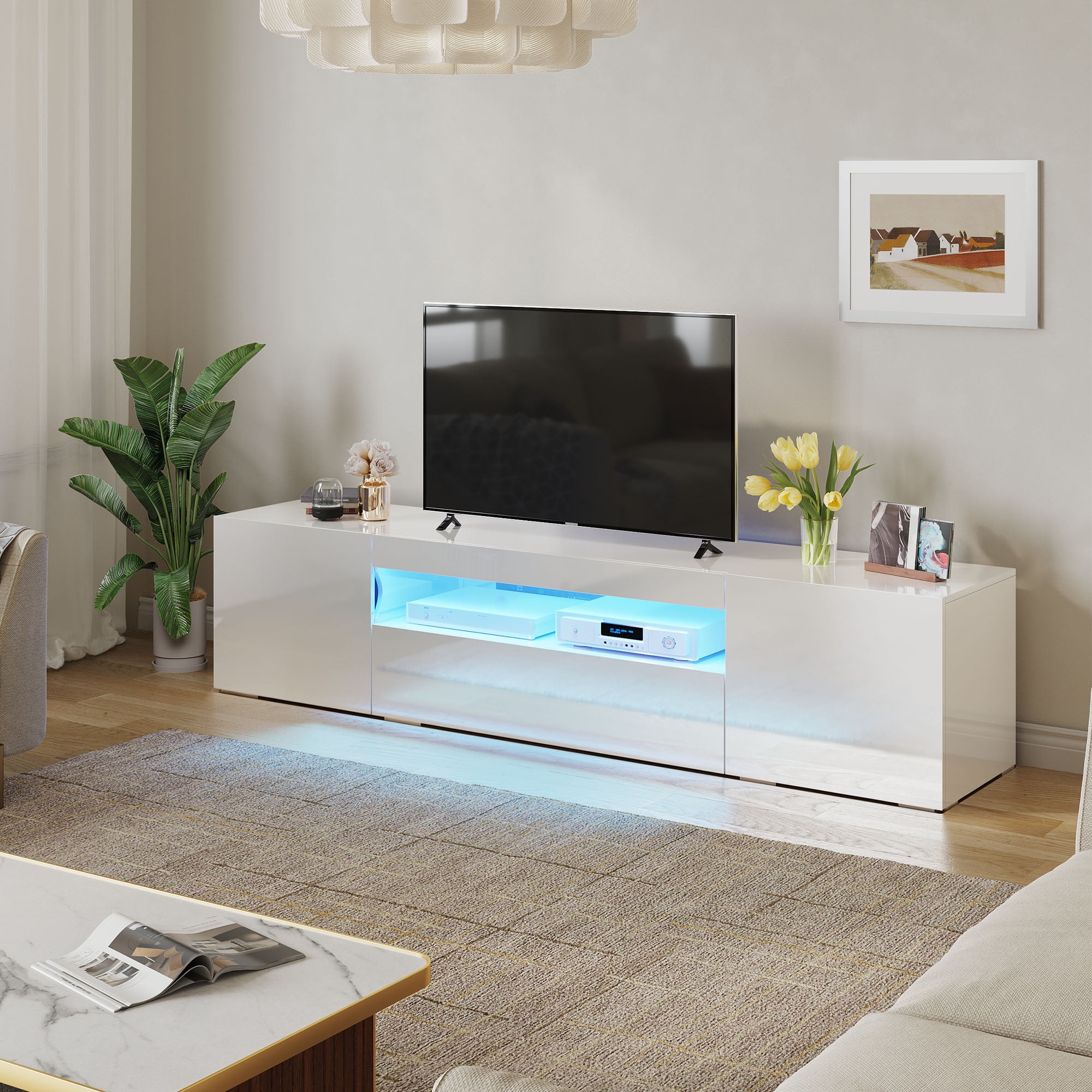 Dextrus Large LED TV stand for 75 inch TVs White High Glossy Media Center with 2 Cabinets and 1 Drawer for Living Room, 70″