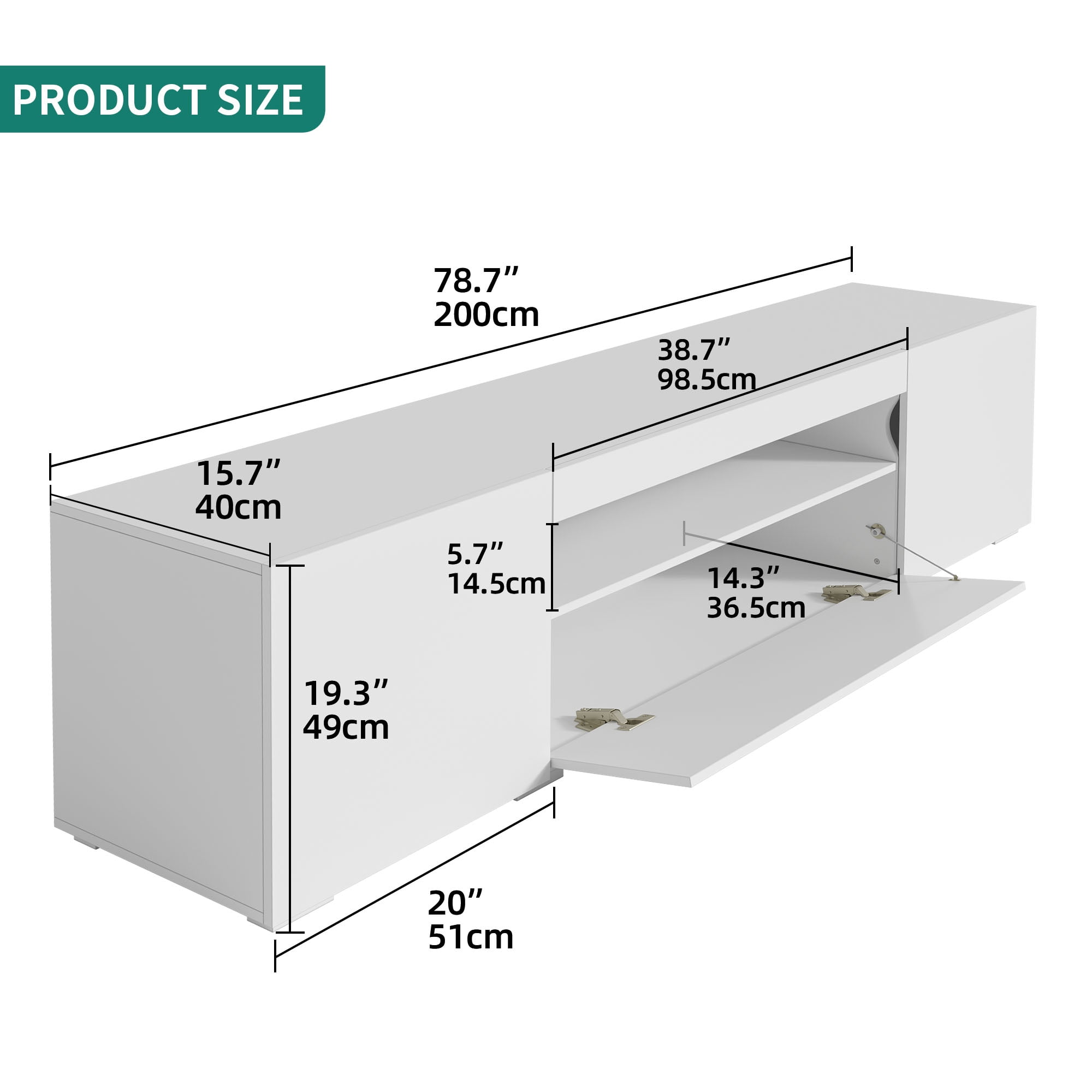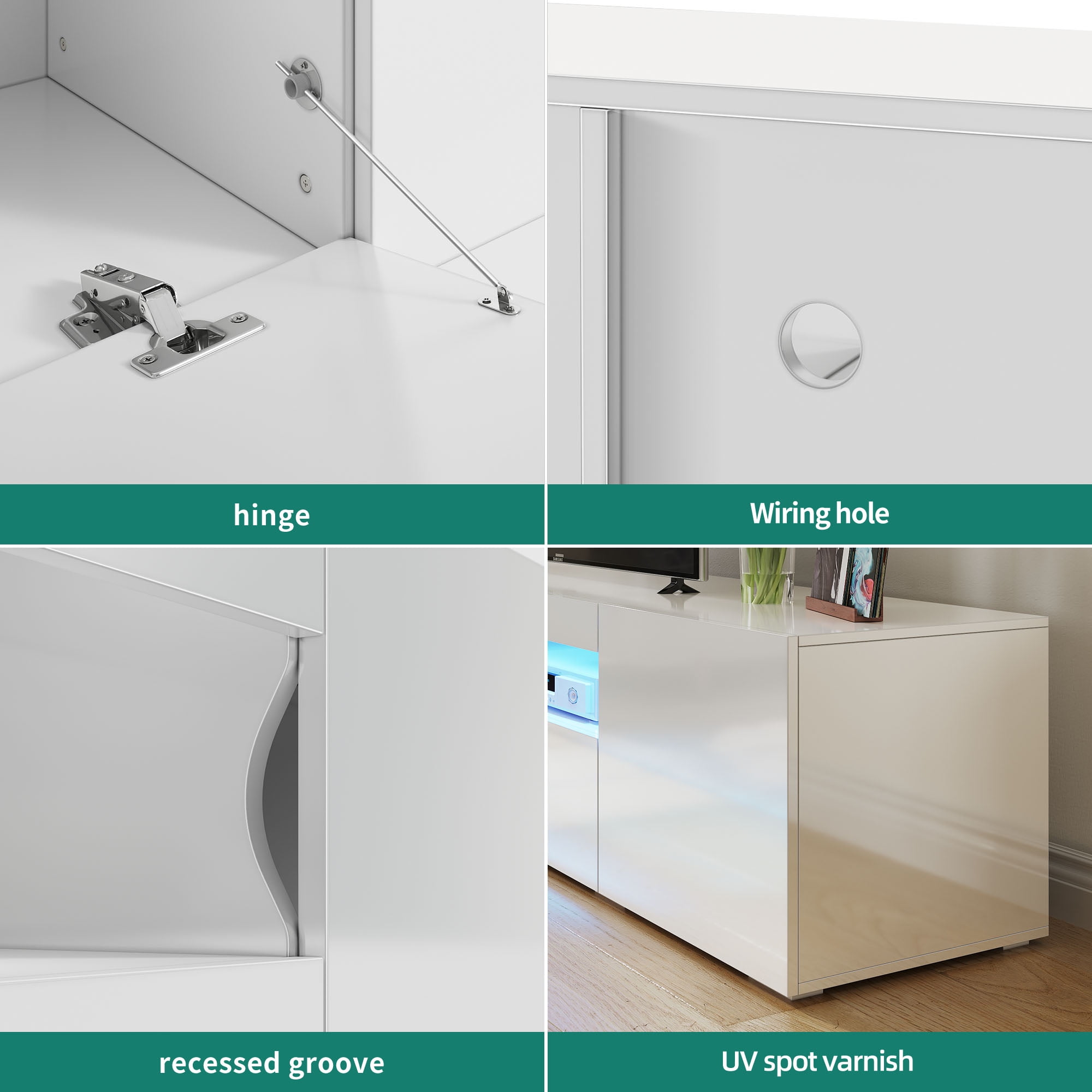 16 Colors LED Lights:This LED TV cabinets comes with a LED stripe and which could change 16 colors Large Storage:2 cabinets with 1 drawer and open shelves which could provide sufficient storage Durable Materials: Dextrus LED TV Stands is made of E1 MDF board which could bear 300 lbs High Glossy Surface:The surface of drawer cabinets as well as top are high glossy made Customer Service: if there are any problem with products, please feel free to contact with us