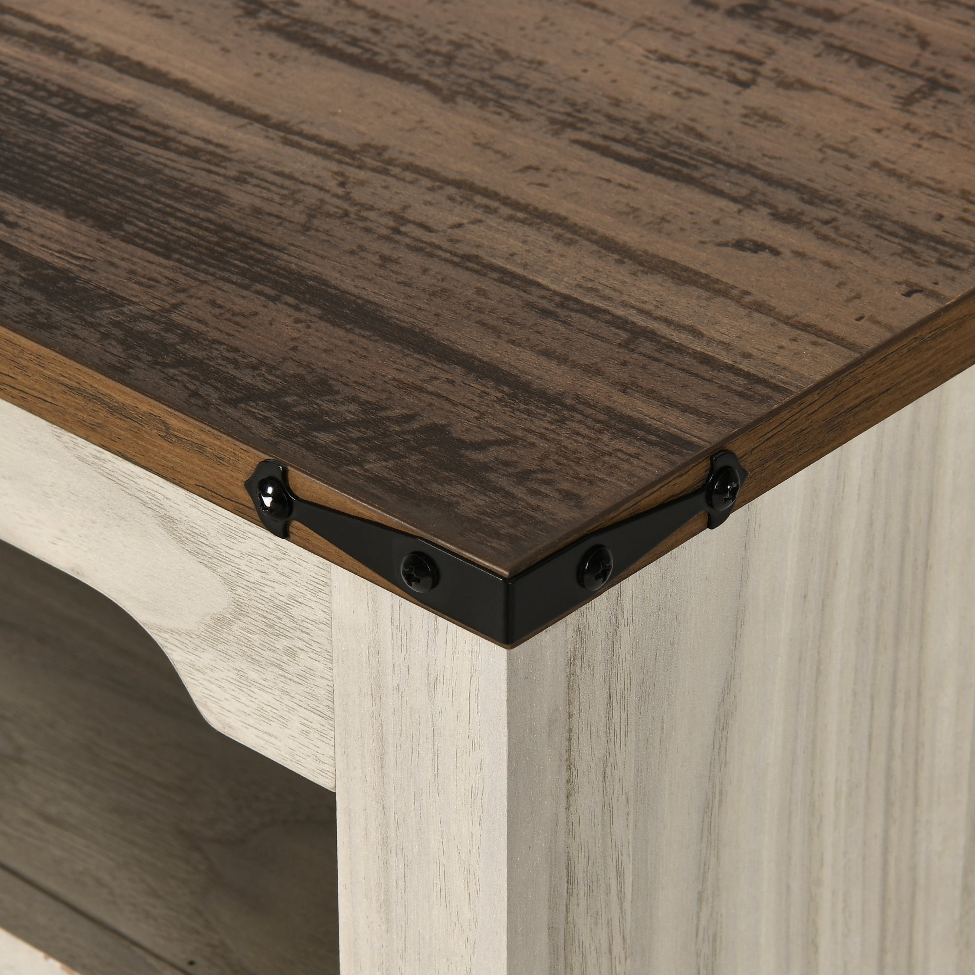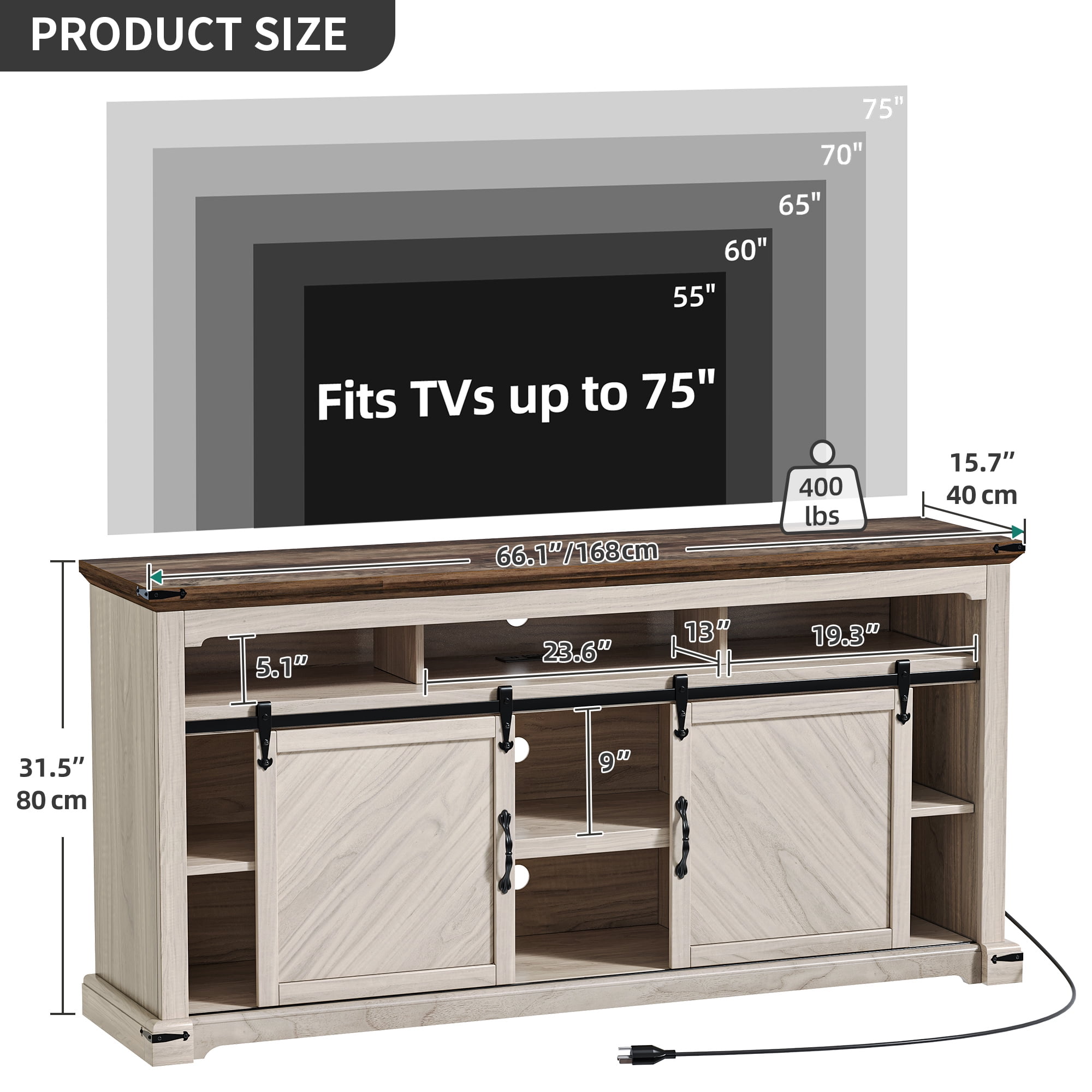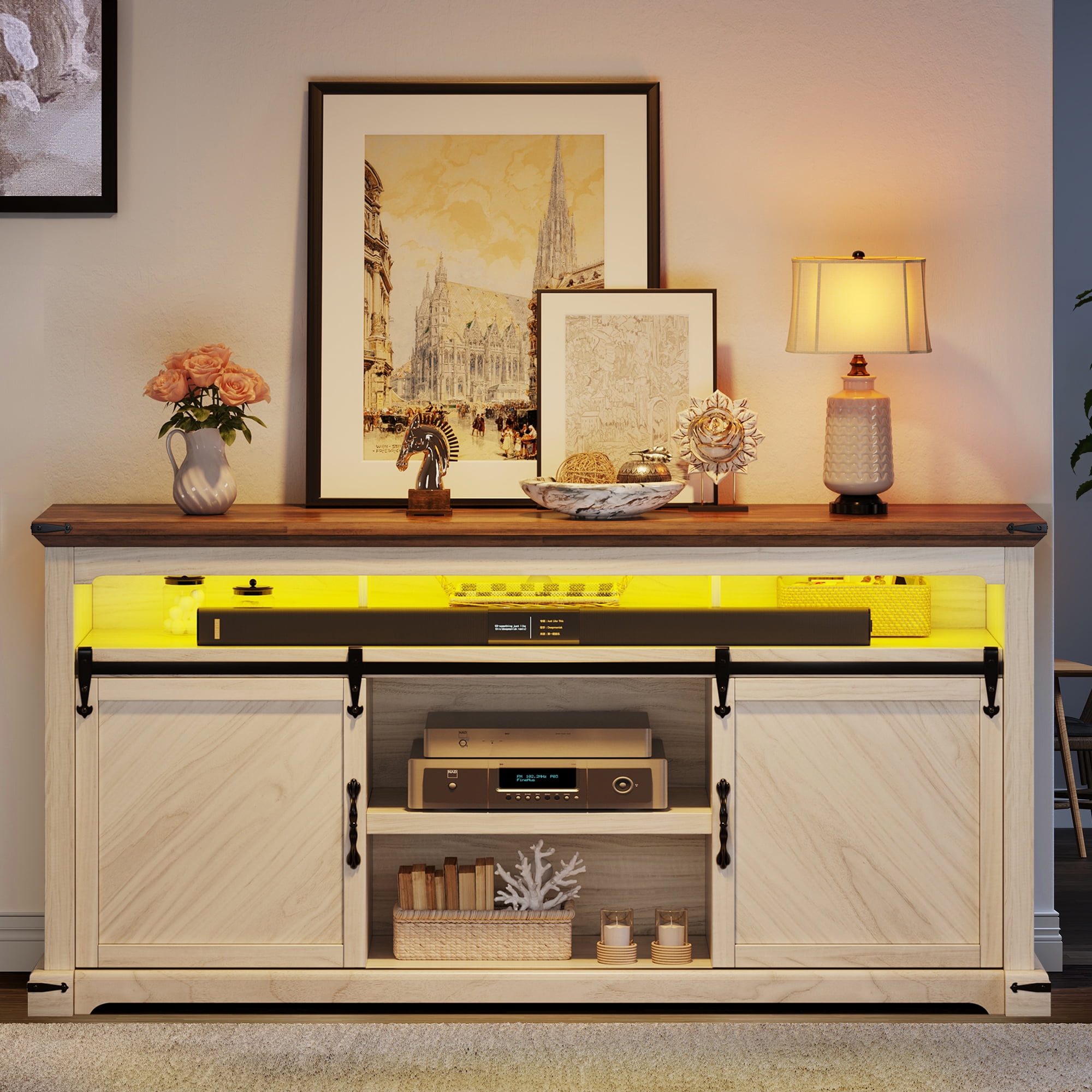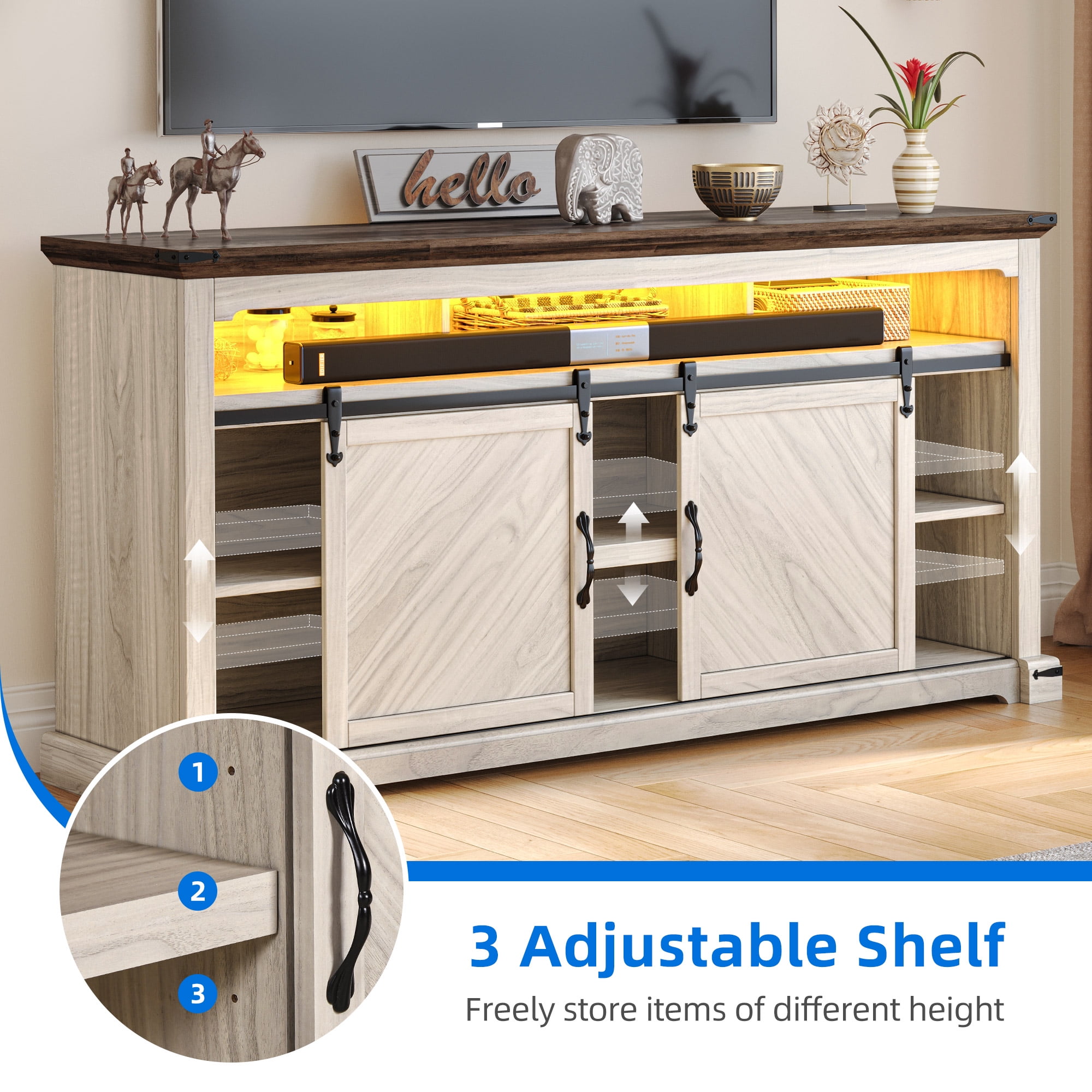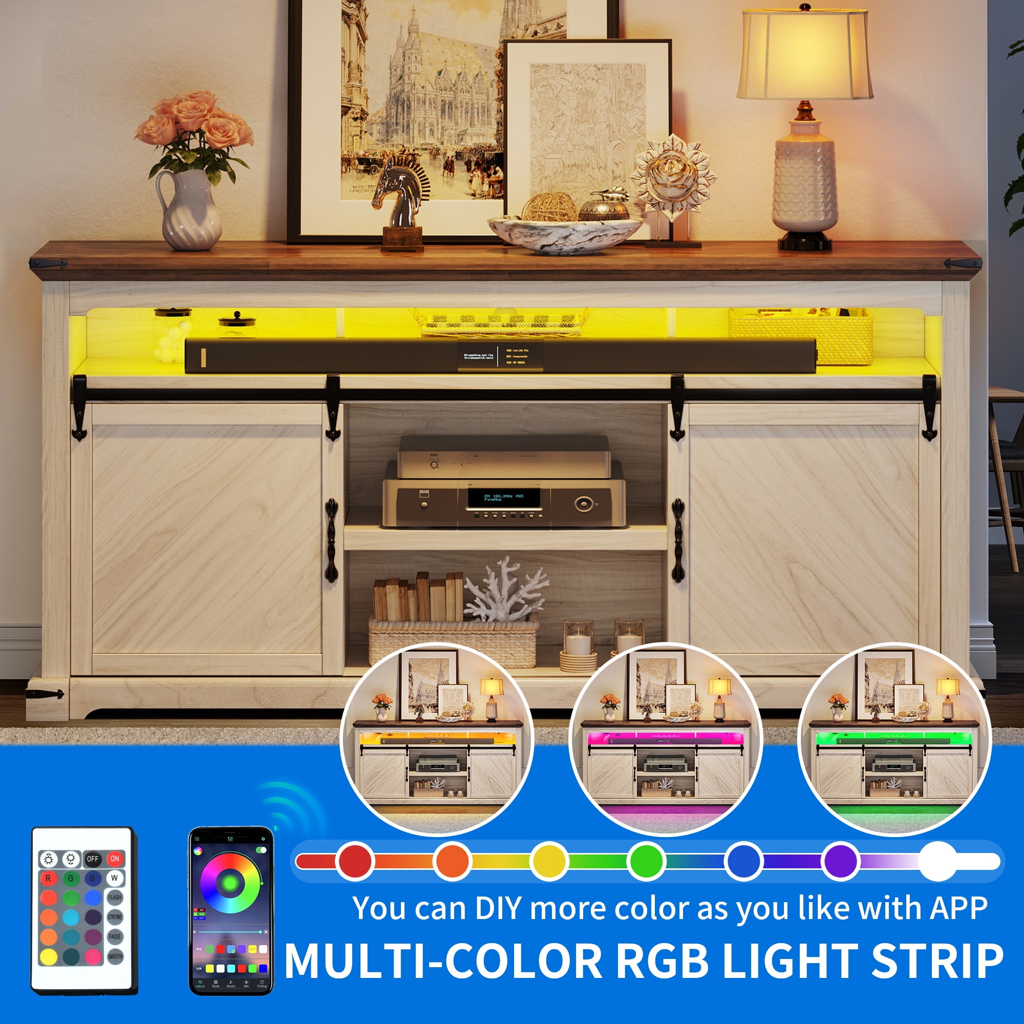 Dextrus LED Farmhouse TV Stand for TV up to 75 Inch w/Outlets, Entertainment Center Cabinet w/Sliding Door, Antique White
