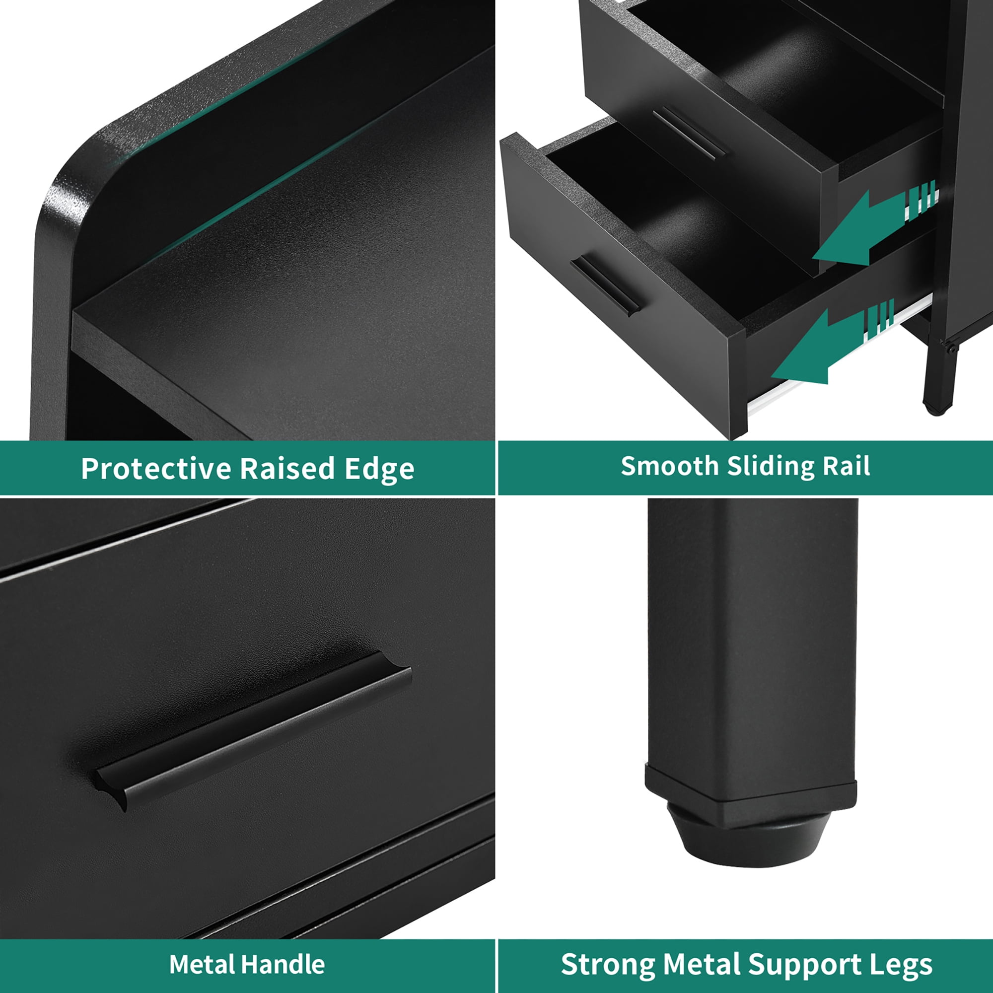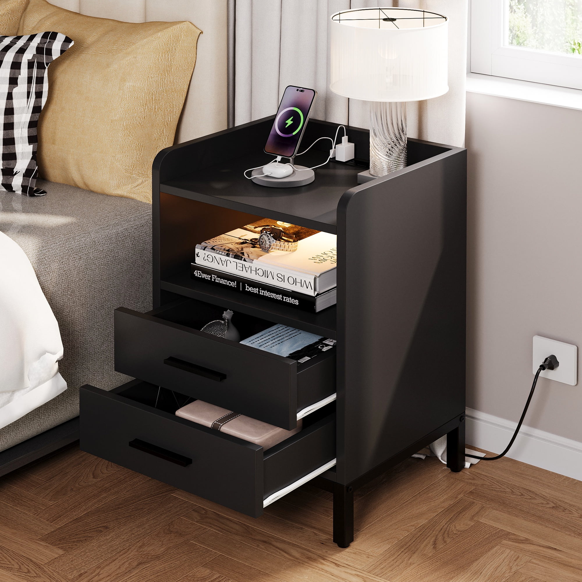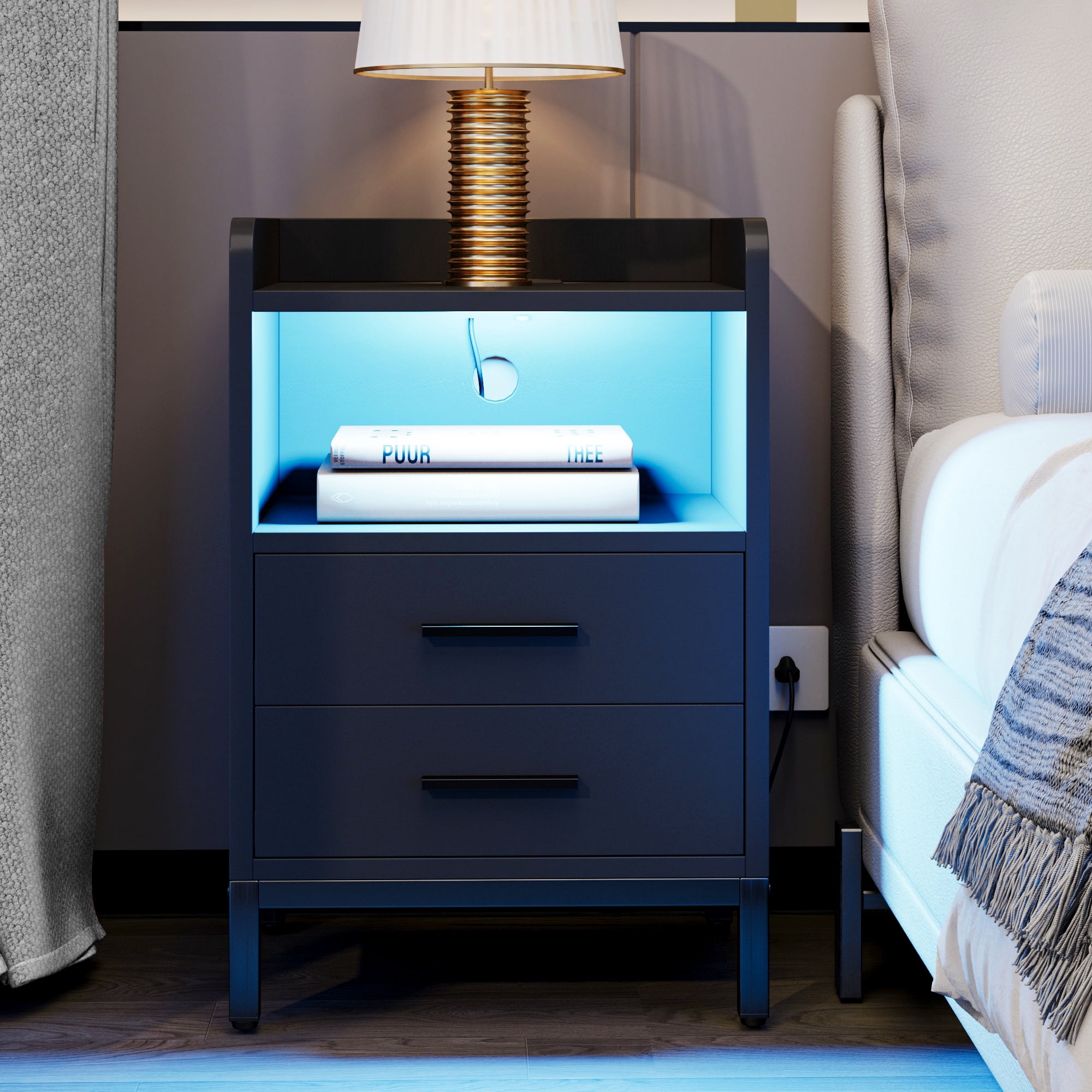 Dextrus LED Nightstand with Charging Station, Modern Bedside End Table with Drawers and Shelf, Black